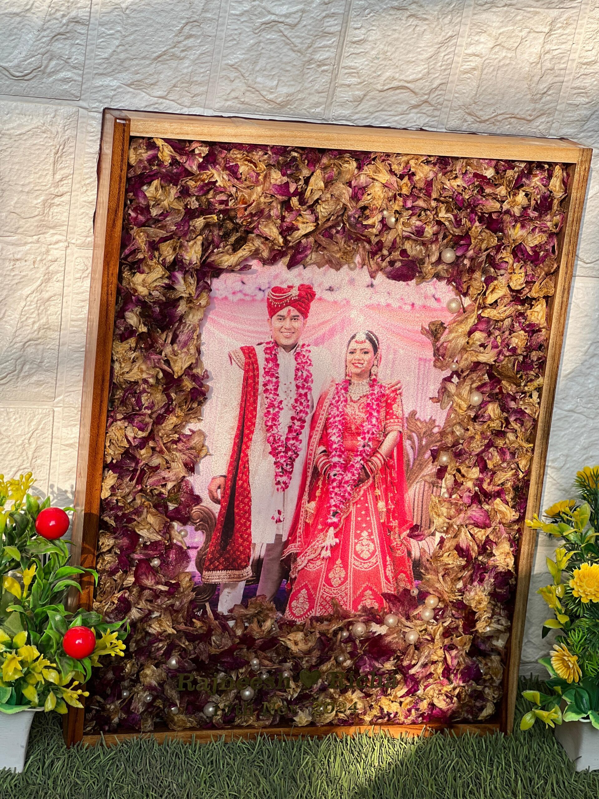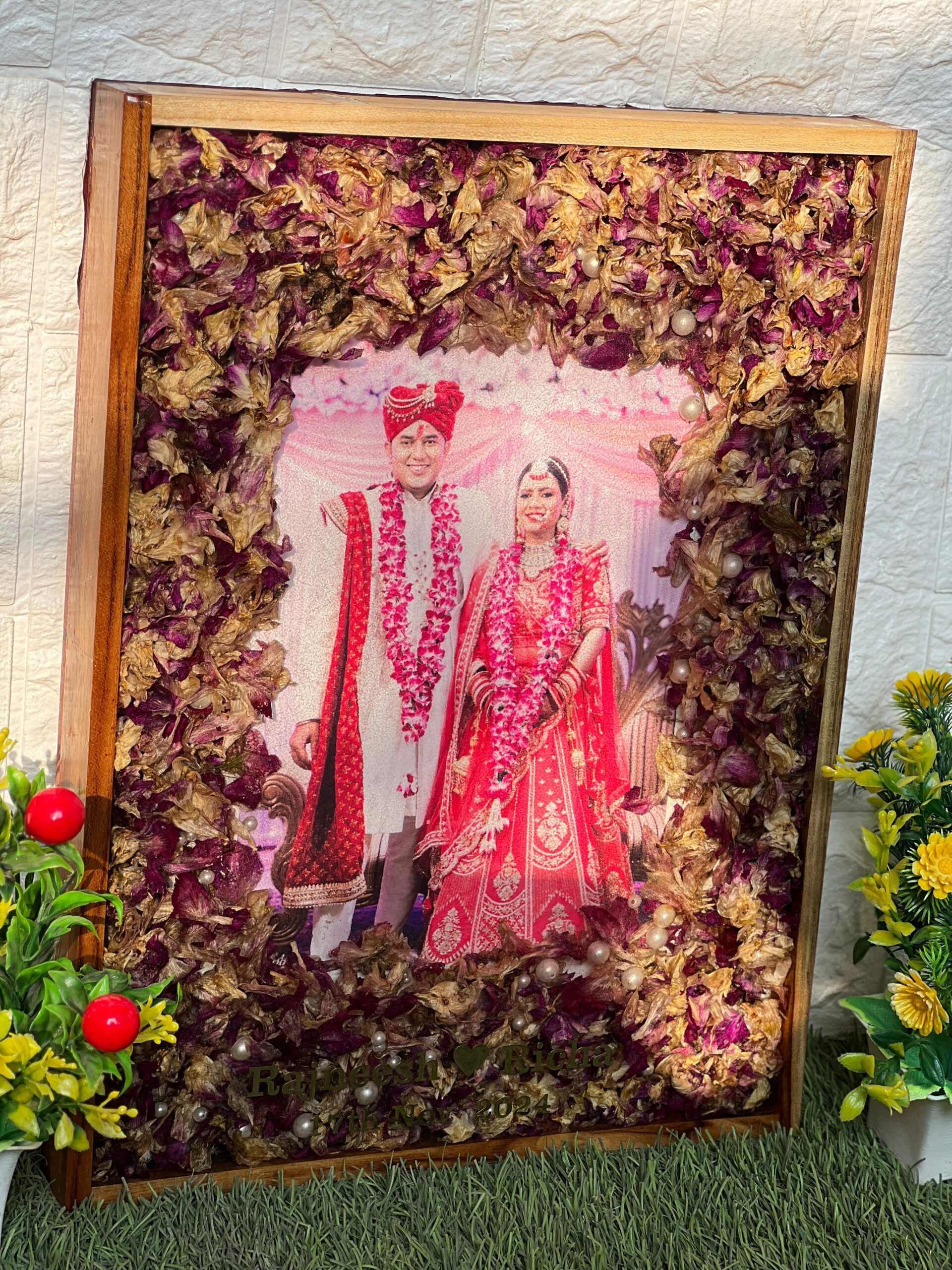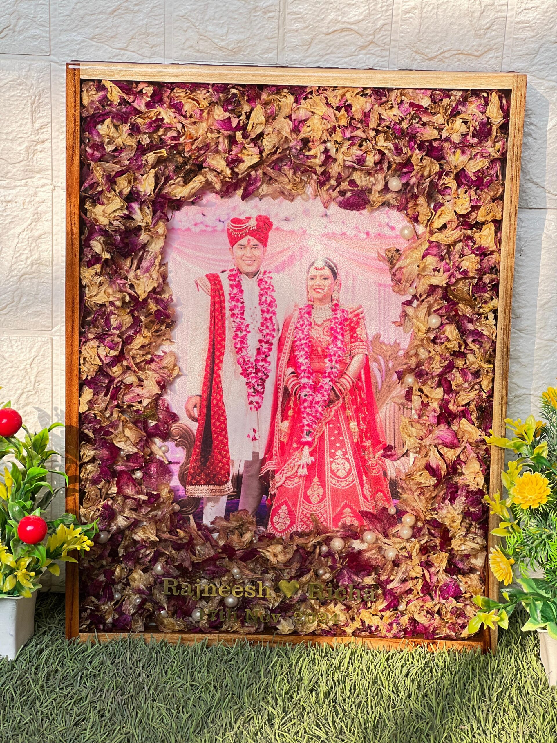 It is fully handmade and can be customized with your photo, flowers, and name. The wedding memory resin frame is available in different sizes and comes with a wooden border for a rich look.