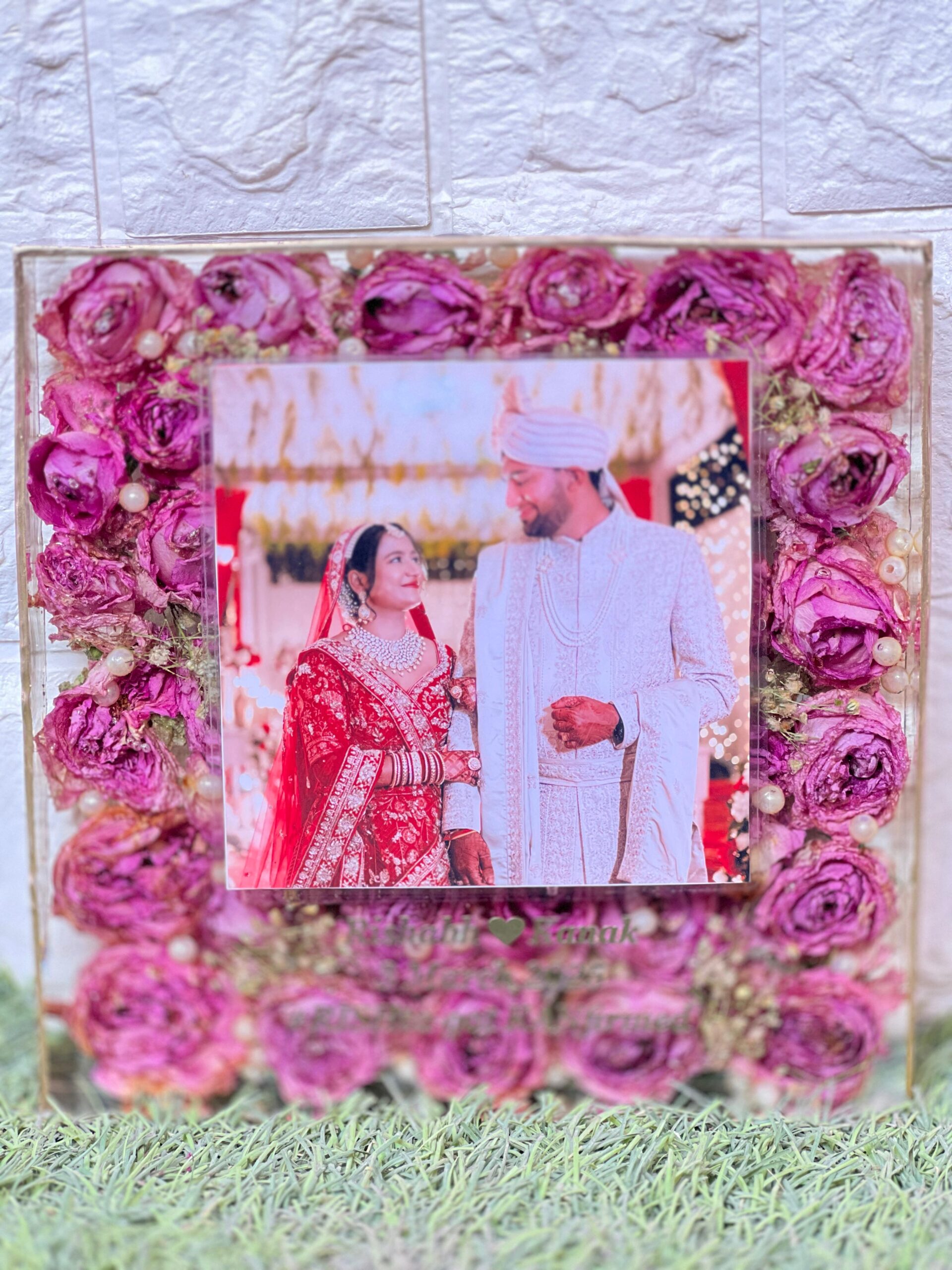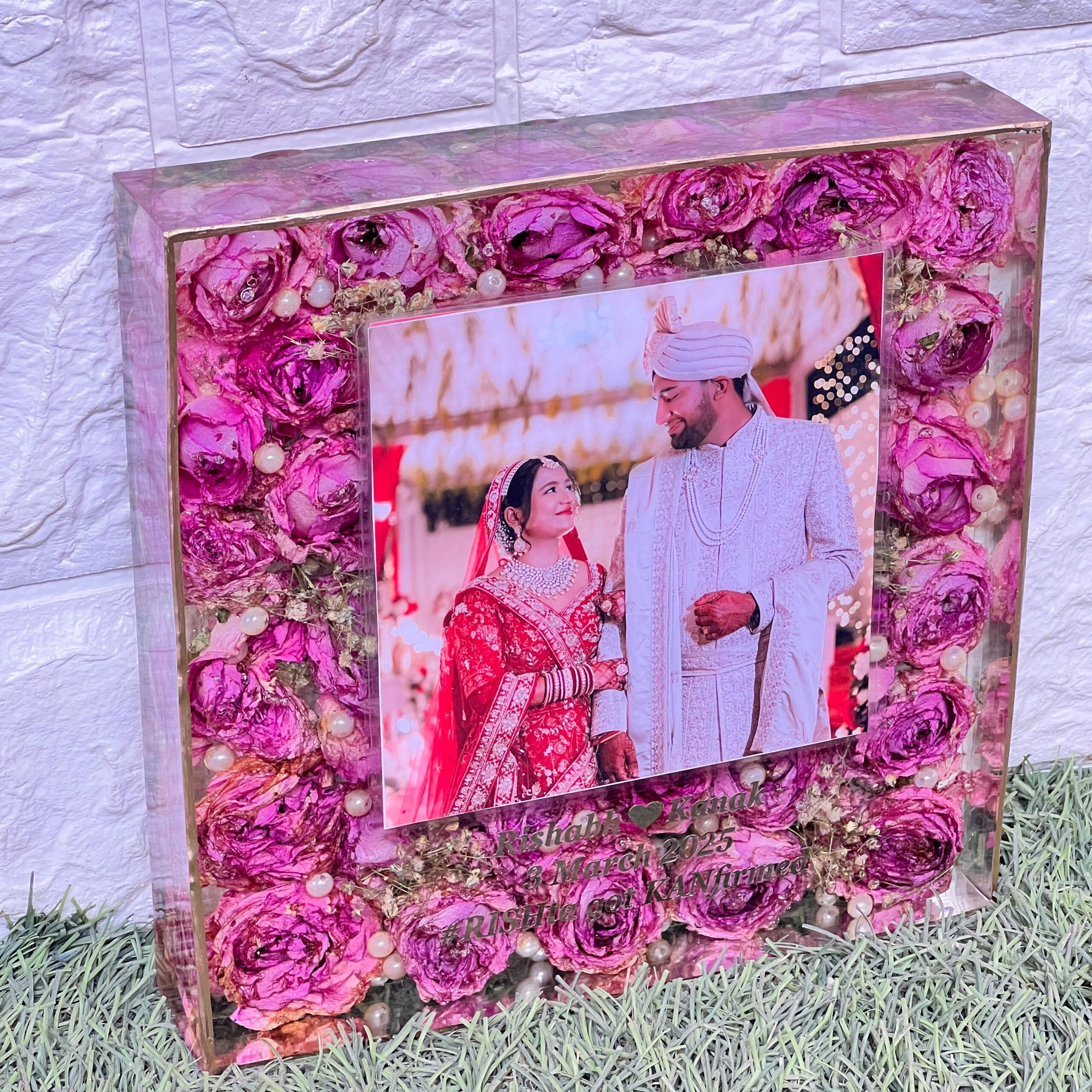 Celebrate your special day forever with this Preserved Wedding Varmala Resin Frame. Made using clear epoxy resin, this square frame includes your wedding varmala, dry flowers, pearls, and your couple photo – all sealed with love. The border is filled with preserved pink roses and pearls, giving it a royal and romantic look.