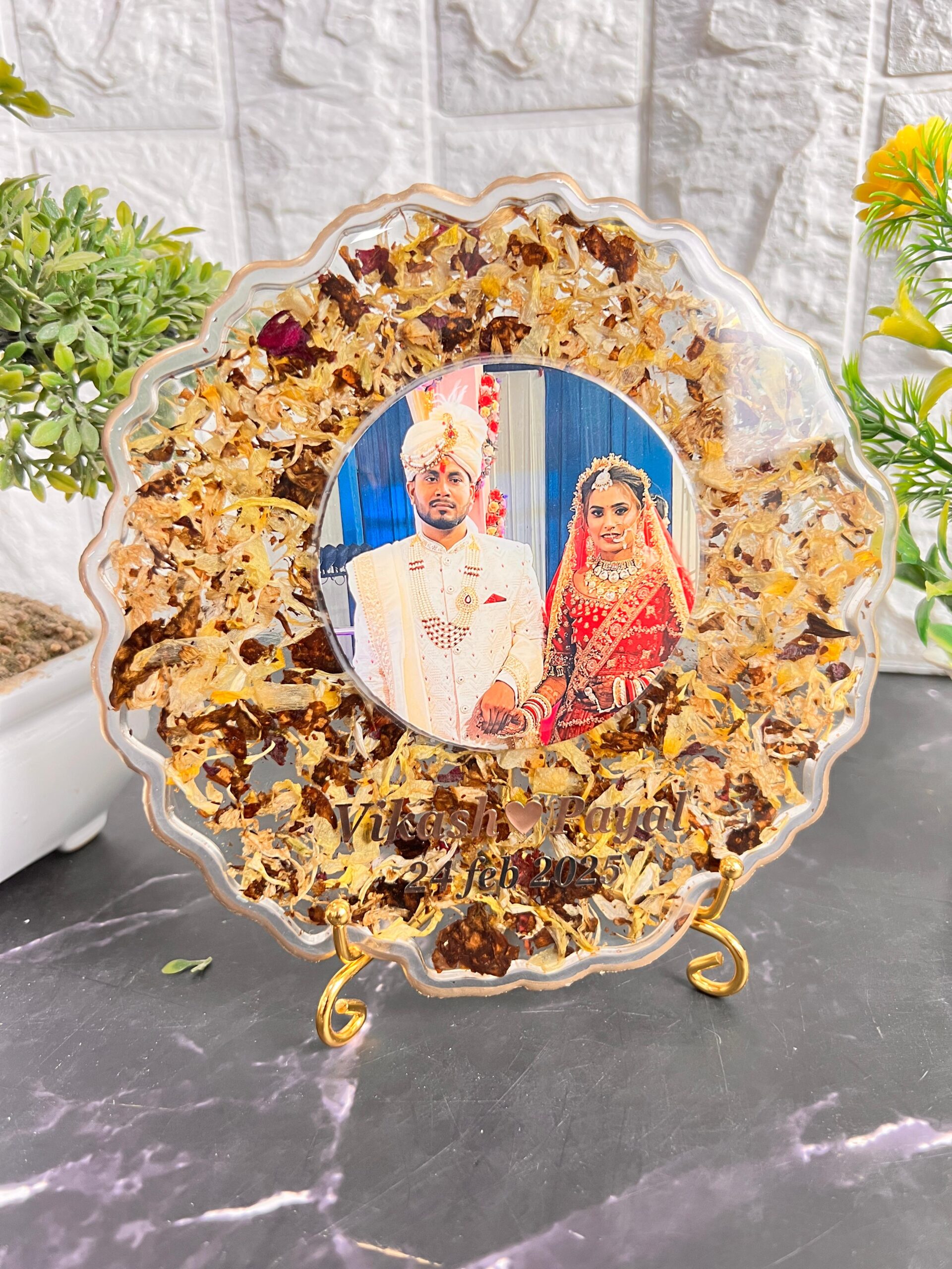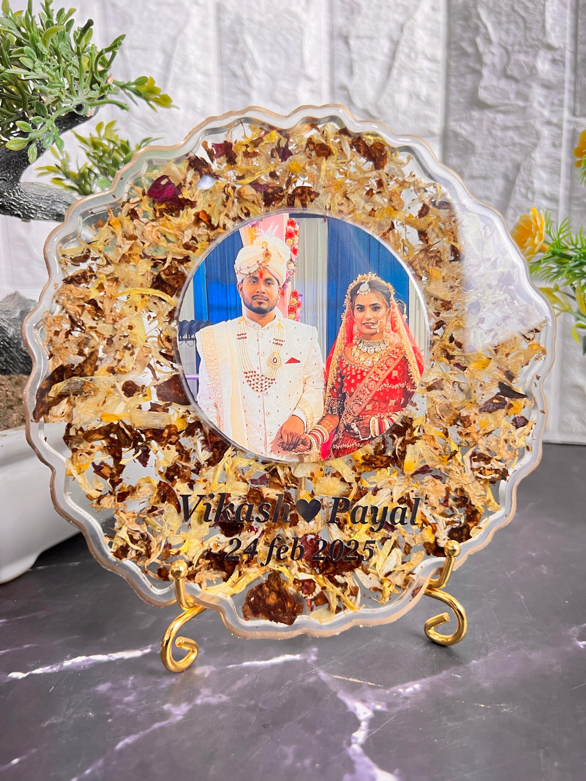 Each frame is carefully made with clear glossy resin, real dried flowers, and gold flakes, giving it an elegant and rich look. In the center, your wedding photo is preserved forever, along with your name and wedding date — making it a perfect personalized wedding gift or anniversary keepsake.