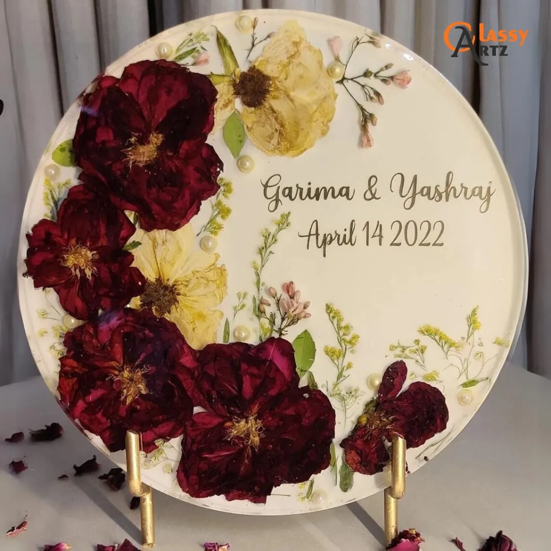 This round resin frame features your real varmala flowers beautifully preserved with red and white blossoms, paired with shiny pearls for a rich, elegant look.