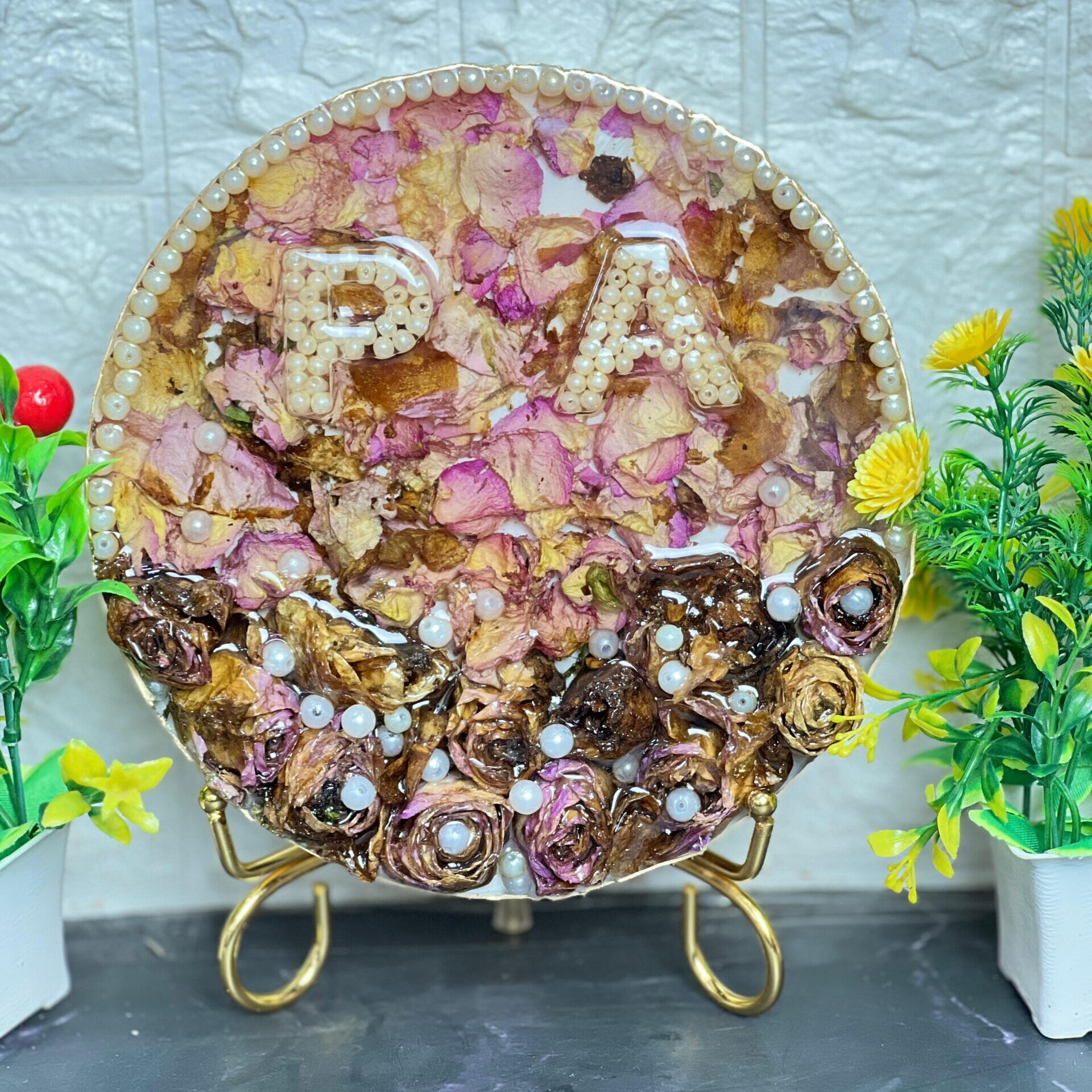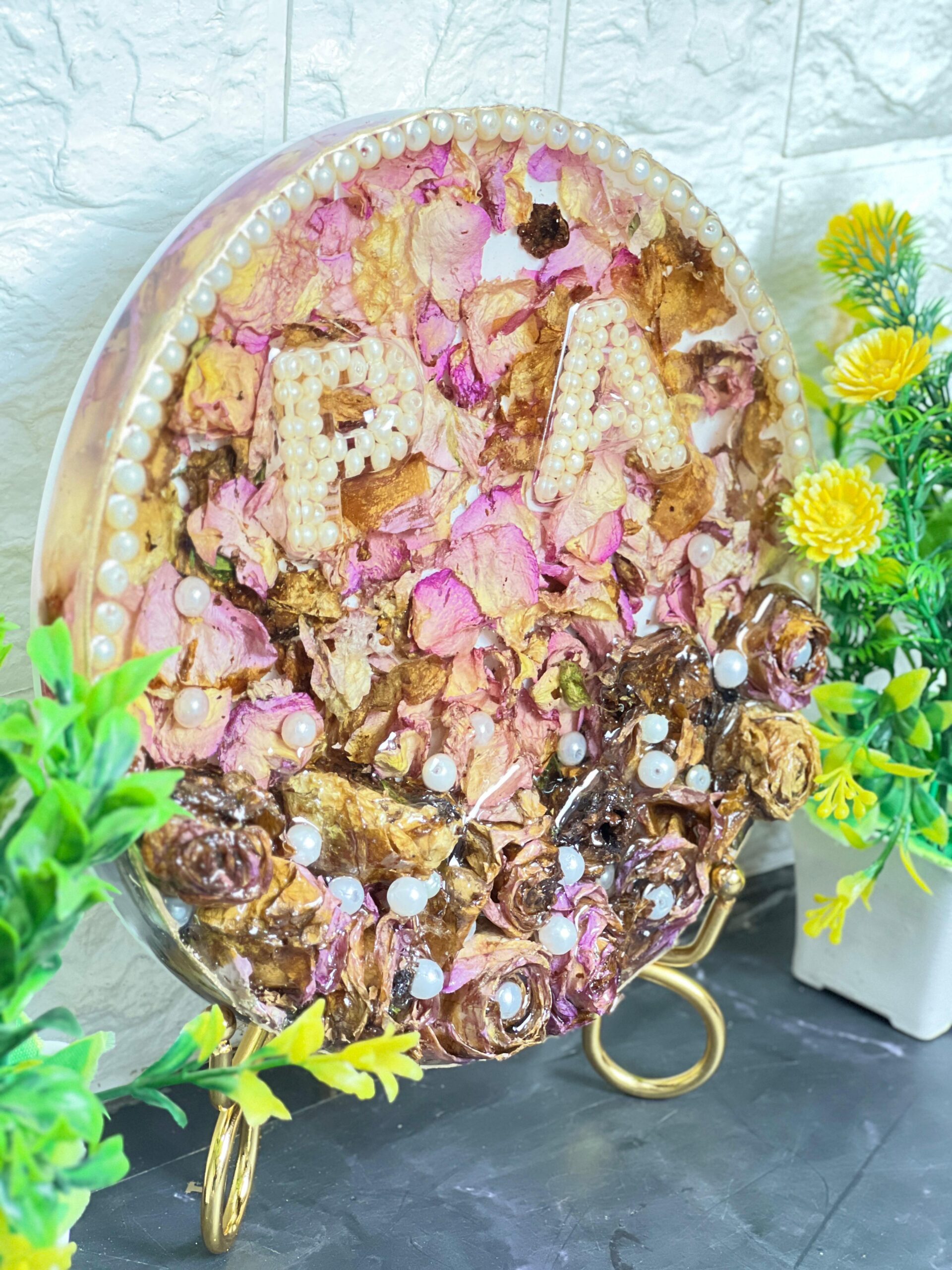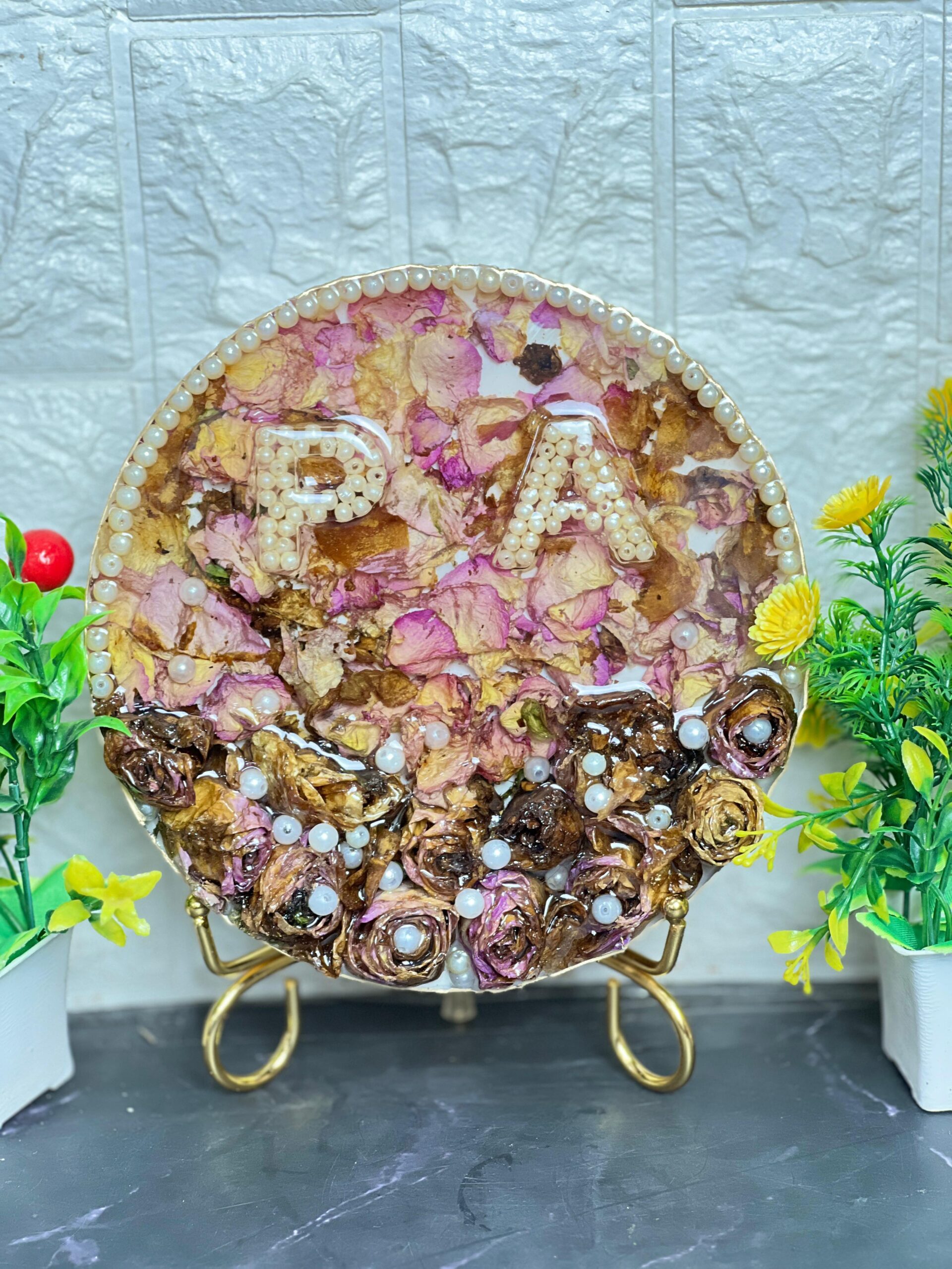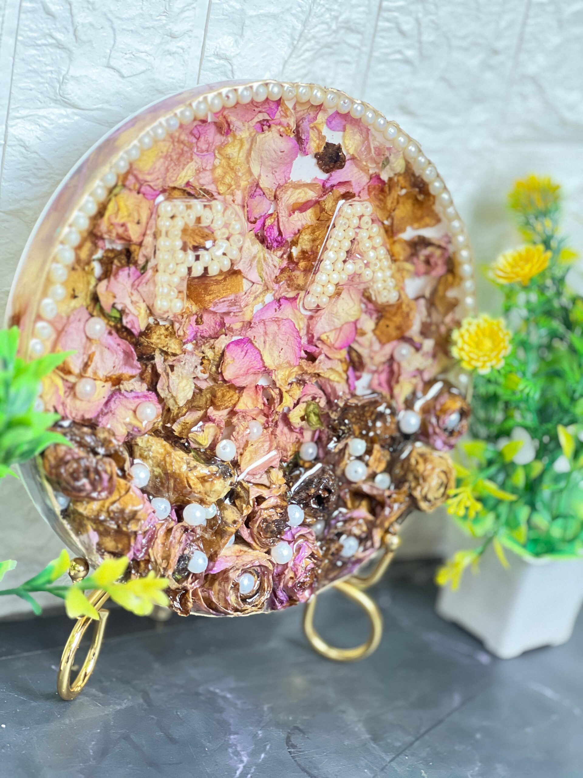 This resin flower initial name frame is a lovely decor item made with real dried rose petals and rosebuds. The top part shows initials crafted with white pearls, giving it a classy and romantic look. The full frame is covered in natural dried flowers and sealed in clear epoxy resin to keep it fresh forever.