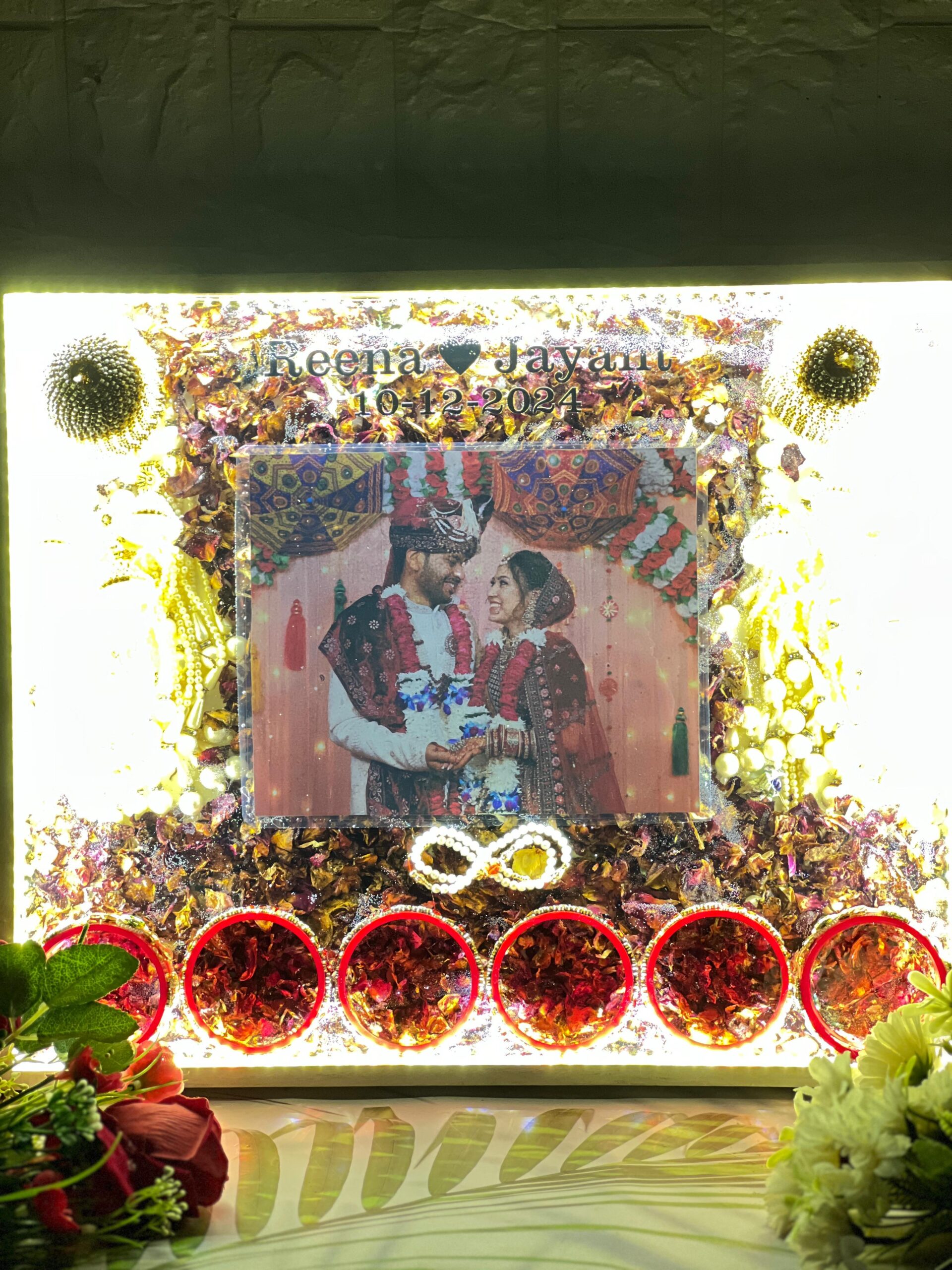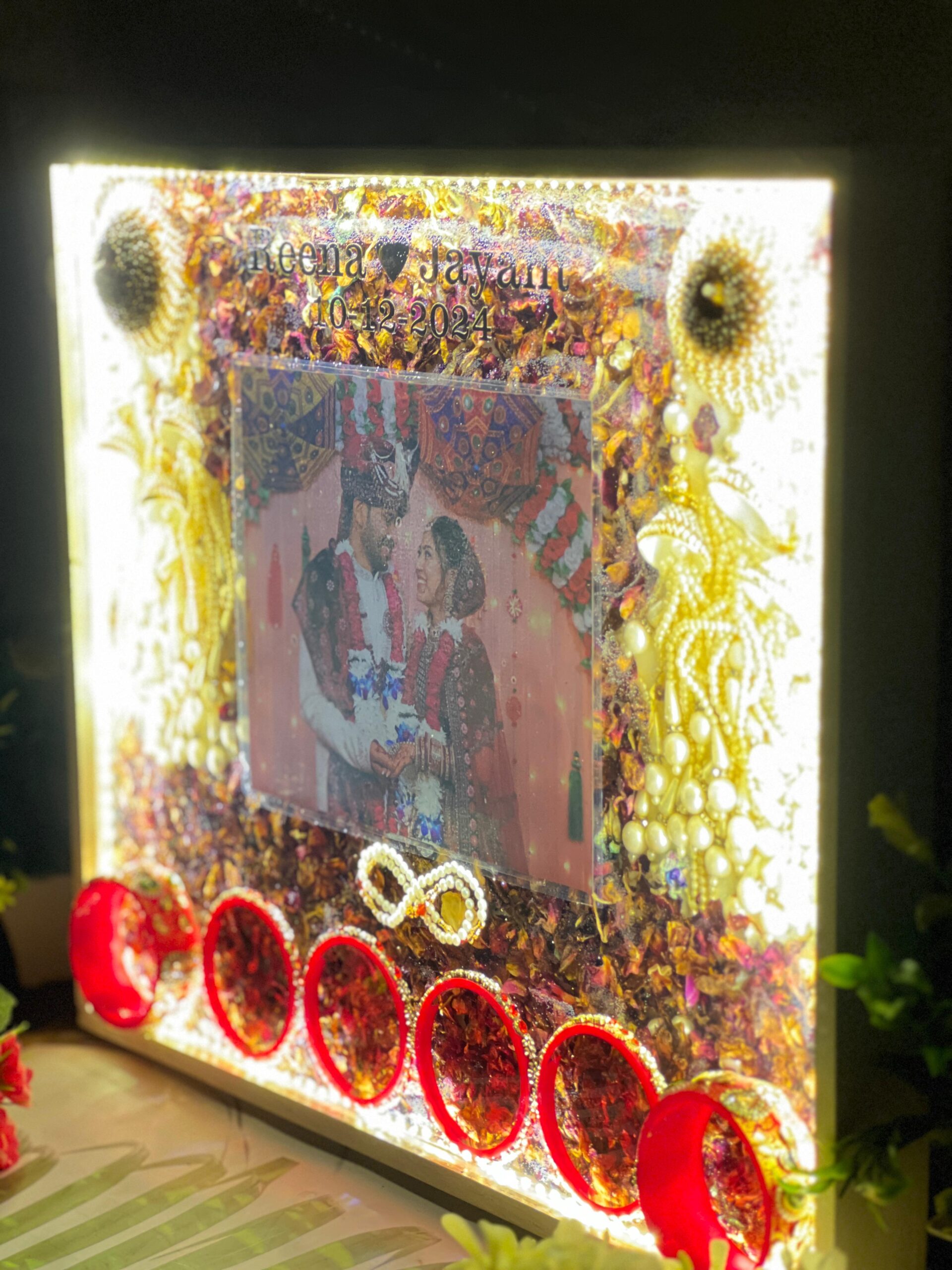 This unique wedding frame is made with care and love. The center holds your special wedding photo, and around it are stunning designs with dry petals, kaleera, gold pearls, and bright lights. The frame looks like a celebration in itself.