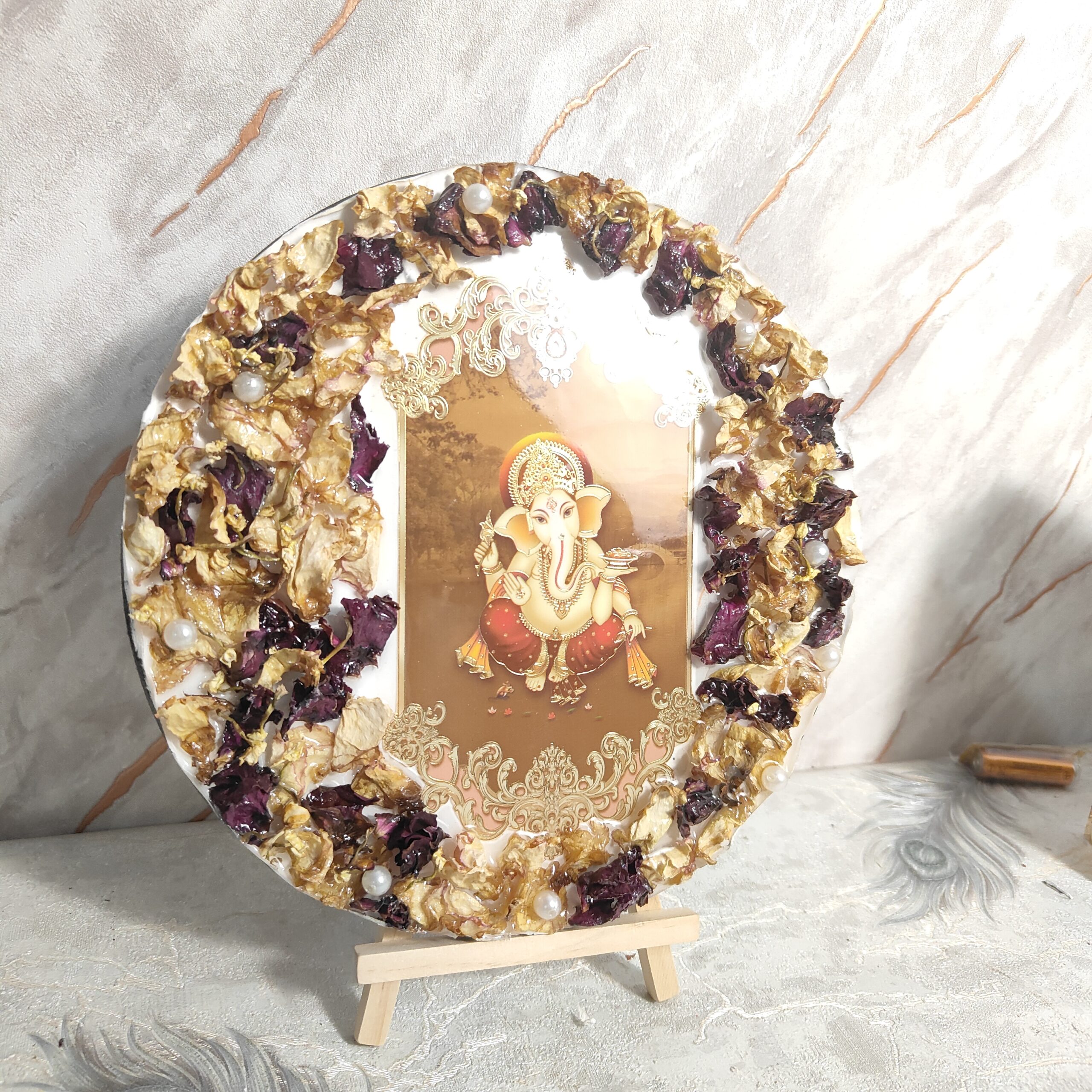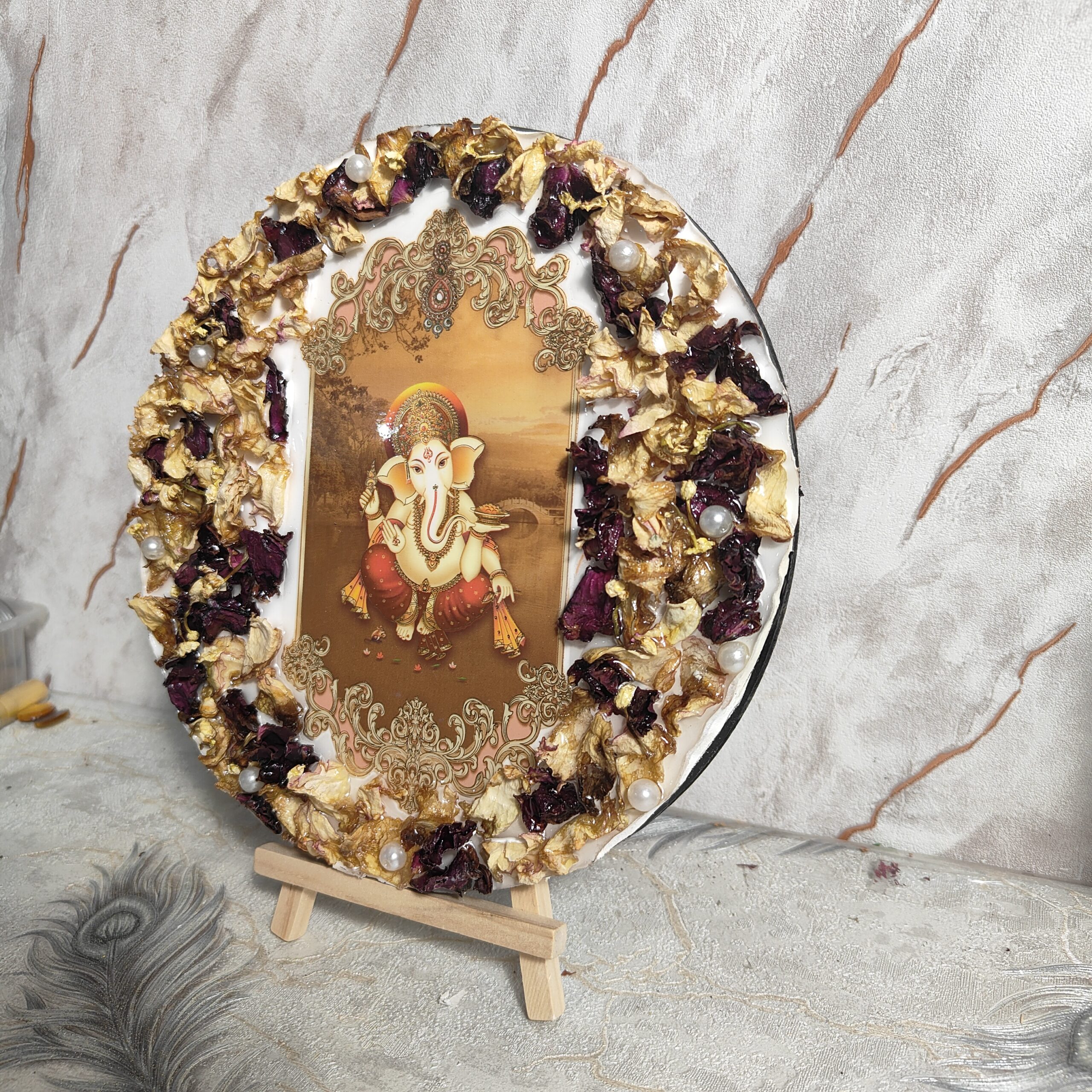 This elegant round frame features a detailed image of Lord Ganesha placed in the center, surrounded by natural dried flowers sealed inside resin. The mix of golden and dark petals brings depth and beauty, giving a soft yet rich traditional look.