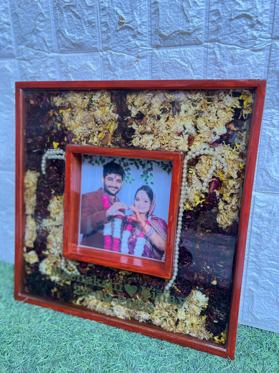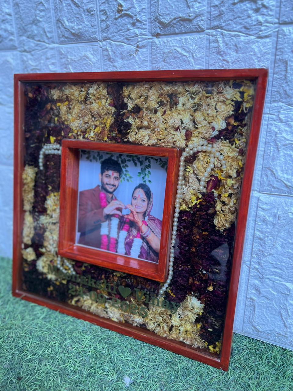 It is handmade with love and designed with real preserved varmala flowers and your favorite couple photo sealed inside premium resin.