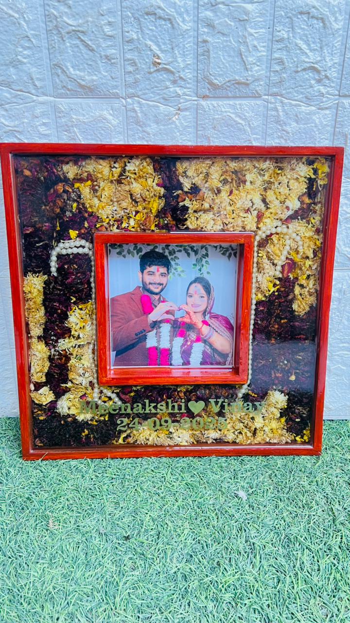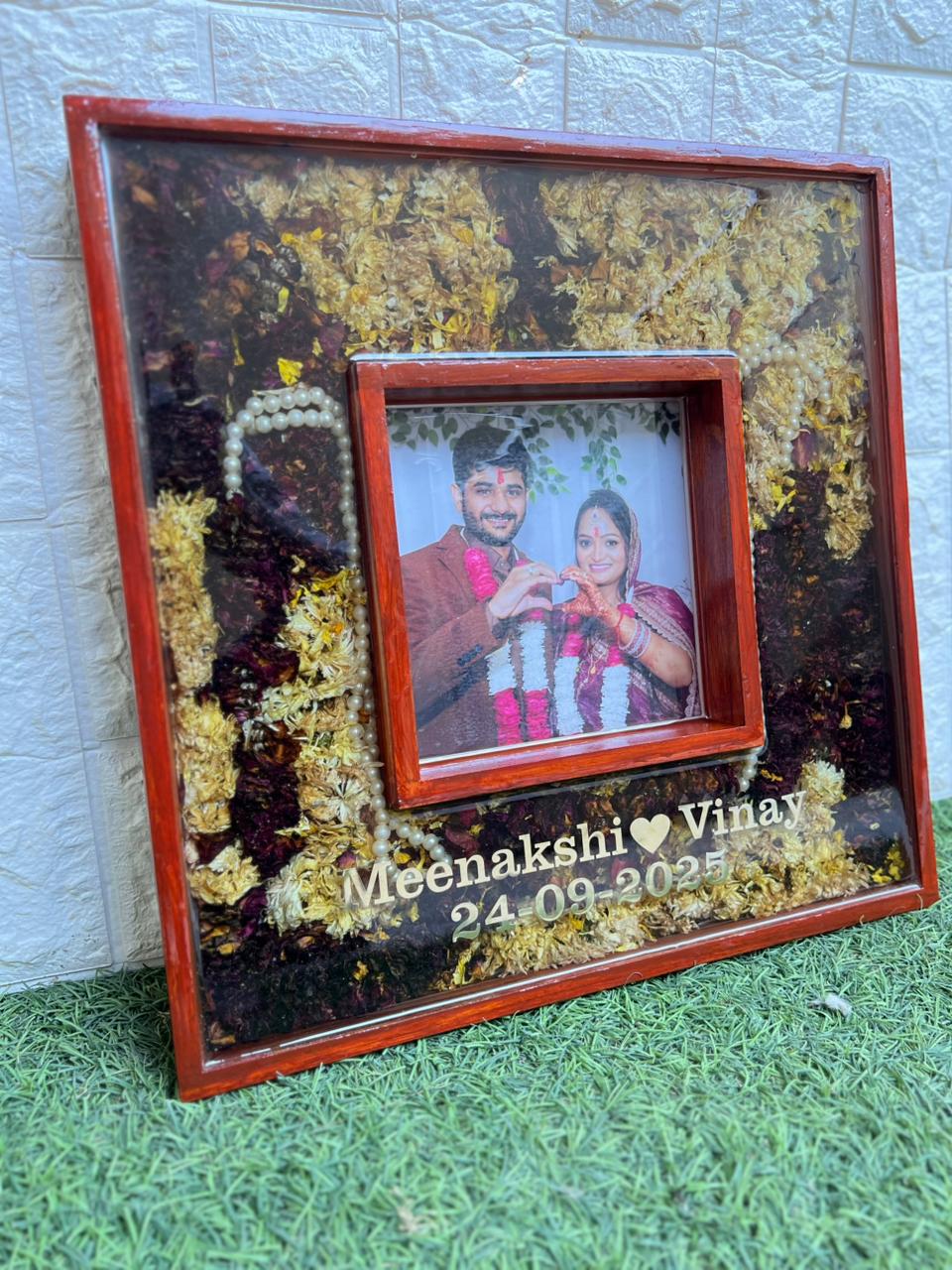 Our team carefully cleans, dries, and arranges your varmala flowers before sealing them into resin to make a long-lasting memory frame.