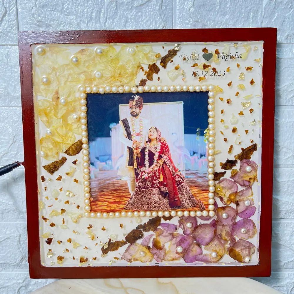 • Lavender & Yellow Varmala Preservation: Real lavender and yellow varmala flowers are preserved in epoxy resin, creating a vibrant and lasting memento.