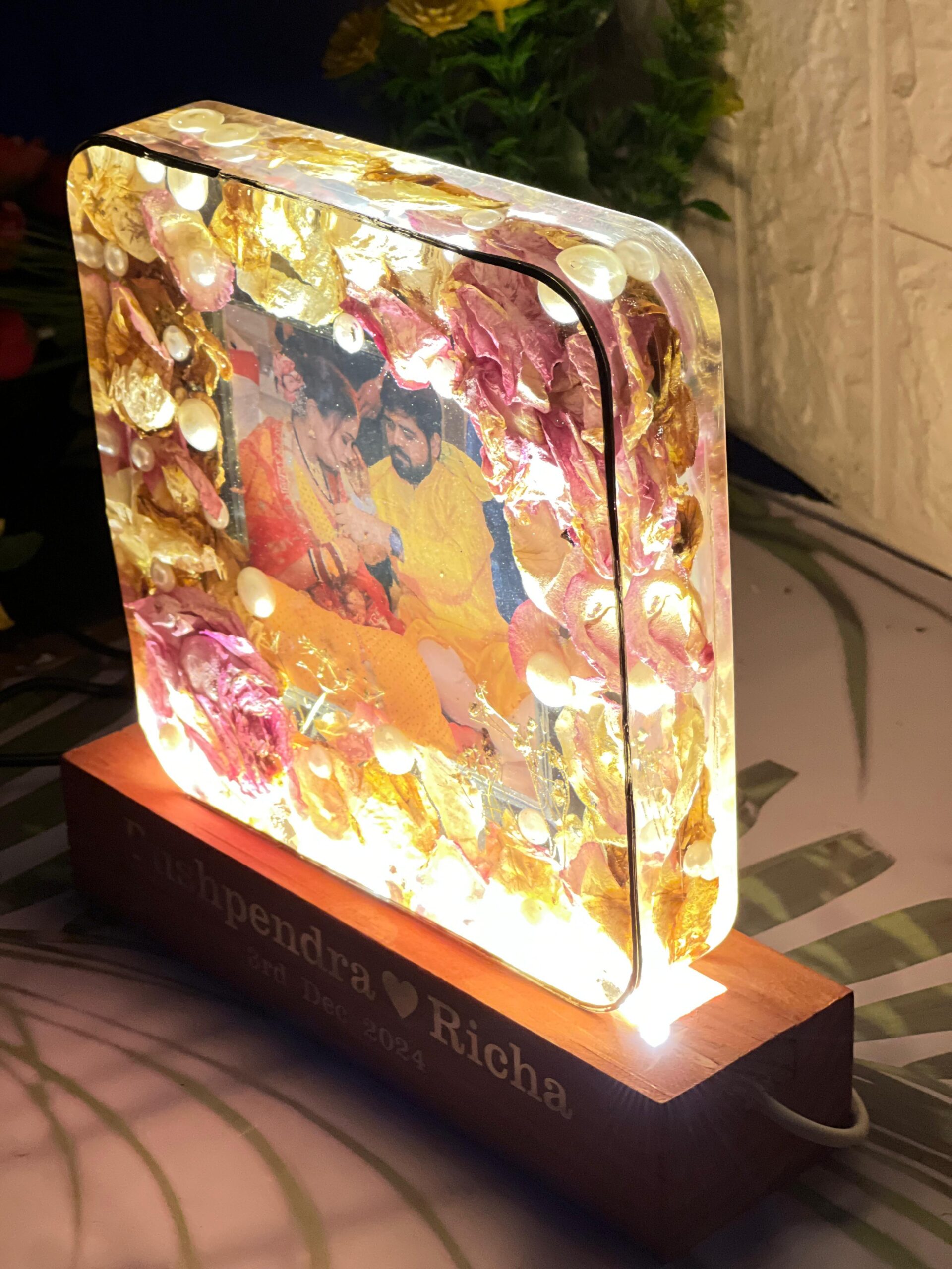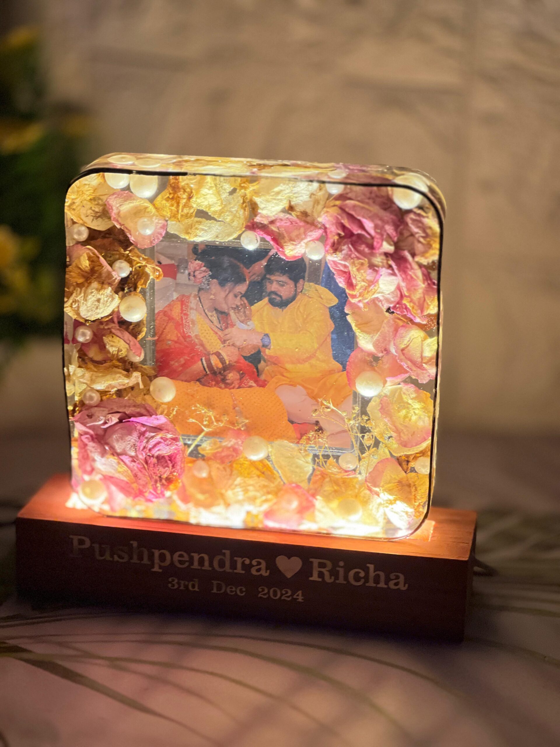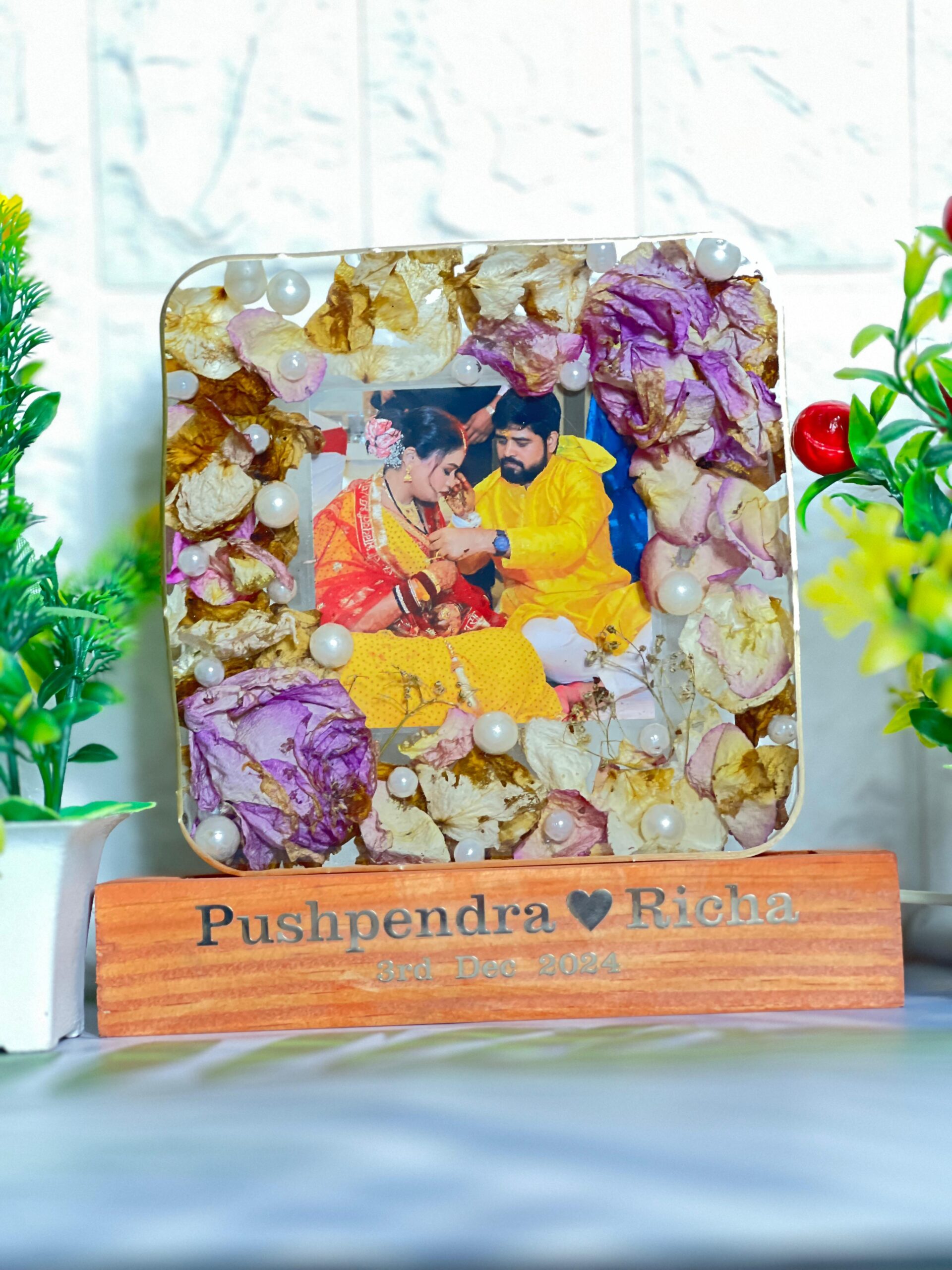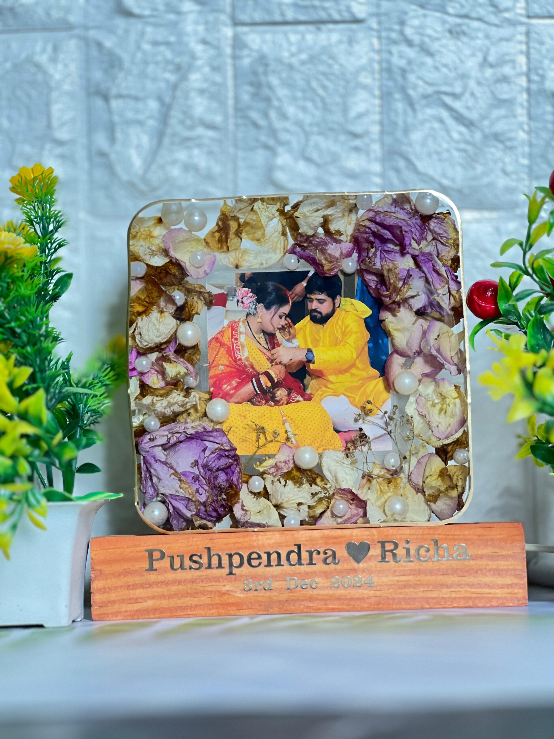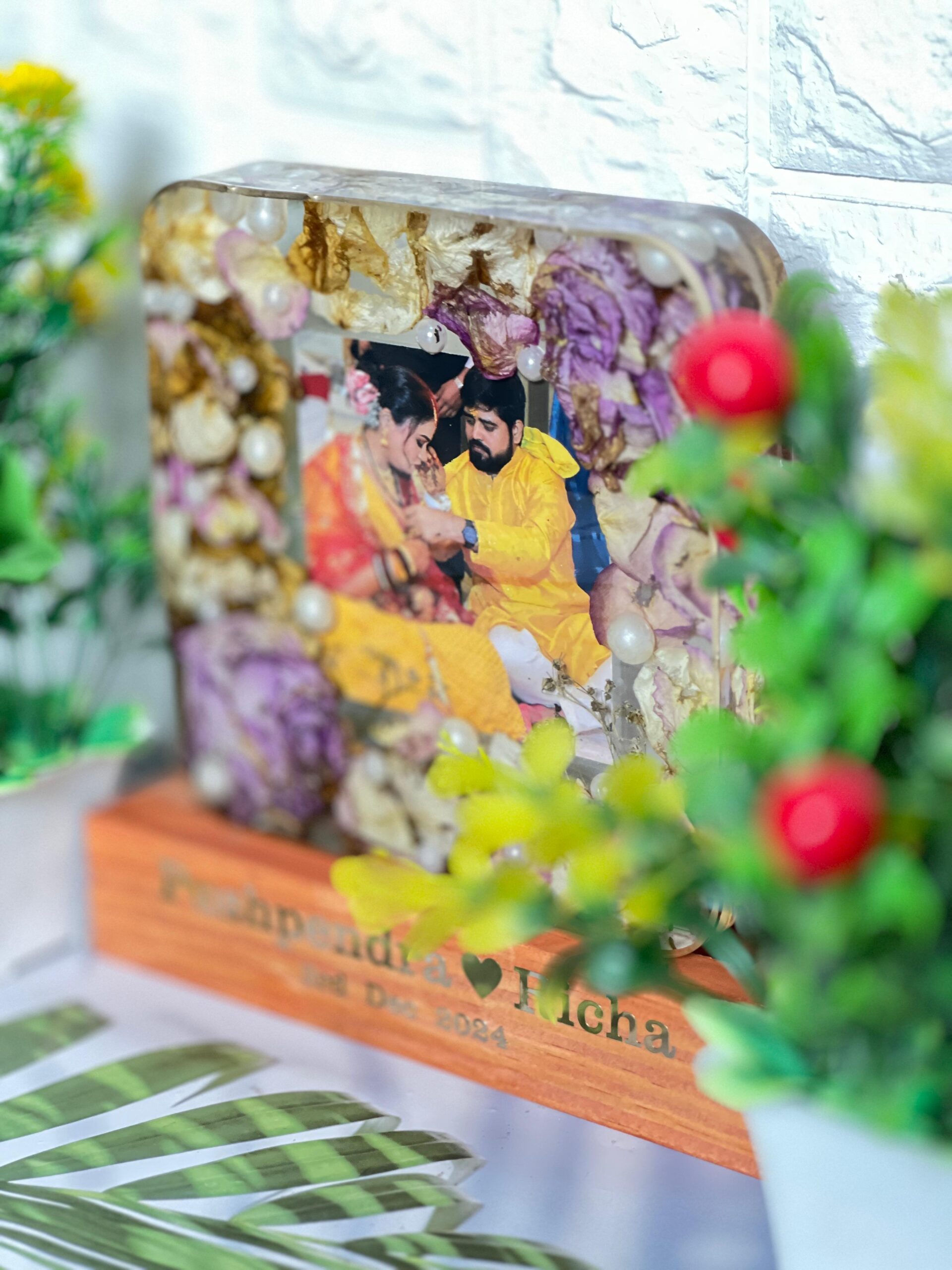 This Resin Photo Frame with Preserved Garland Flowers is a perfect memory gift made from real varmala petals, pearls, and a beautiful couple photo. The epoxy resin keeps all the wedding elements safe and shining forever. The wooden base includes LED light to highlight the frame and create a warm glow.