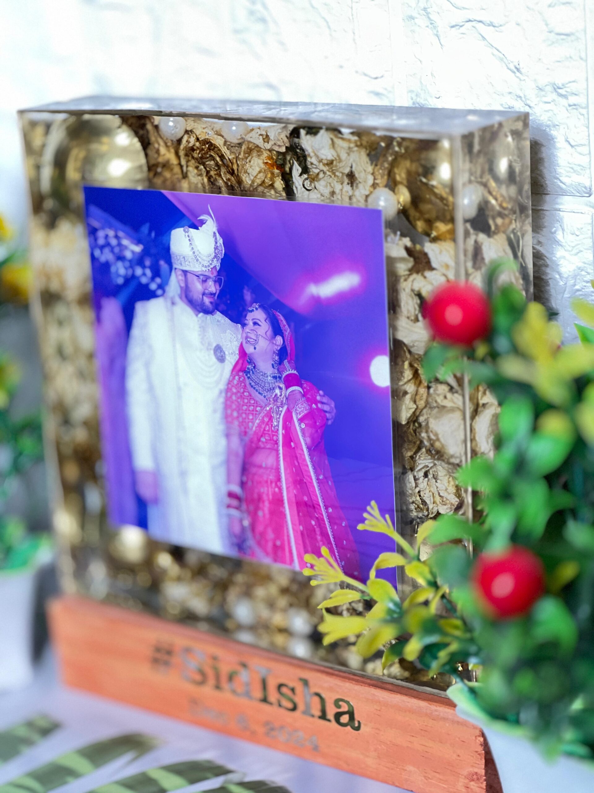 This personalized epoxy resin frame is not just a showpiece — it’s your love, your story, and your forever moment captured beautifully. Each item like kaleeras, pearls, and petals is hand-arranged to give it a royal wedding look. You can choose from different sizes to suit your home space.