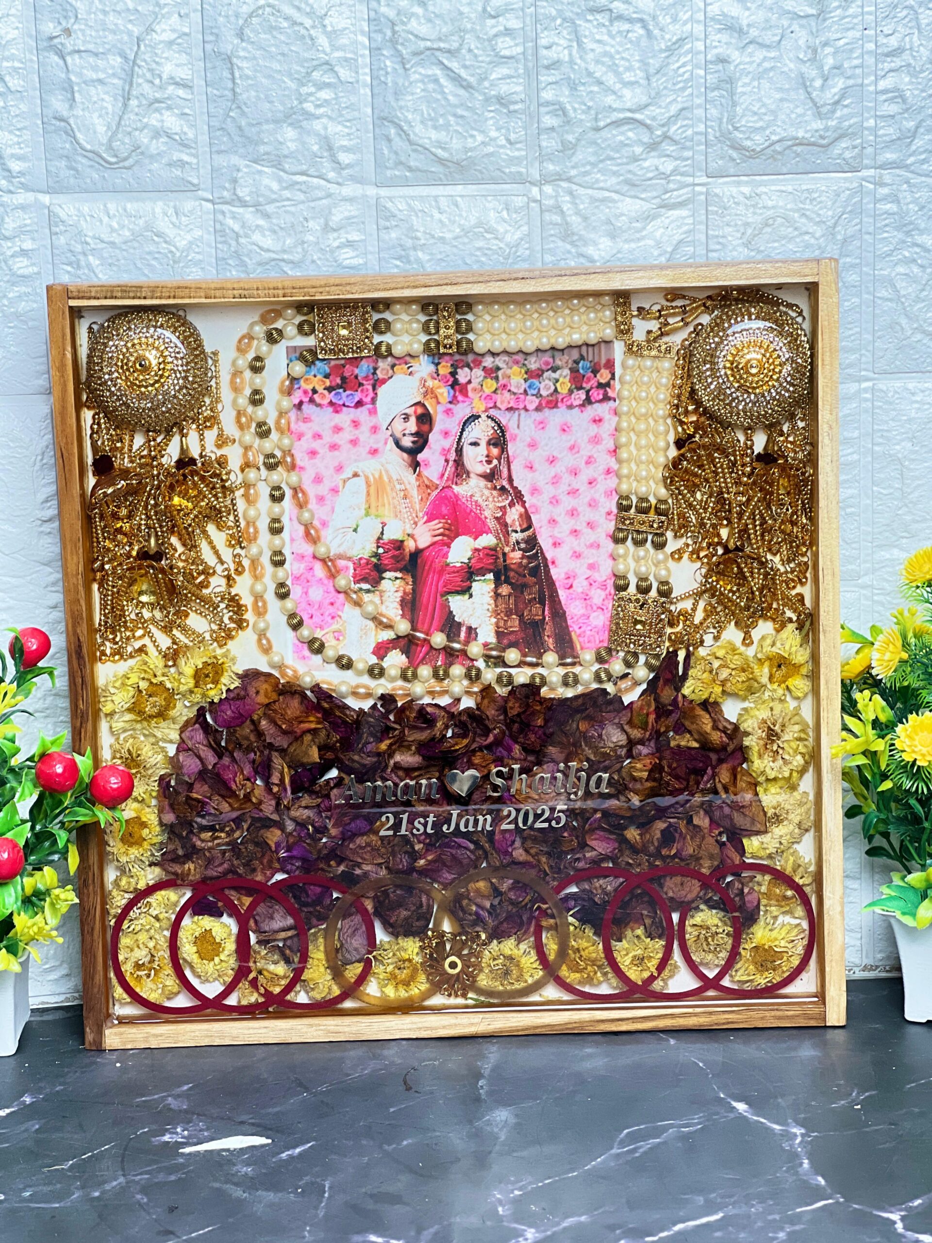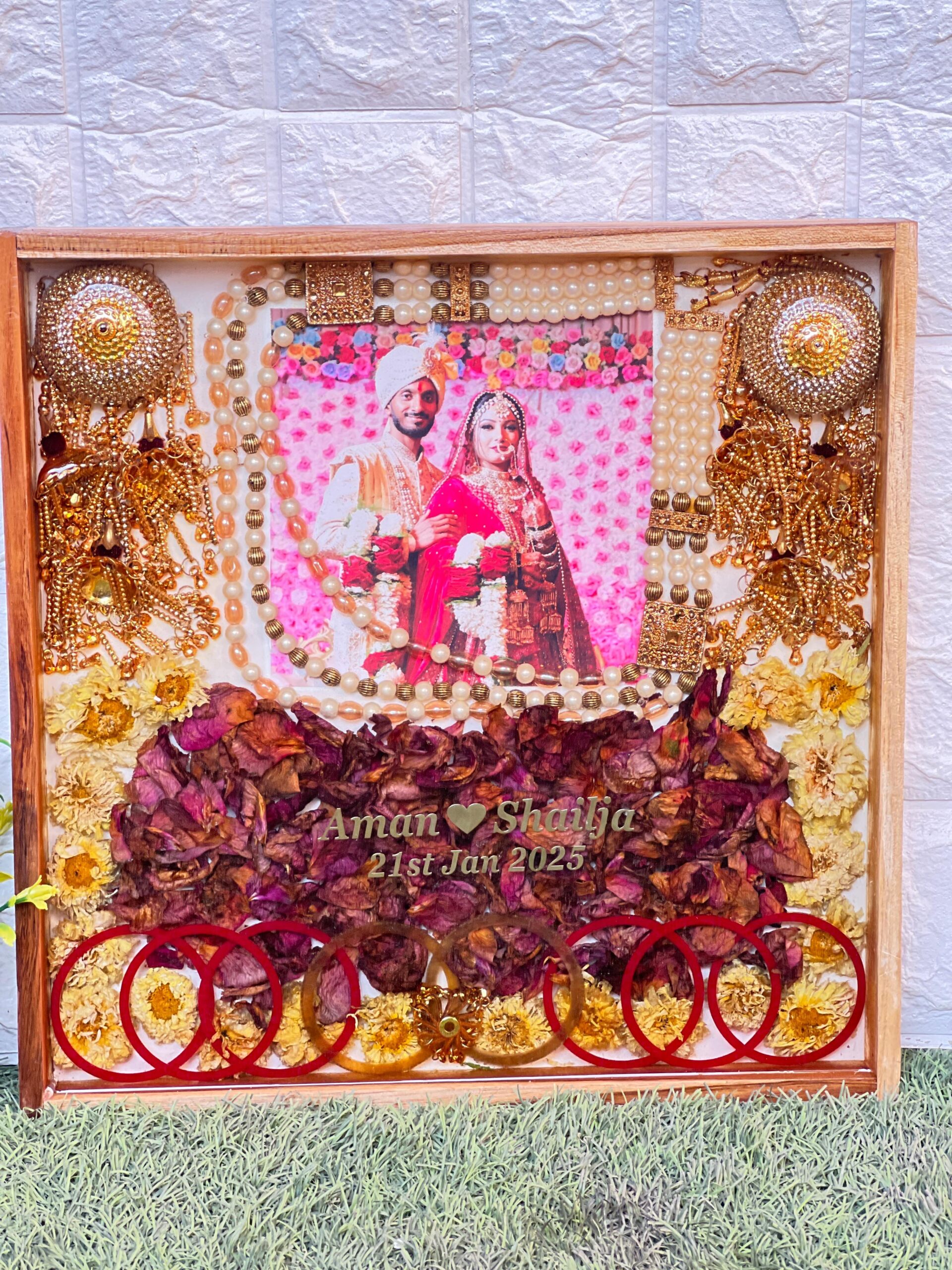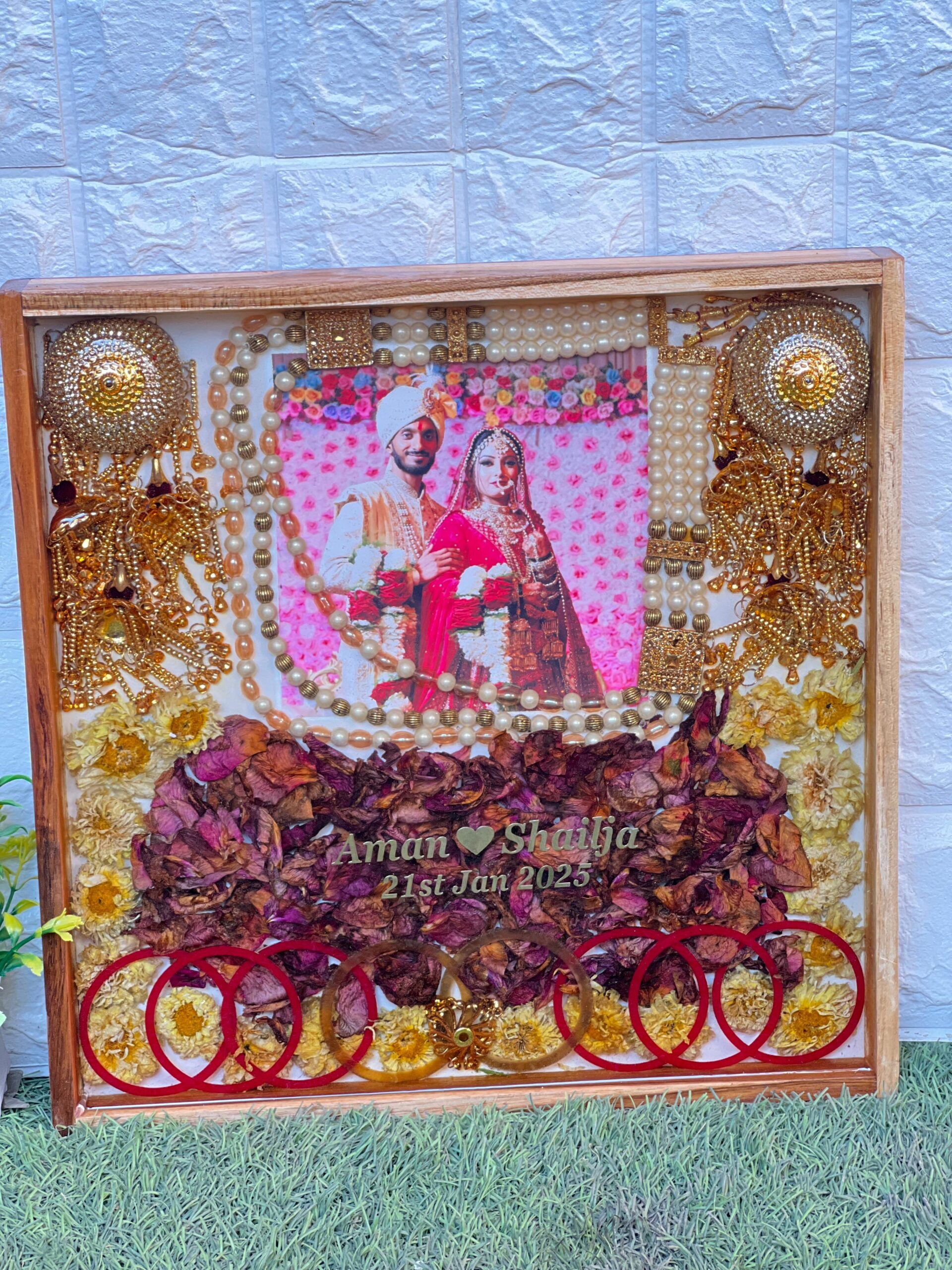 This elegant square frame is a perfect way to preserve your wedding day memories in one place. It features the original dried varmala flowers, wedding bangles, and decorative beads, all arranged beautifully around a center photo of the bride and groom.
