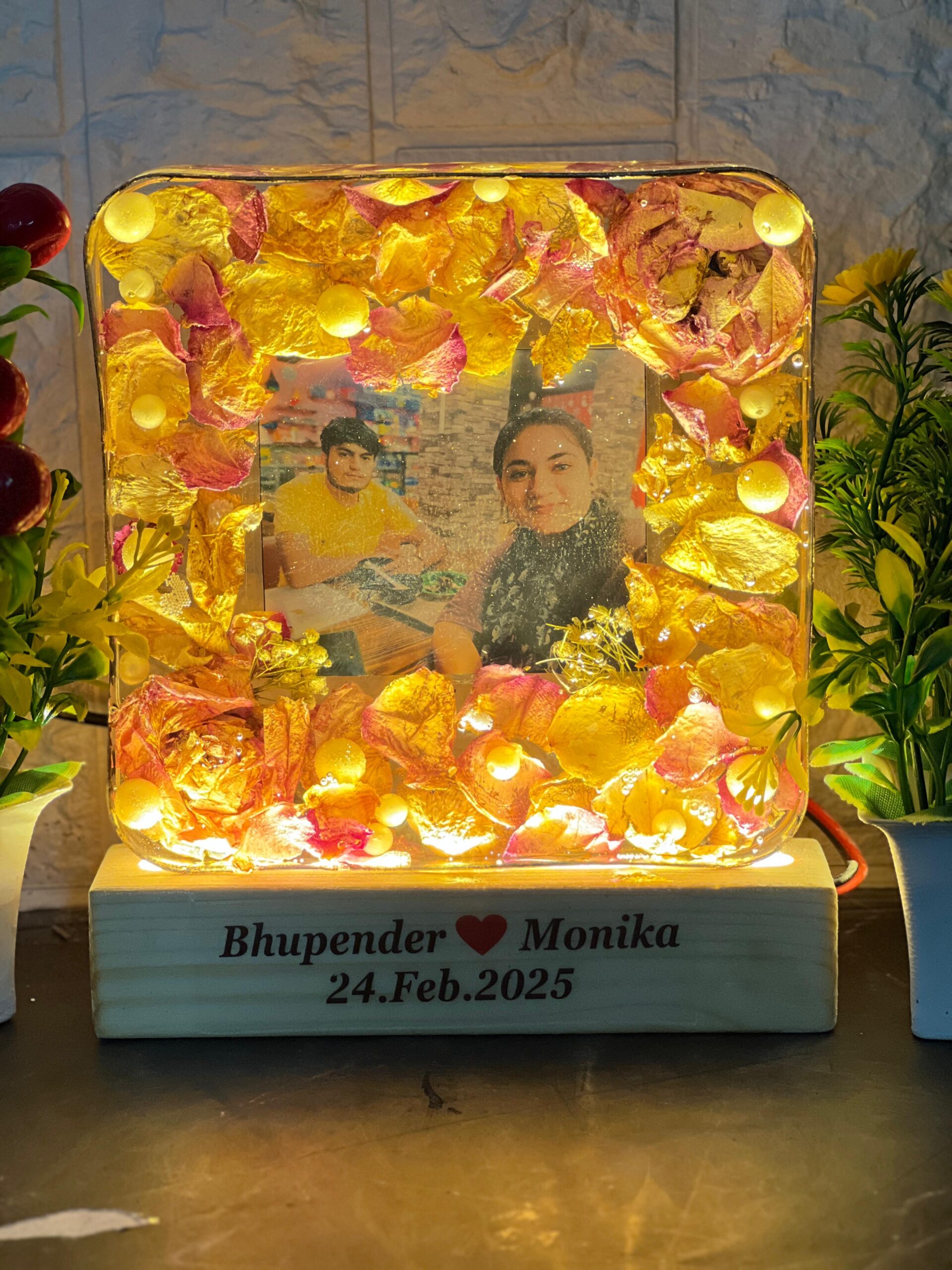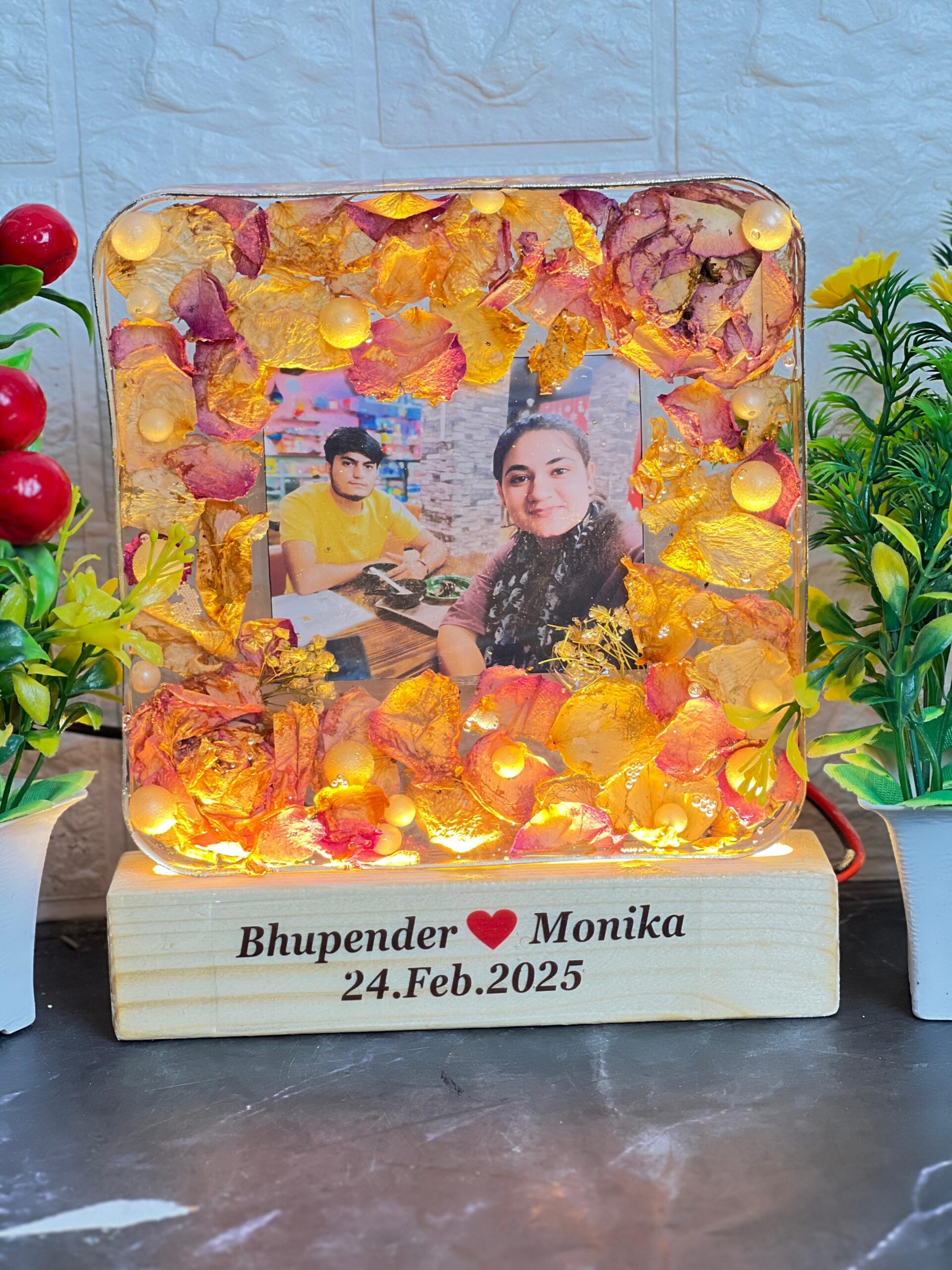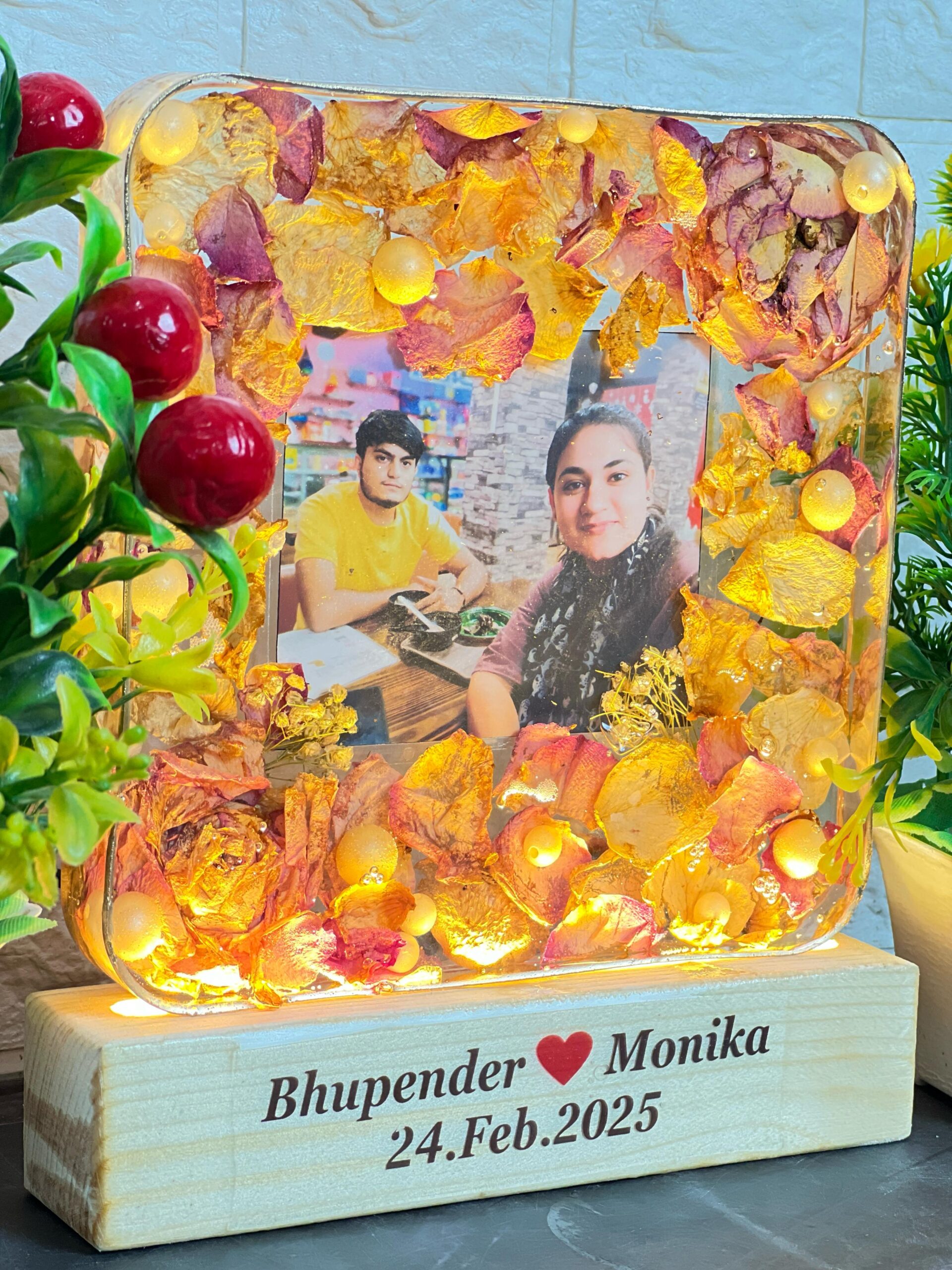 This glowing square resin frame is the perfect way to light up your love story. It features real dried petals, soft yellow LEDs, and a sweet couple picture. The base includes the couple’s names and date, making it completely personal and heart-touching.