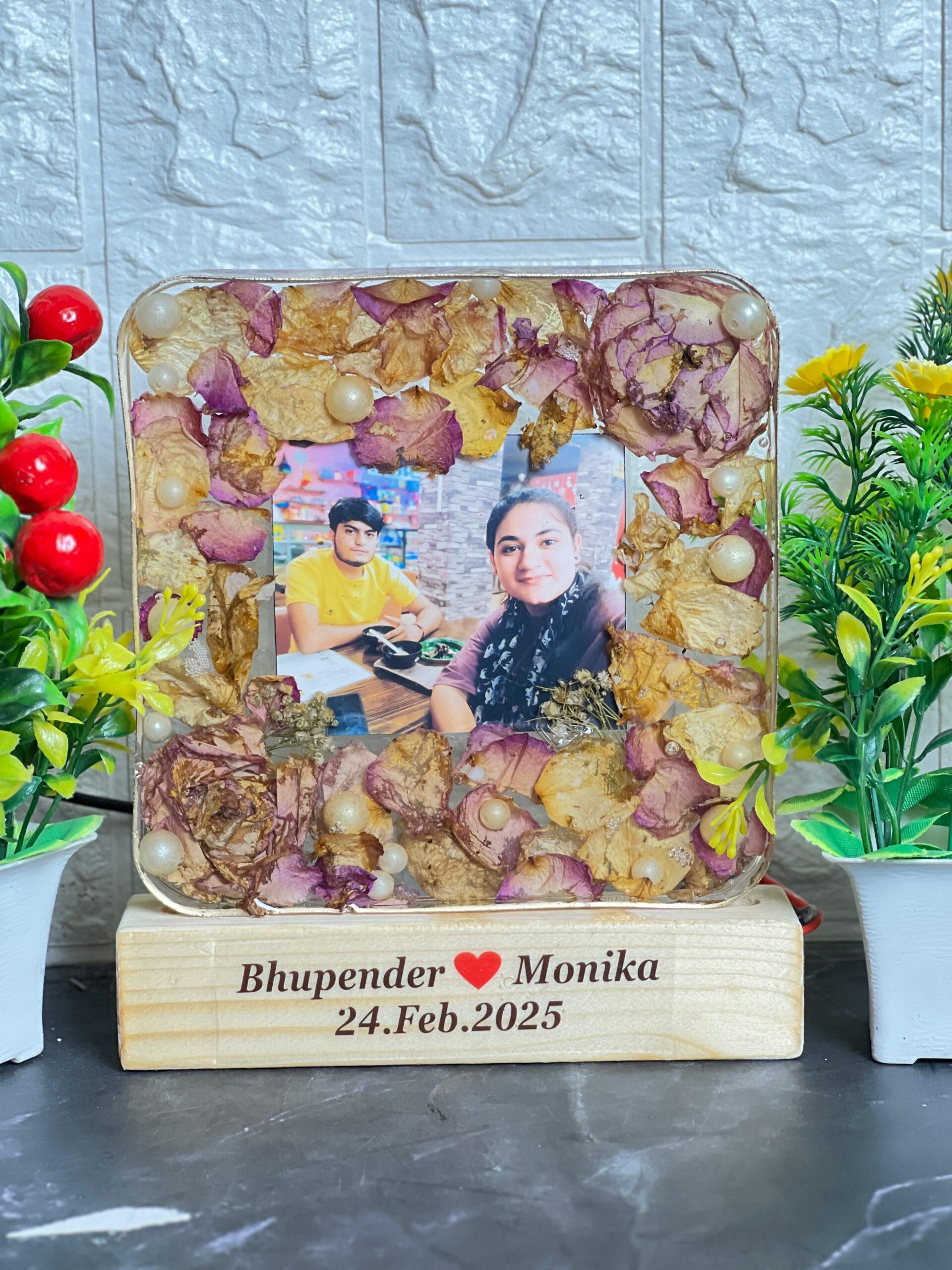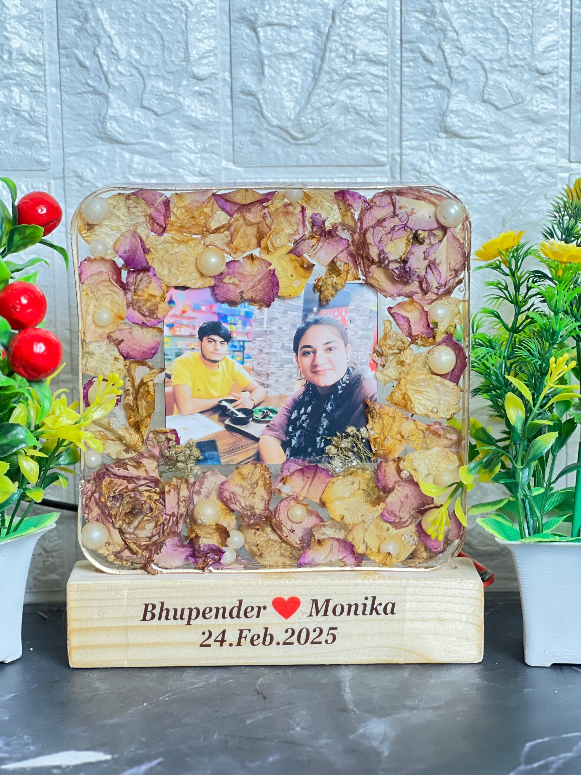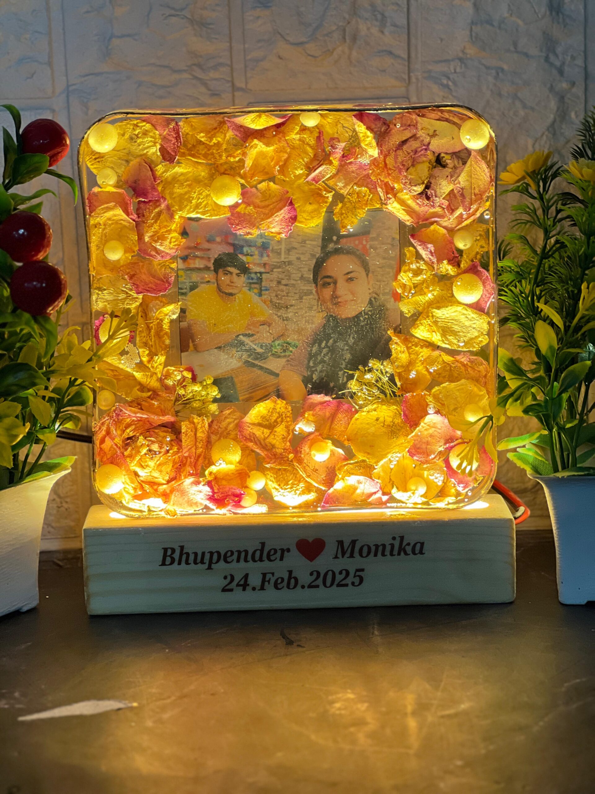 This glowing square resin frame is the perfect way to light up your love story. It features real dried petals, soft yellow LEDs, and a sweet couple picture. The base includes the couple’s names and date, making it completely personal and heart-touching.