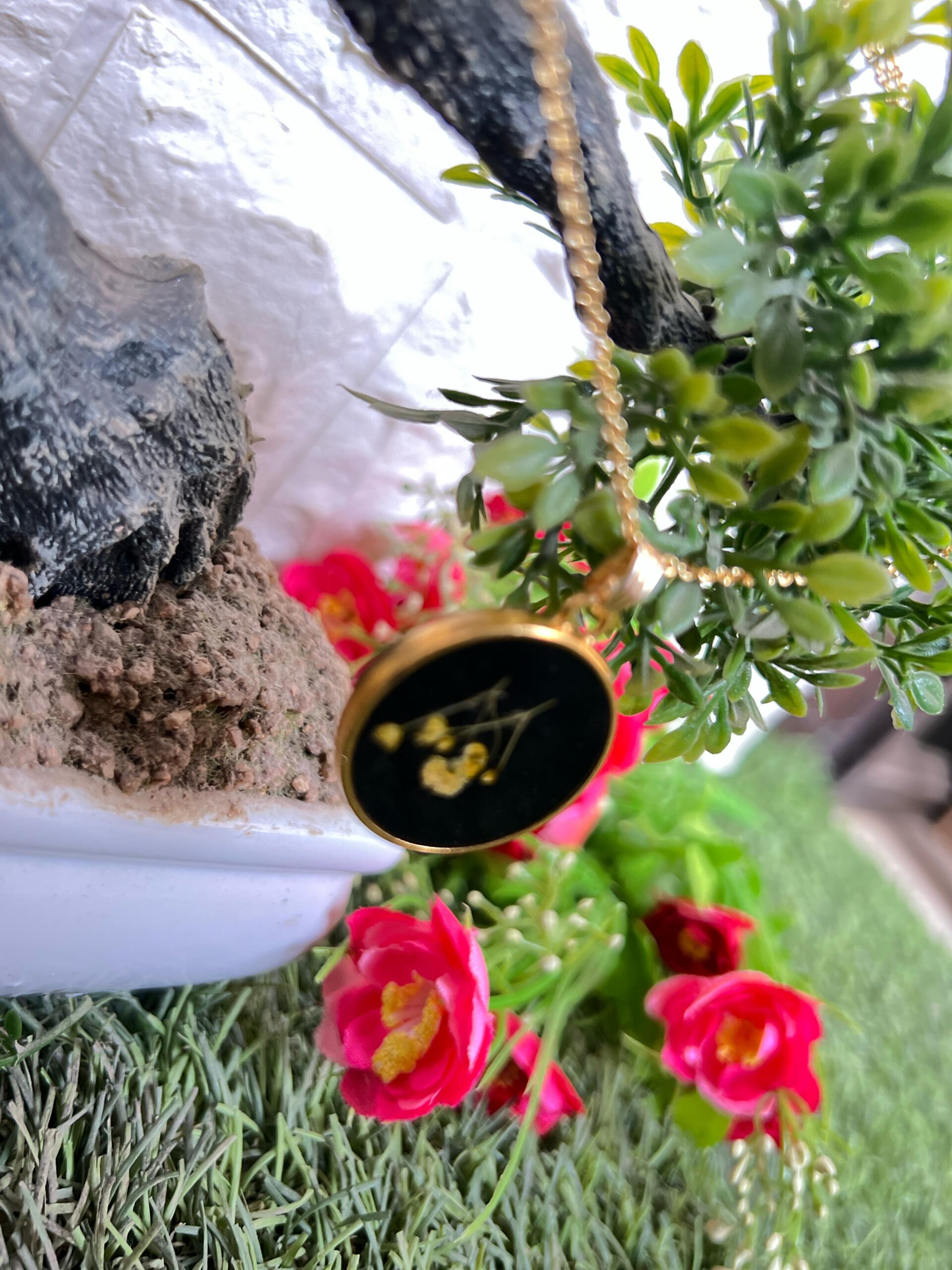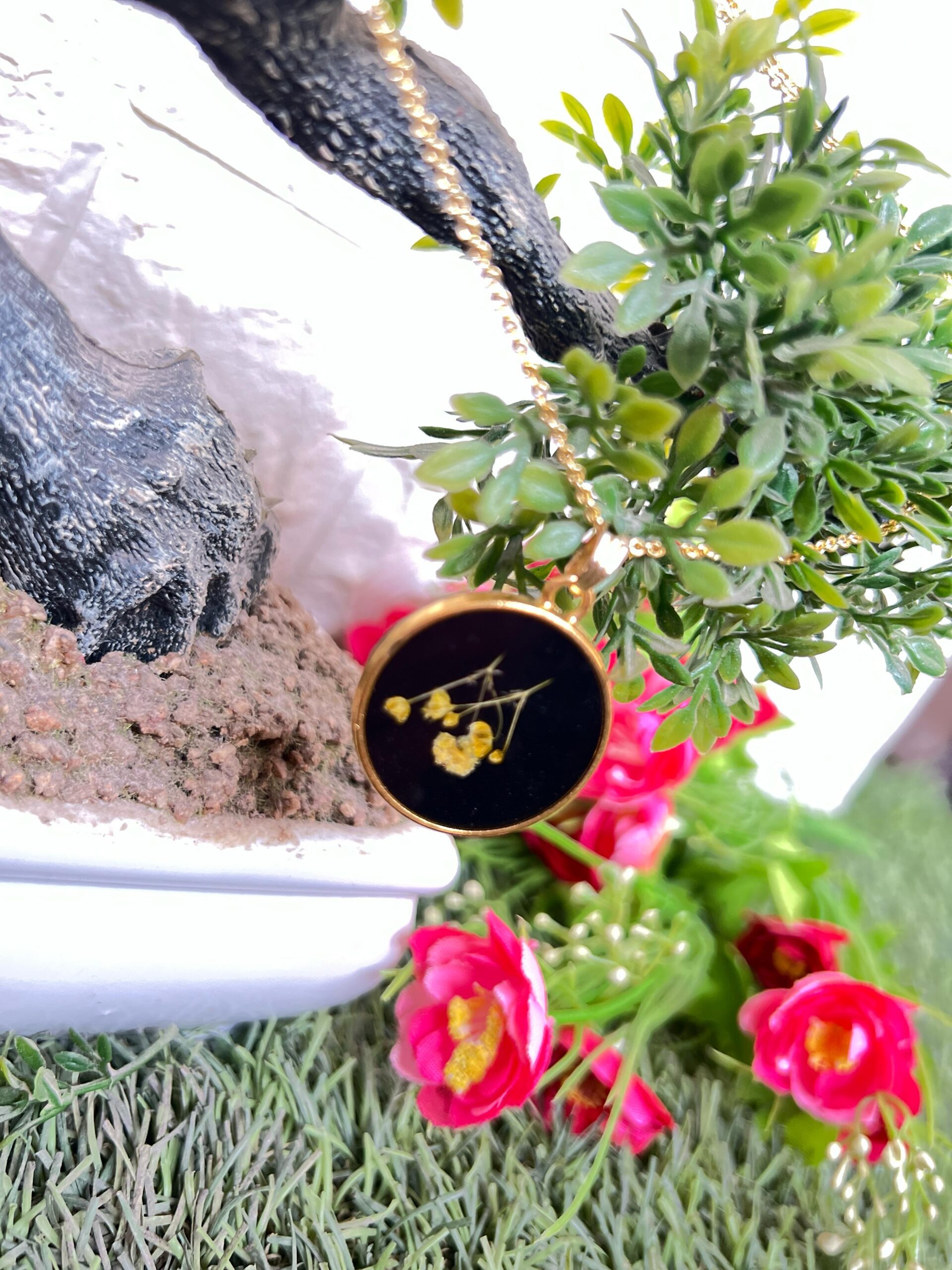This resin jewellery set is a beautiful mix of nature and art. The set includes one resin ring, two round pendants, and two elegant earrings. Each piece is made with real dried yellow flowers, placed carefully inside black epoxy resin and finished with a golden border.