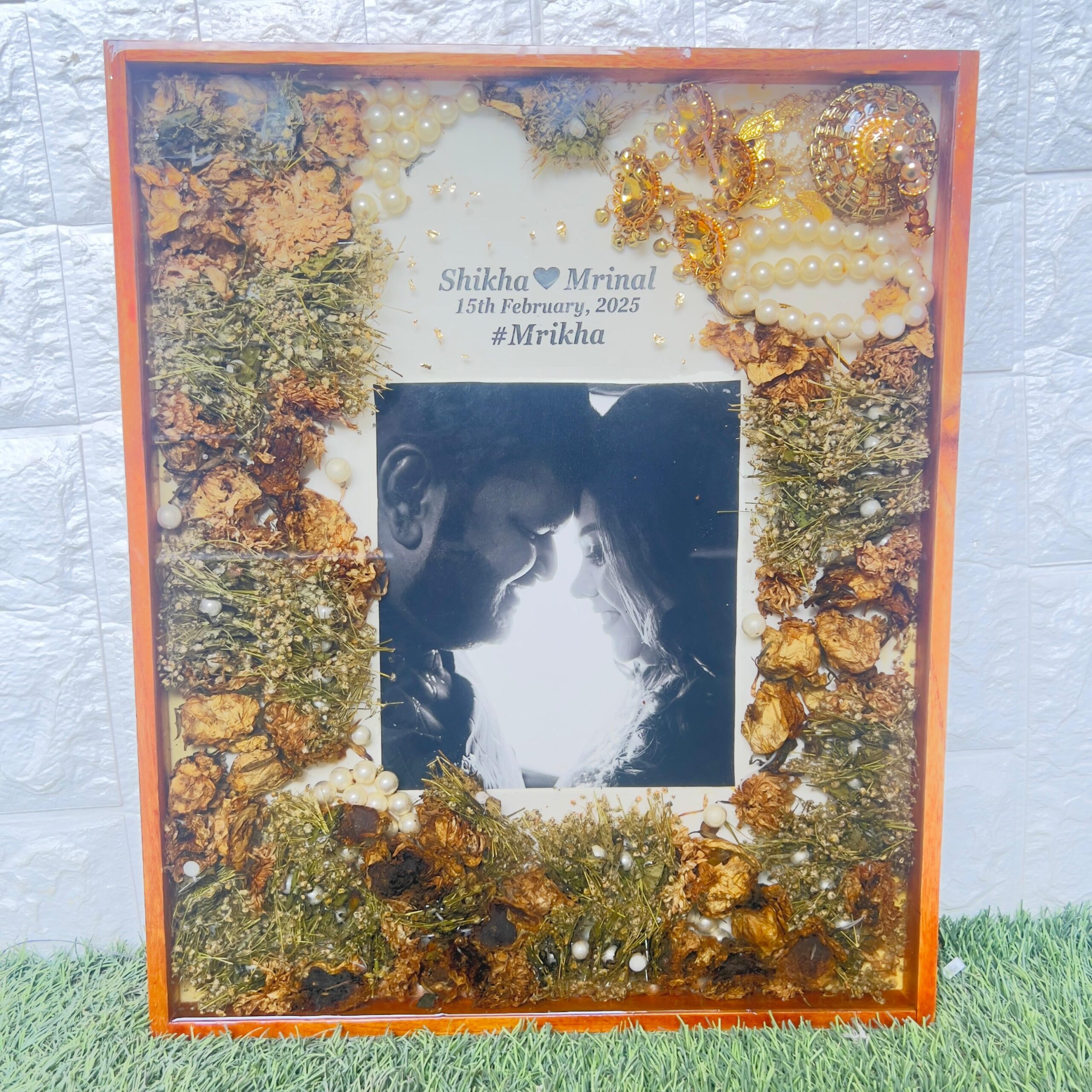 Celebrate love with our rectangle resin frame with photo & name, made specially to lock your memories forever. This eye-catching frame holds your beautiful wedding or pre-wedding photo right in the center, surrounded by real flowers, shimmer, kaleera, pearls, and custom text.