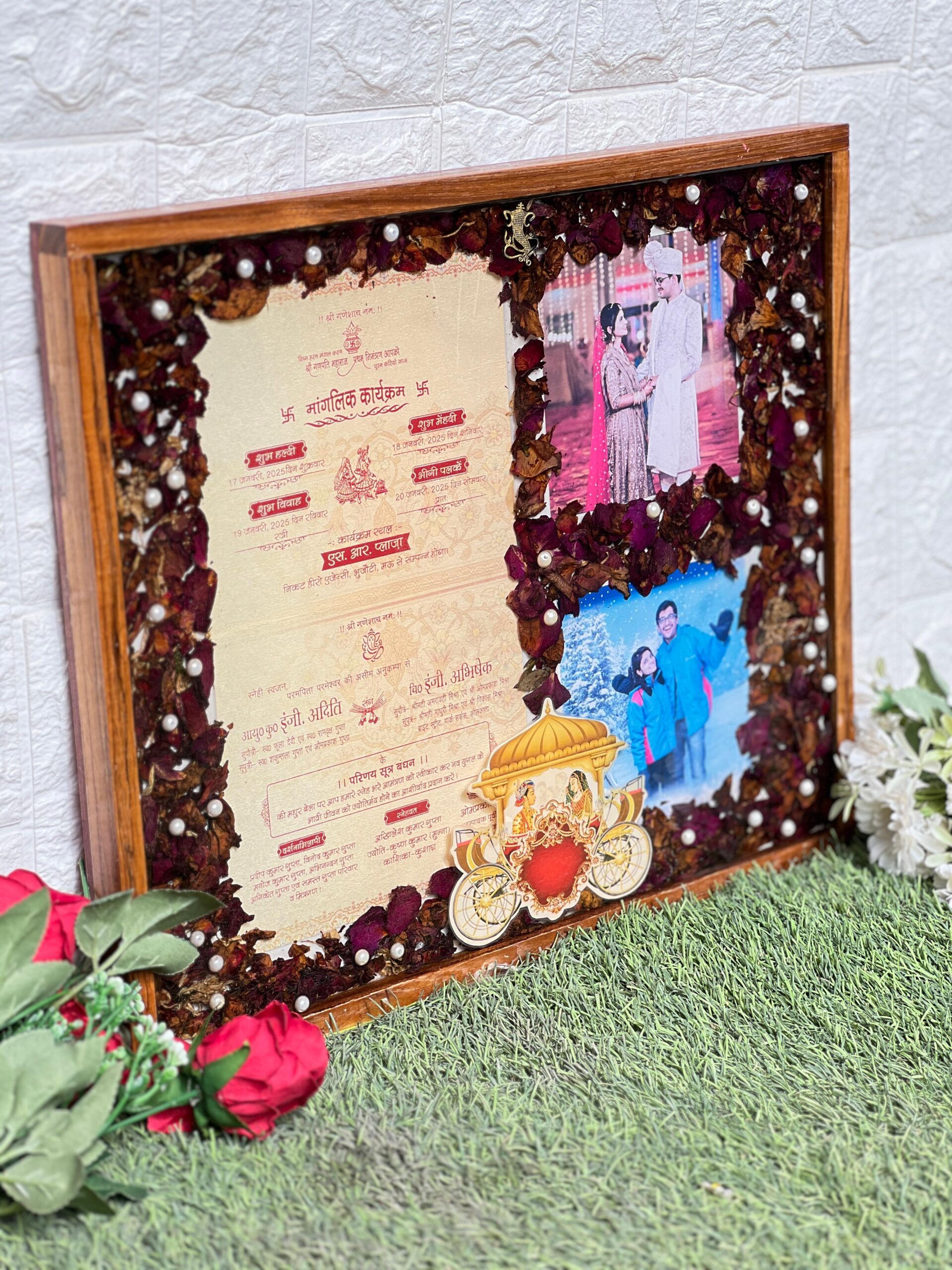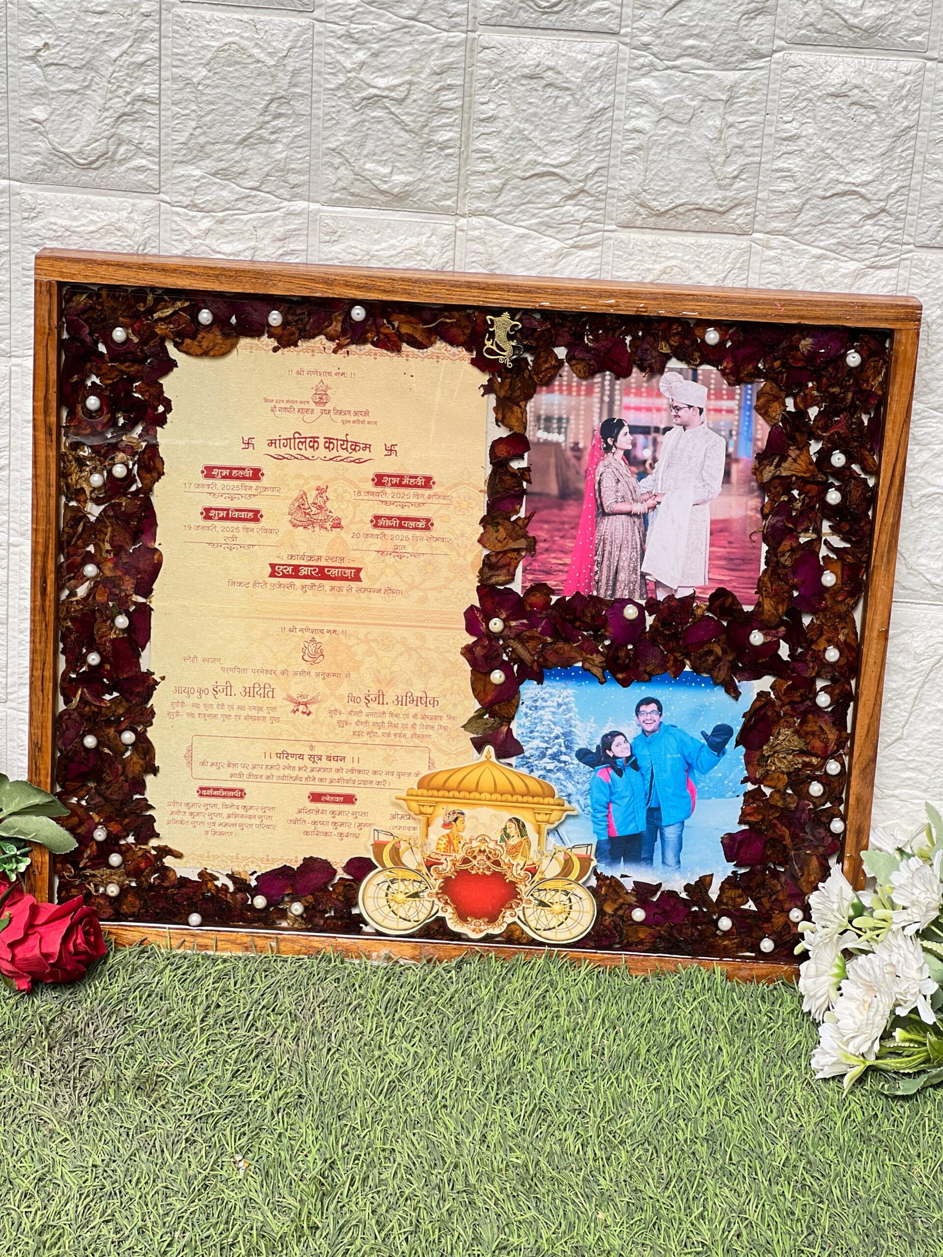 Celebrate your big day forever with this wedding varmala & photo preserved resin frame. We carefully preserve your wedding card, special couple photos, and real dried rose petals in a beautiful clear resin frame. The frame is handmade, giving a luxury and personal touch. Perfect for brides and grooms who want to keep their wedding memories alive in a stylish and modern way.
