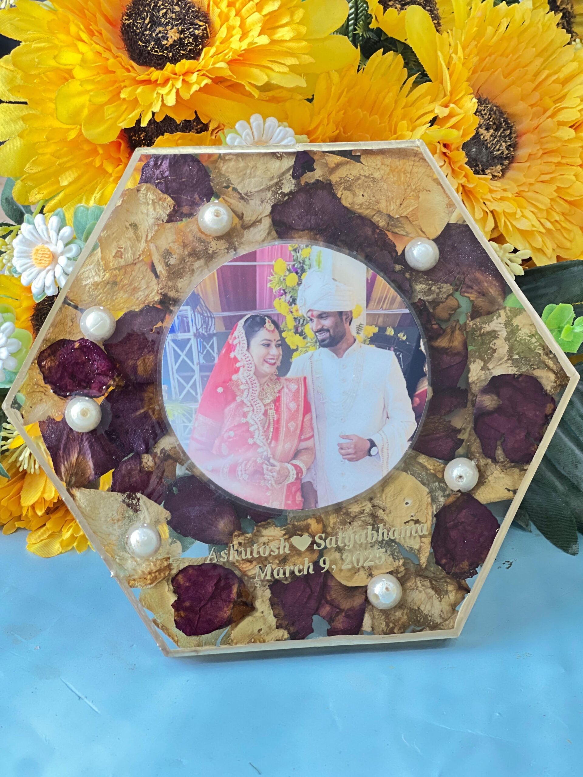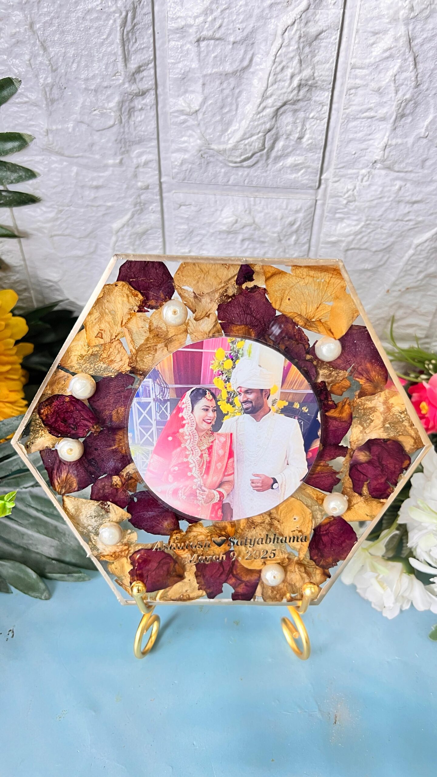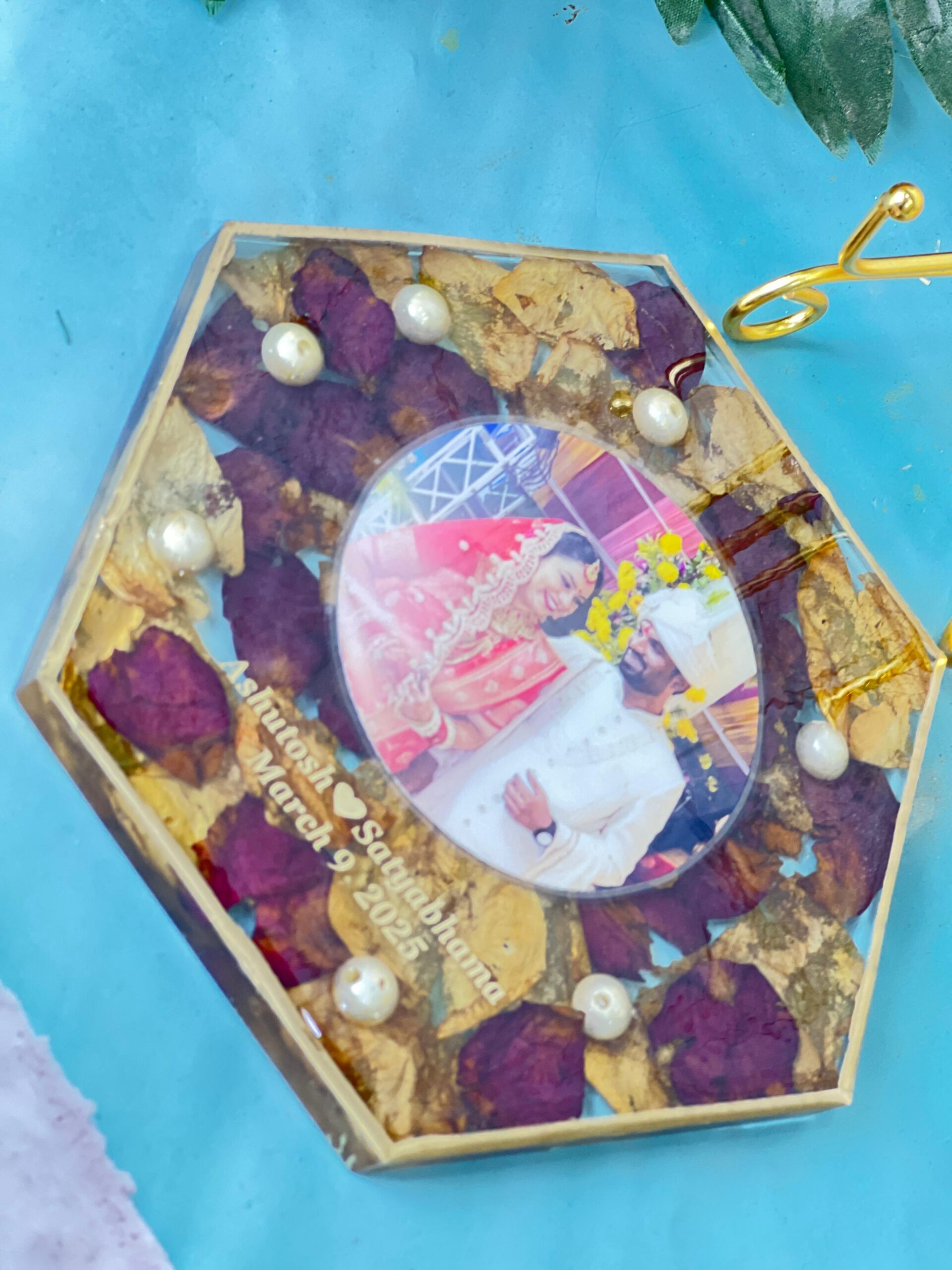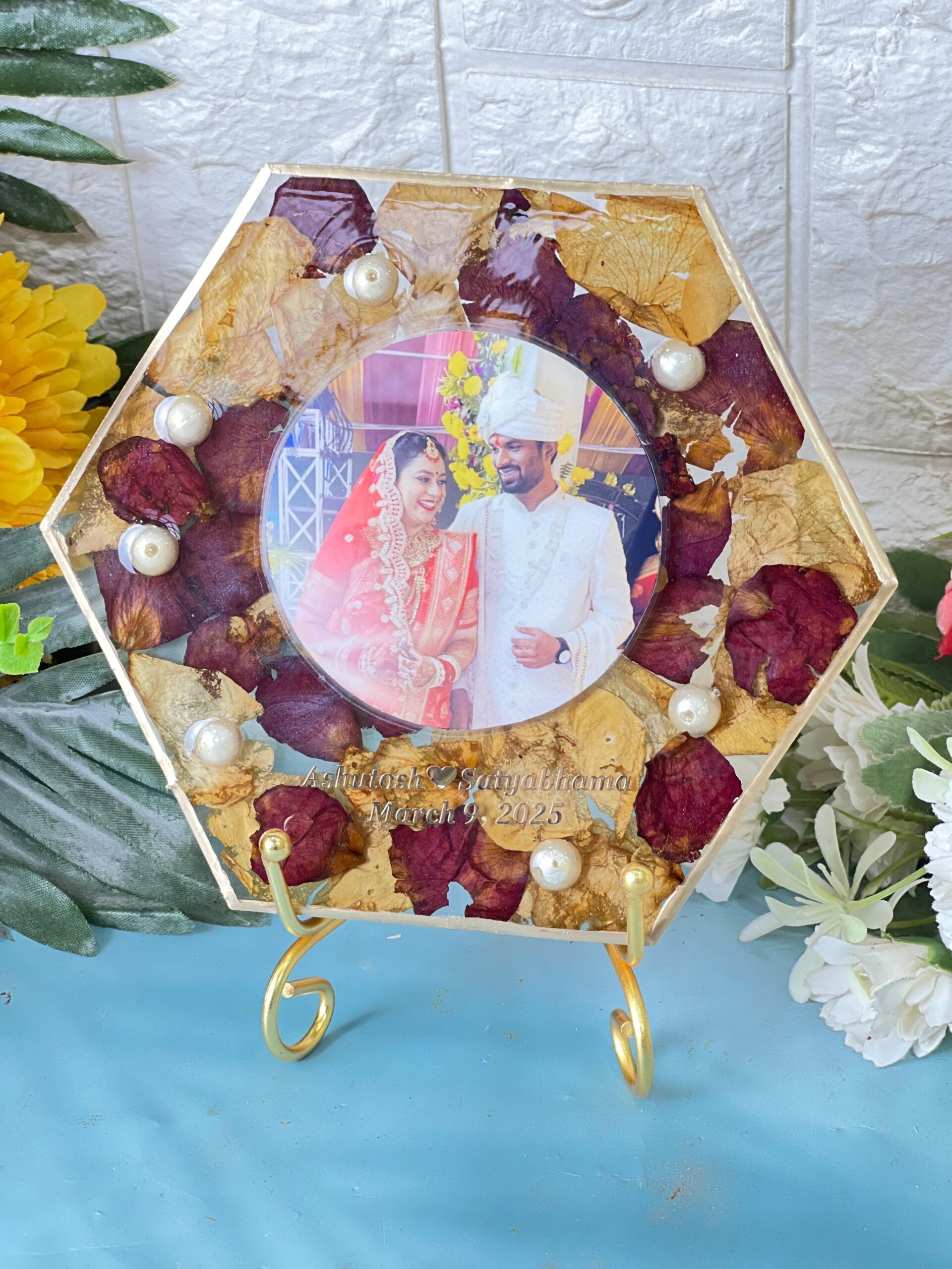 This beautiful Hexagon Resin Photo Frame with Preserved Varmala Flowers is a perfect way to keep your wedding memories alive forever. The frame is crafted from clear, high-quality resin that safely seals and preserves your varmala flowers, delicate rose petals, golden leaves, and pearls.