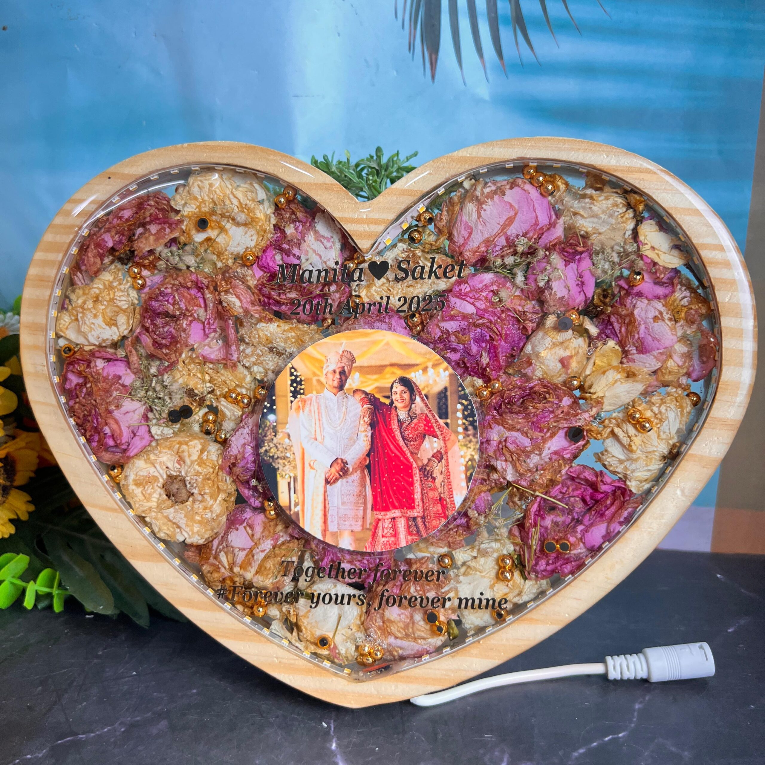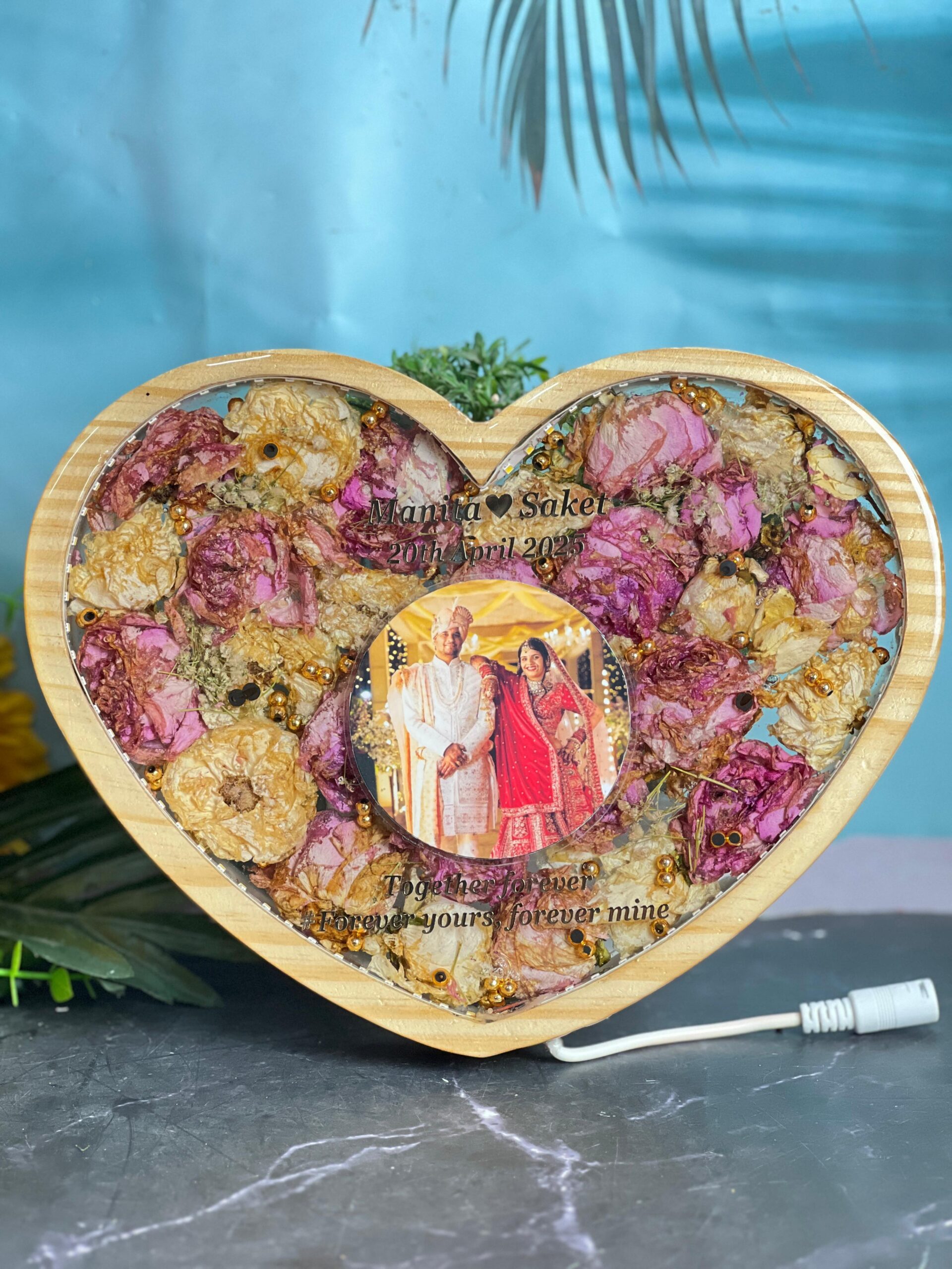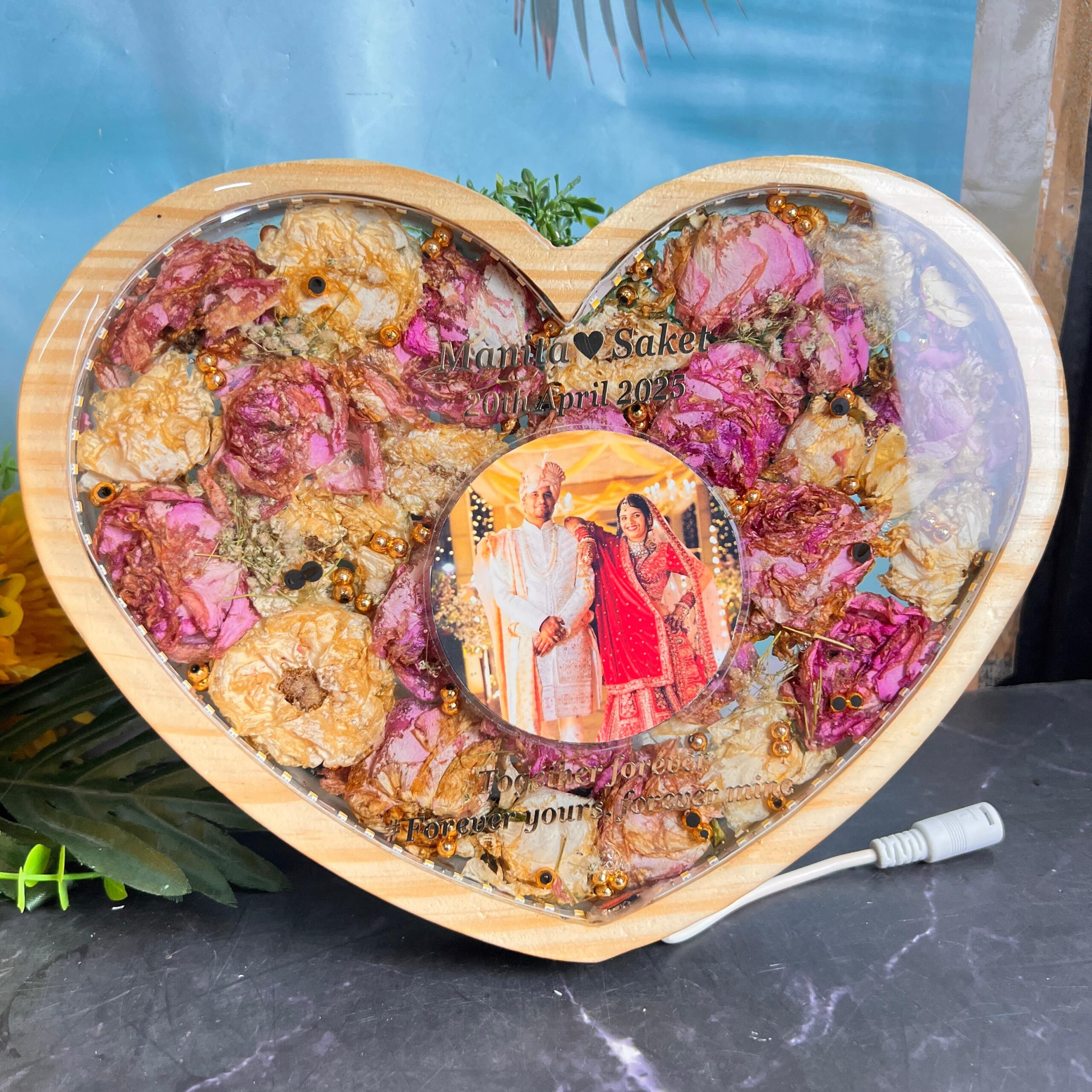 This heart-shaped resin frame is filled with real varmala flowers in soft pink and yellow shades. Your wedding photo shines in the middle, and warm LED lights glow around the heart. The names, date, and a sweet quote make it even more special. All flowers are fully dried and sealed in resin to last forever. This piece is not just decor—it’s your love story in a frame. Perfect for couples who want to keep their big day close to their heart.