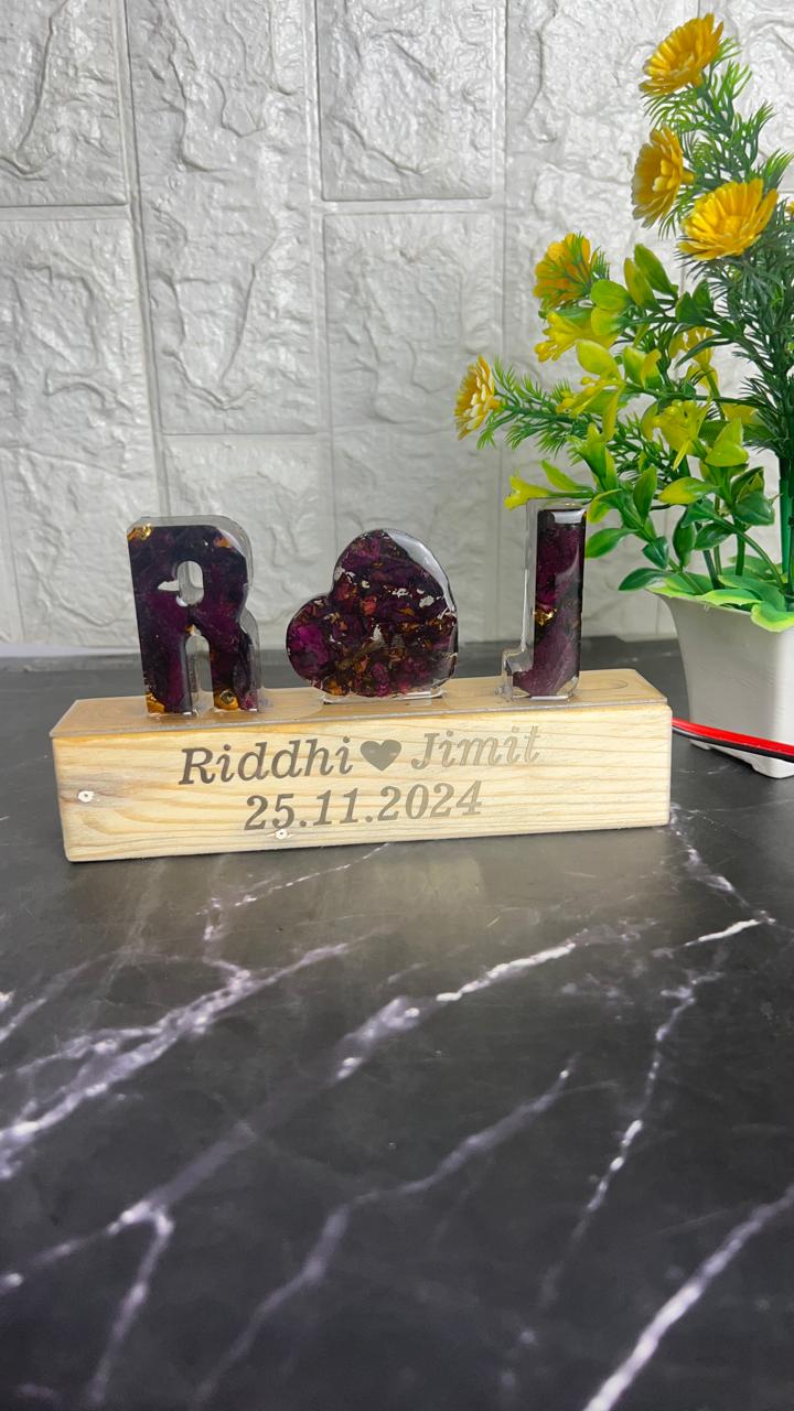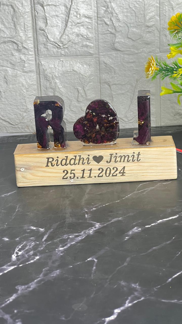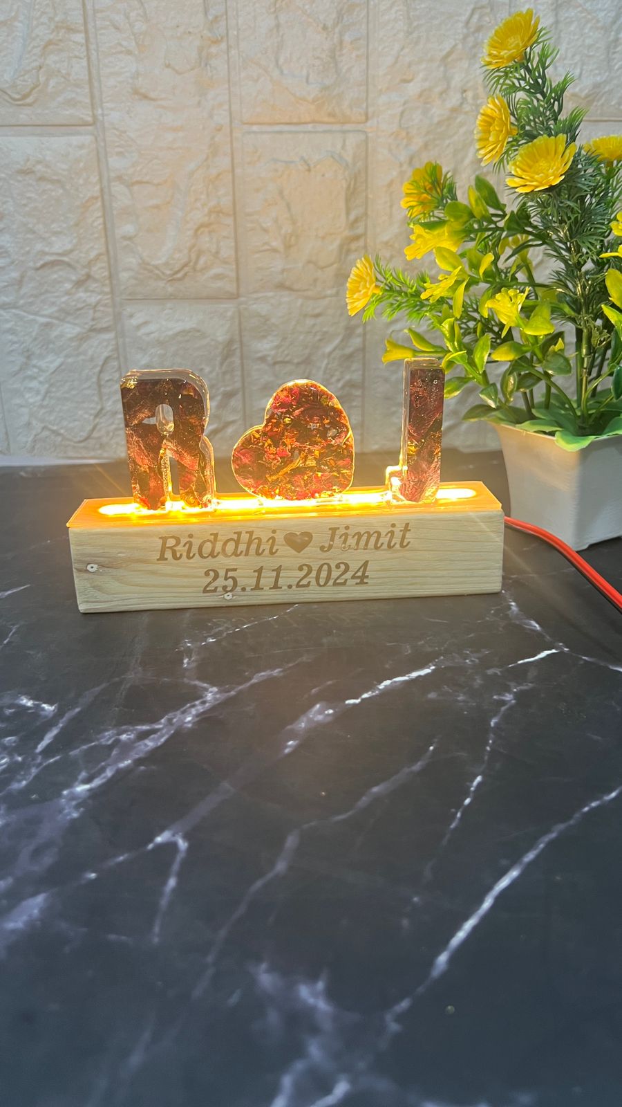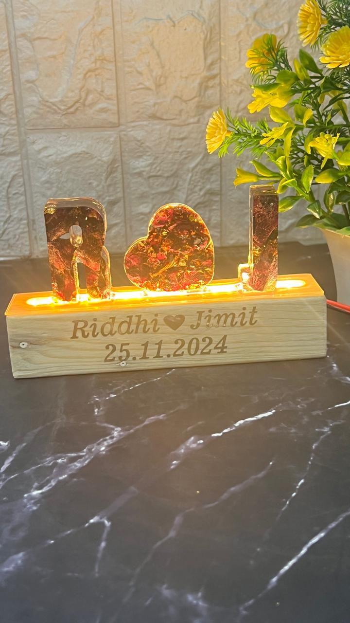 Designed for couples, this handmade resin night lamp is perfect for home décor, anniversary gifts, or a wedding gift. The wooden base includes custom engraving of names and the wedding date, making it a timeless memory preservation lamp.