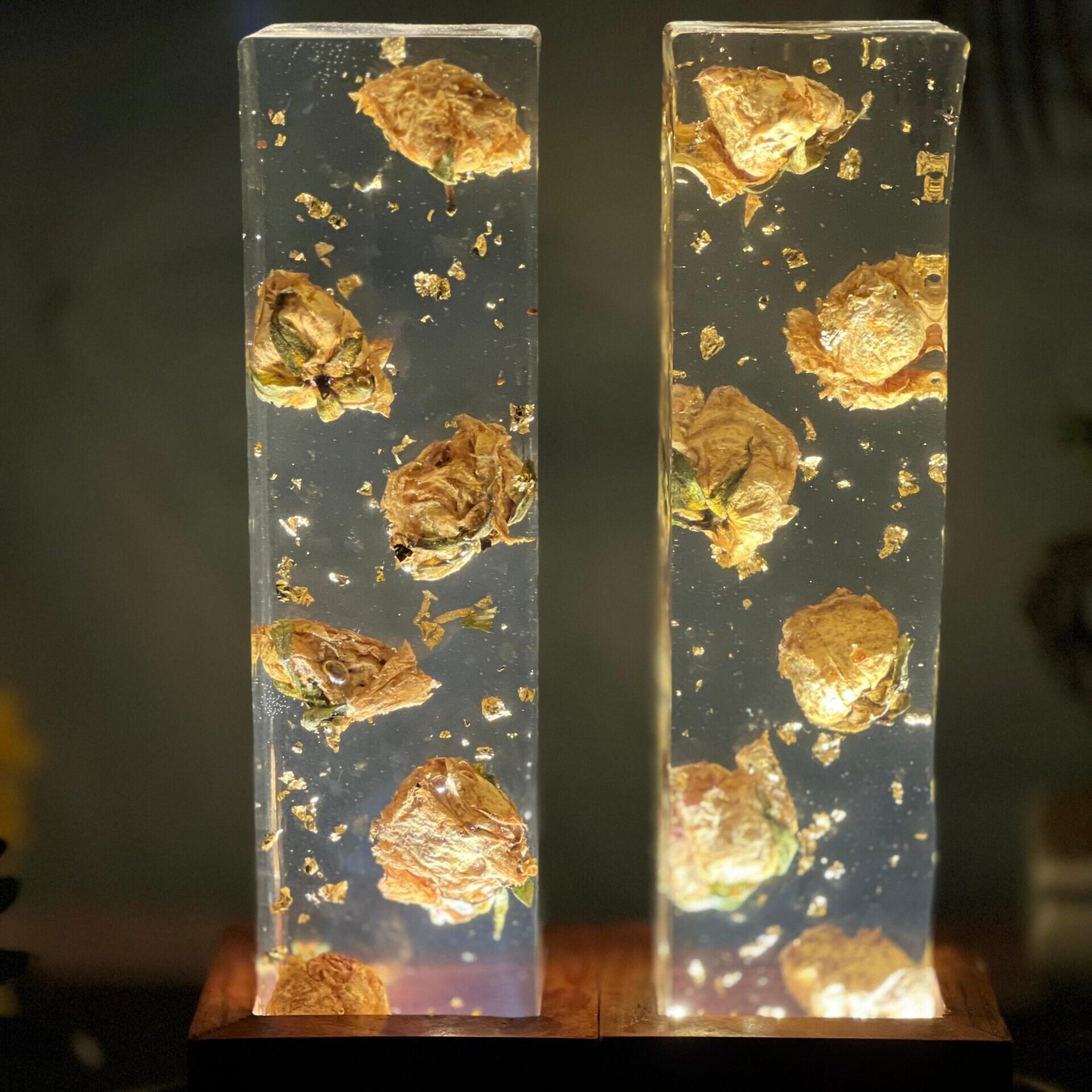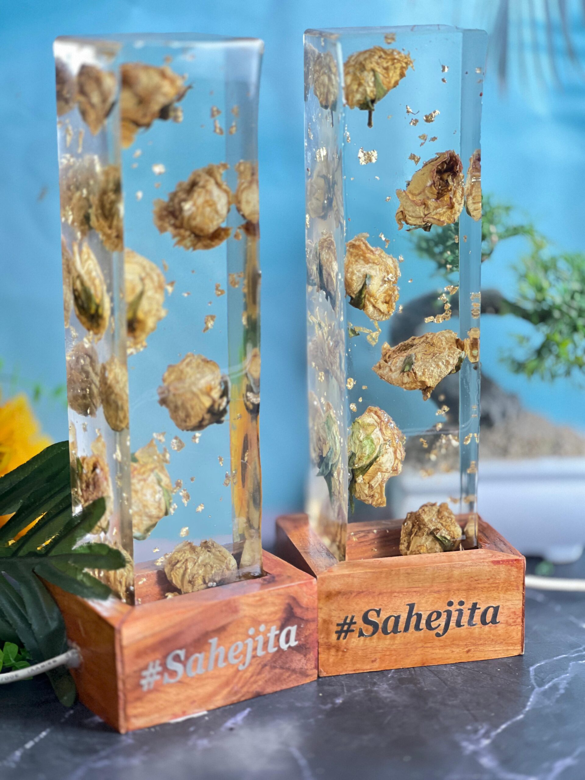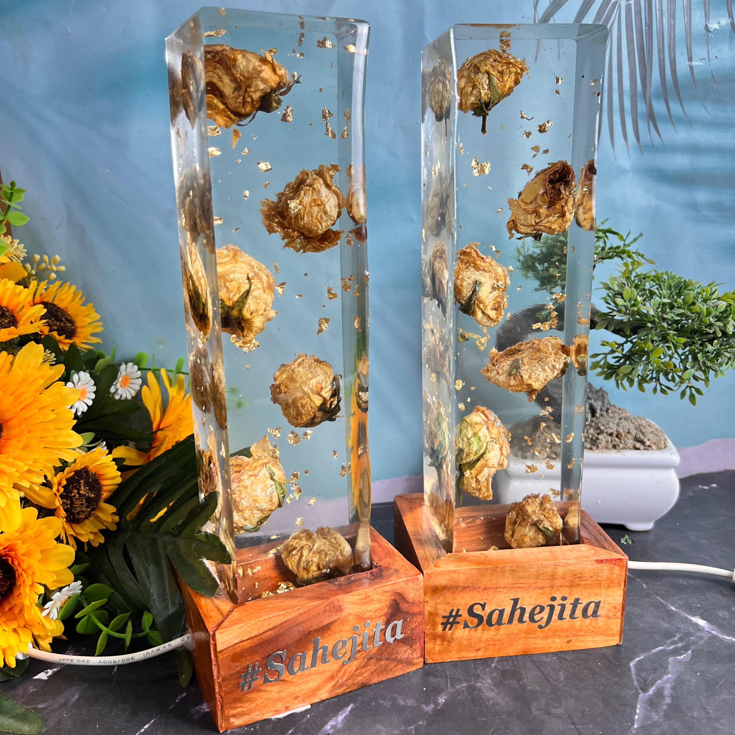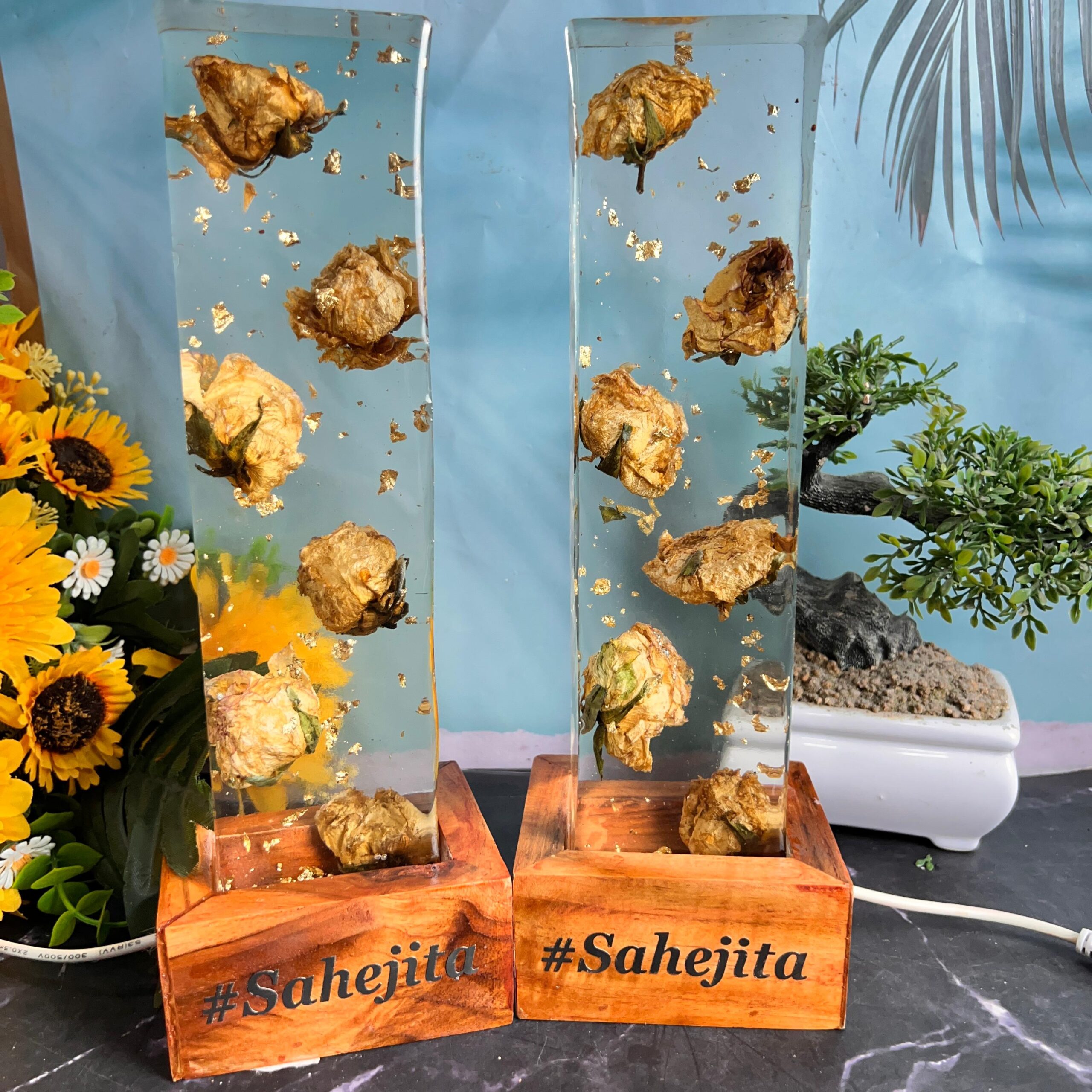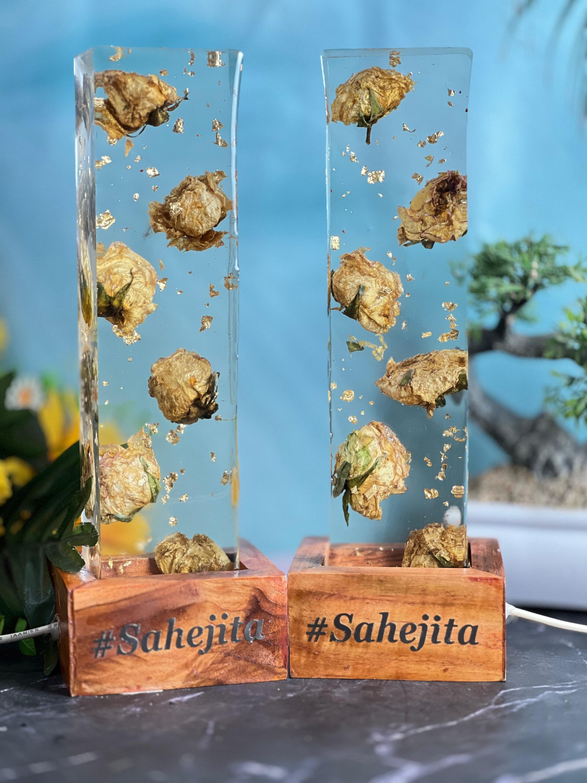 This elegant resin LED lamp is made using real varmala flowers from your wedding day, carefully preserved forever in a crystal-clear resin. The block includes golden flakes that enhance its beauty and luxury feel. Mounted on a sleek wooden base with built-in LED lighting, this decor piece glows warmly and adds charm to any space.