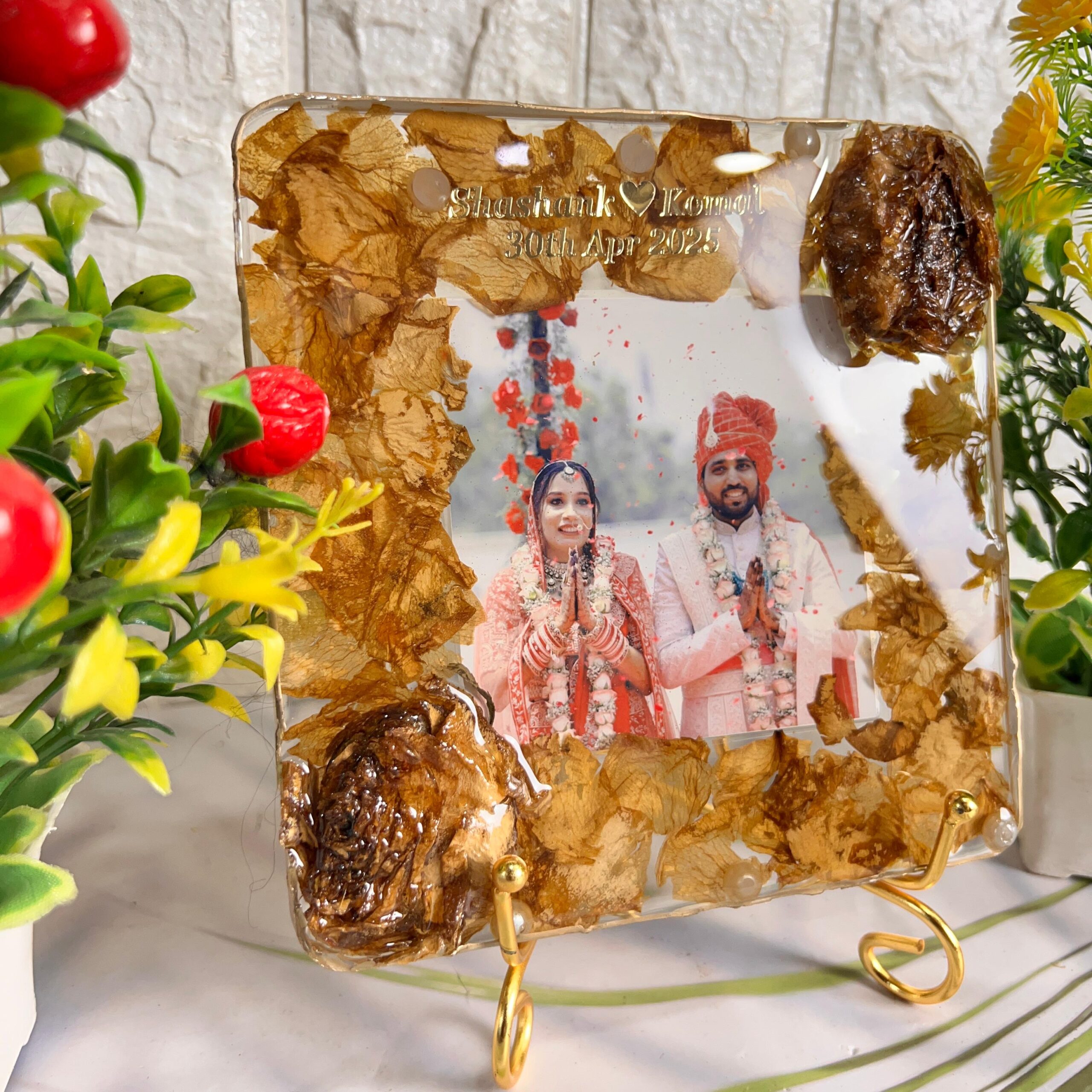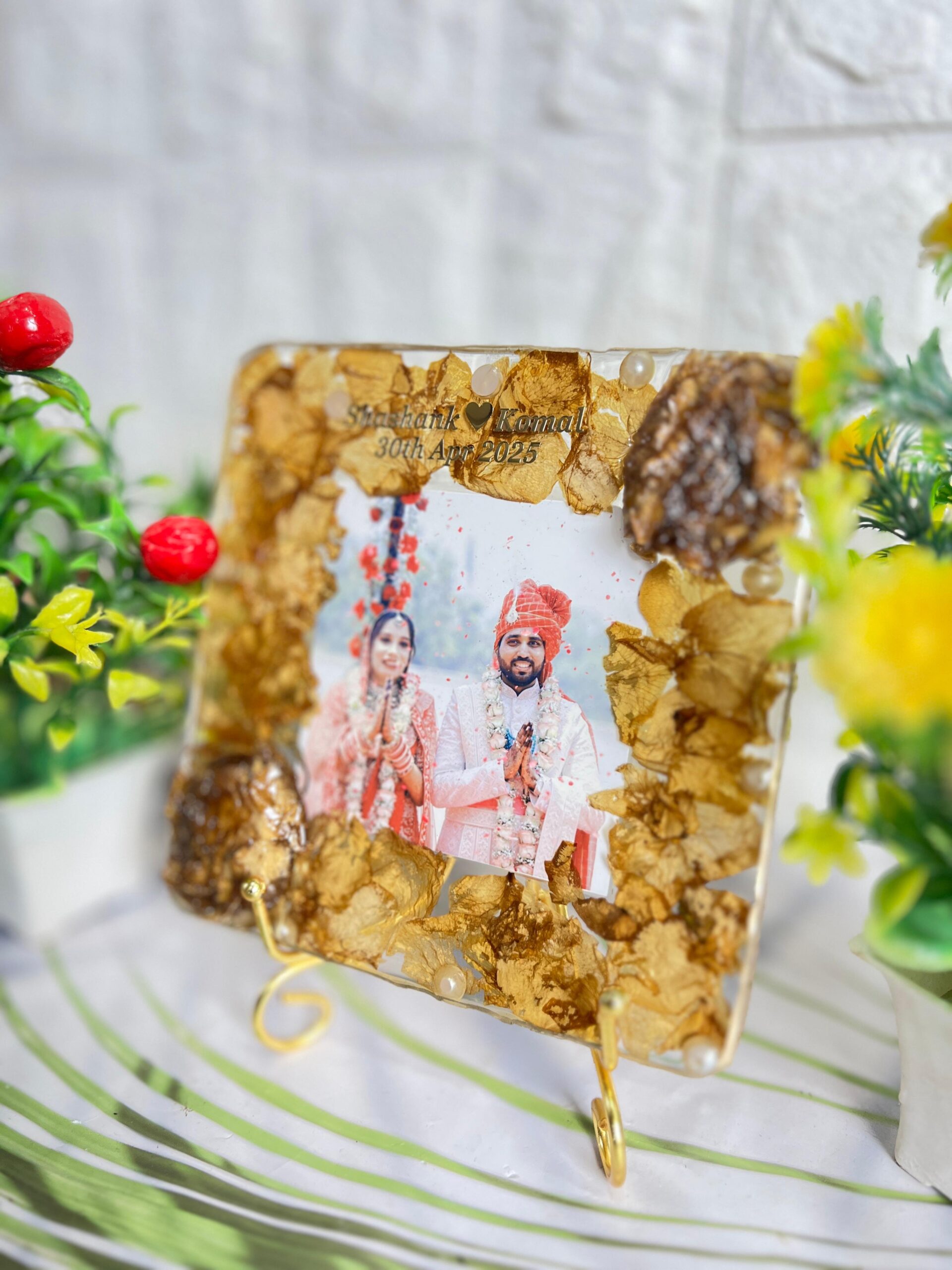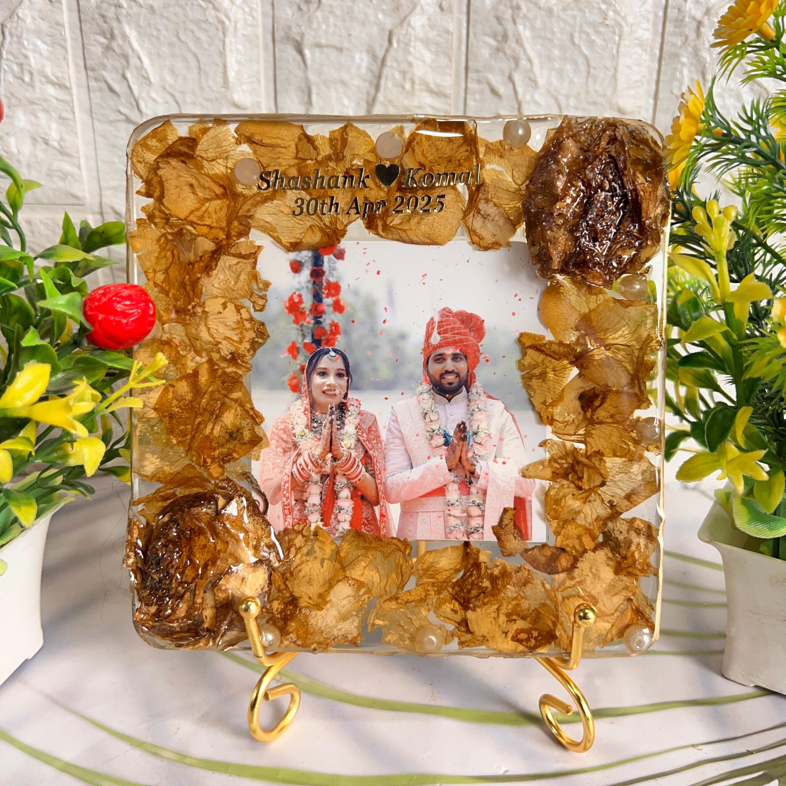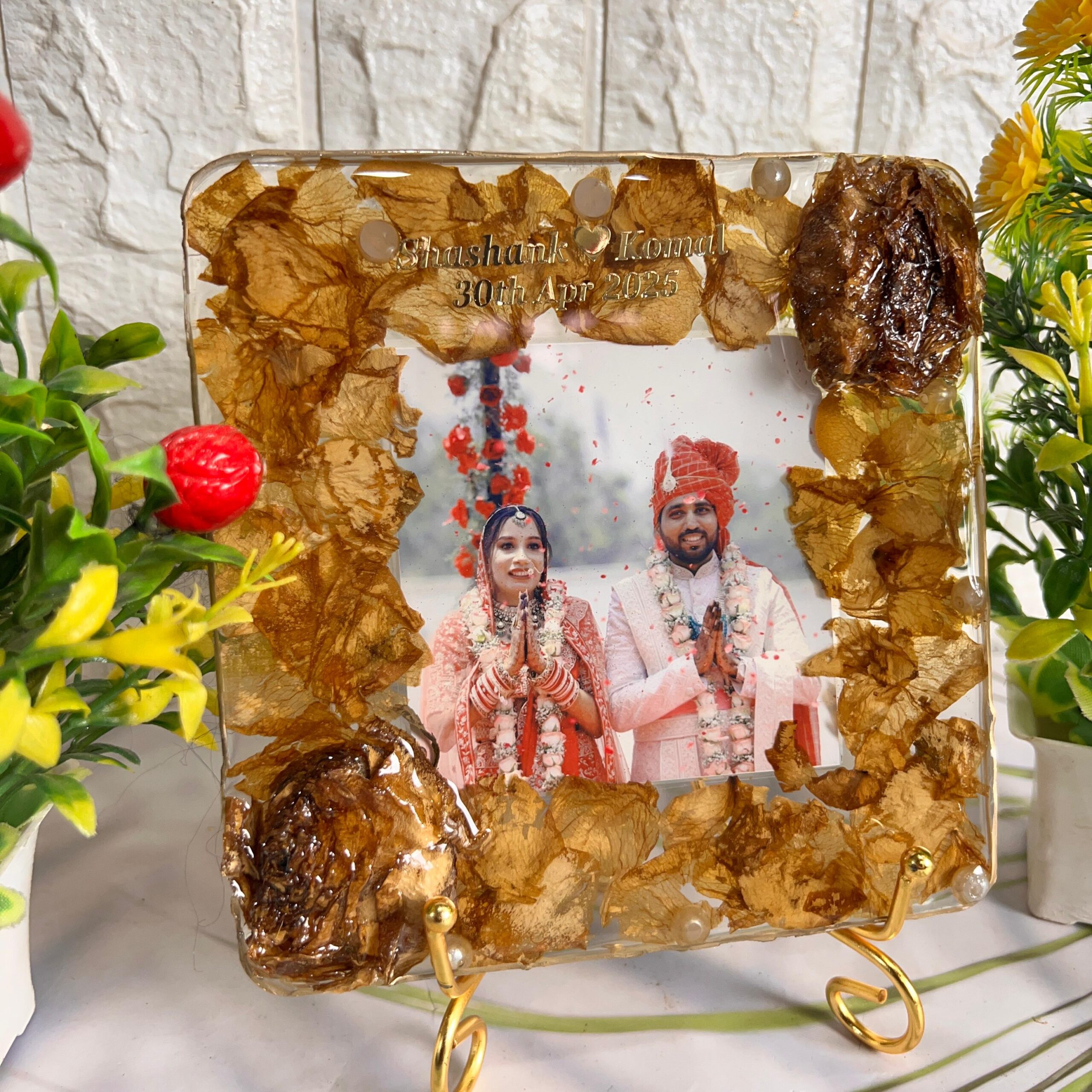 This resin photo frame is a perfect memory piece from your wedding day. It beautifully preserves real varmala flowers and your favourite wedding photo in a stylish (6) inch square frame. The couple’s names and wedding date are also added to make it extra special. The flowers are sealed inside the resin, so they will stay fresh-looking for years. This is more than a photo frame—it’s your wedding moment frozen forever.