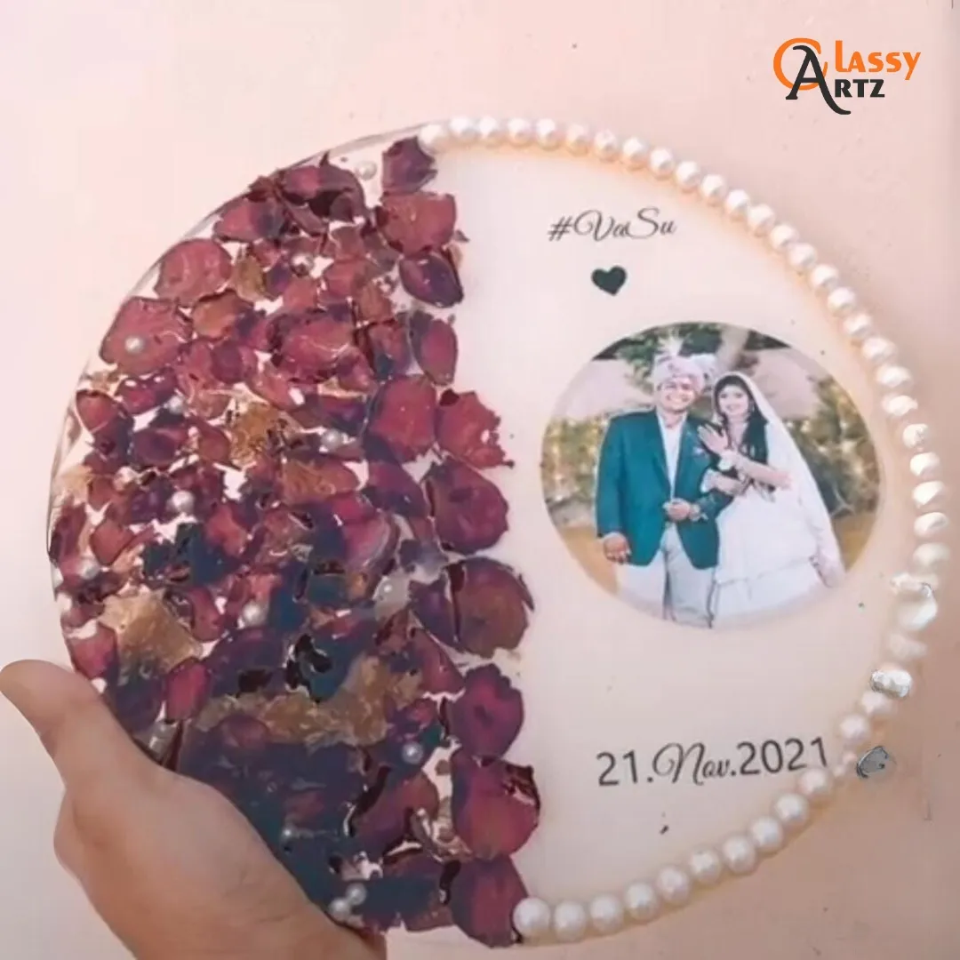 We carefully preserve your real varmala flowers inside clear epoxy resin, so they stay beautiful for years. The round pearl border gives it a rich, classy look, and your couple hashtag and wedding date make it more personal and special.