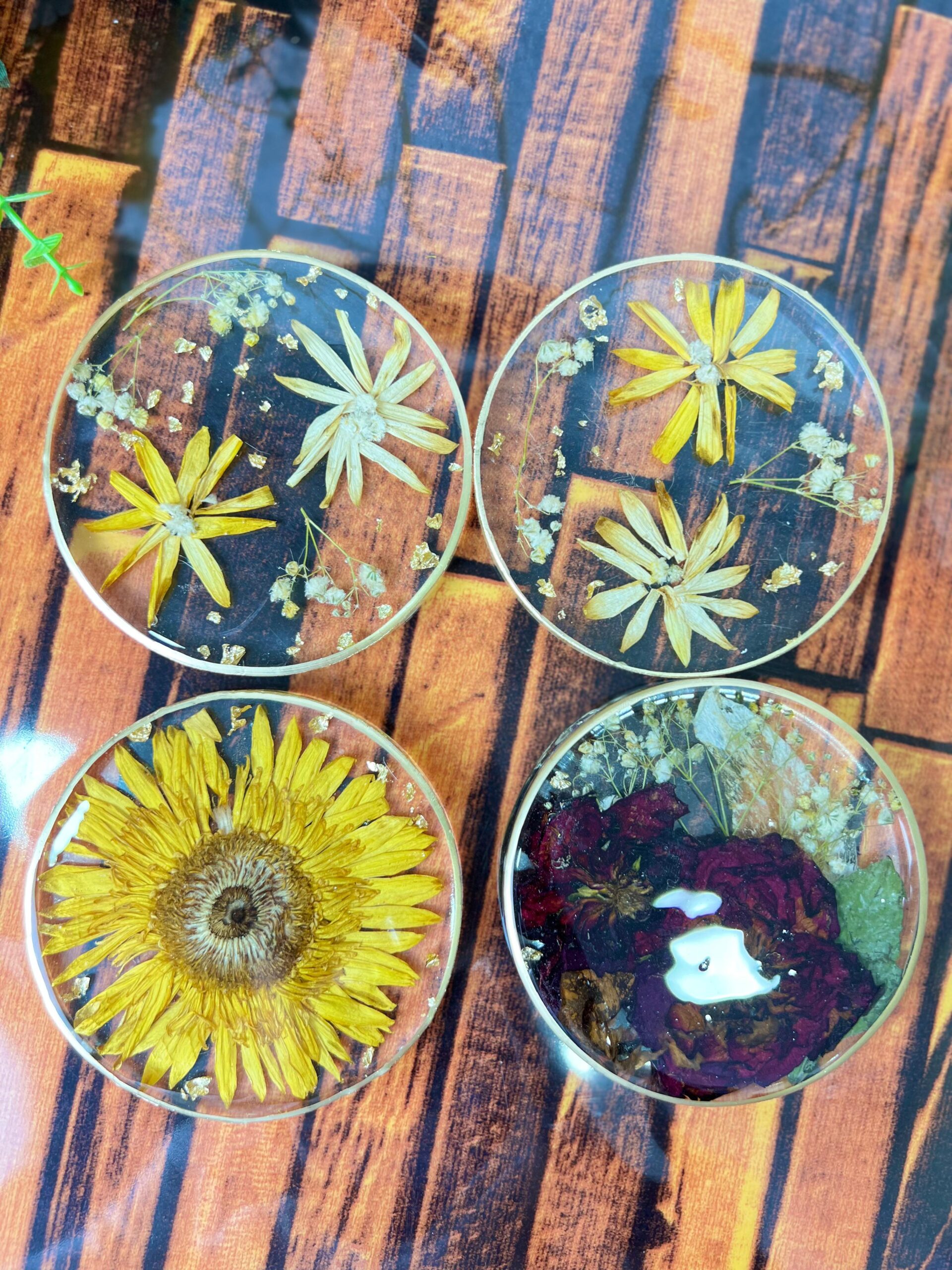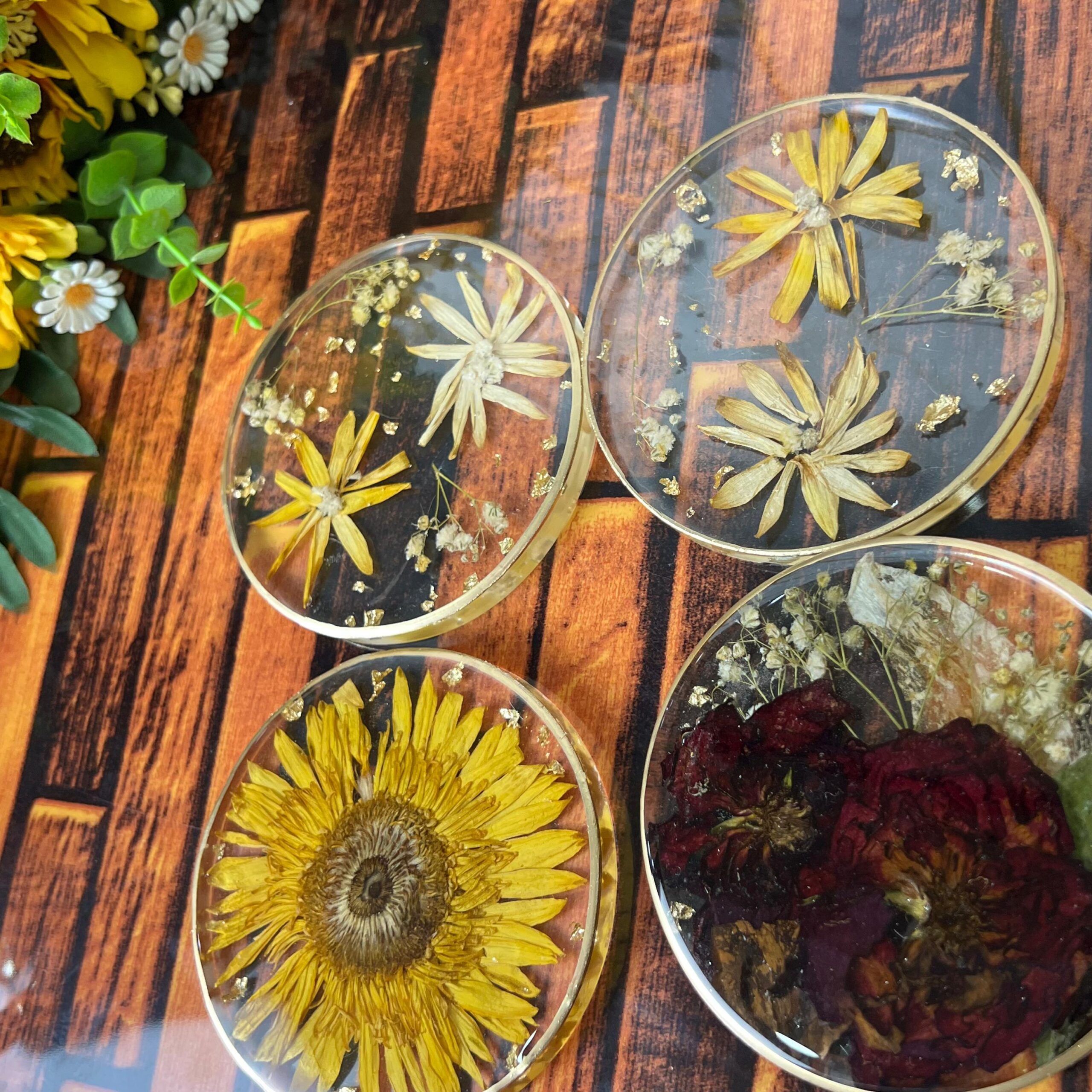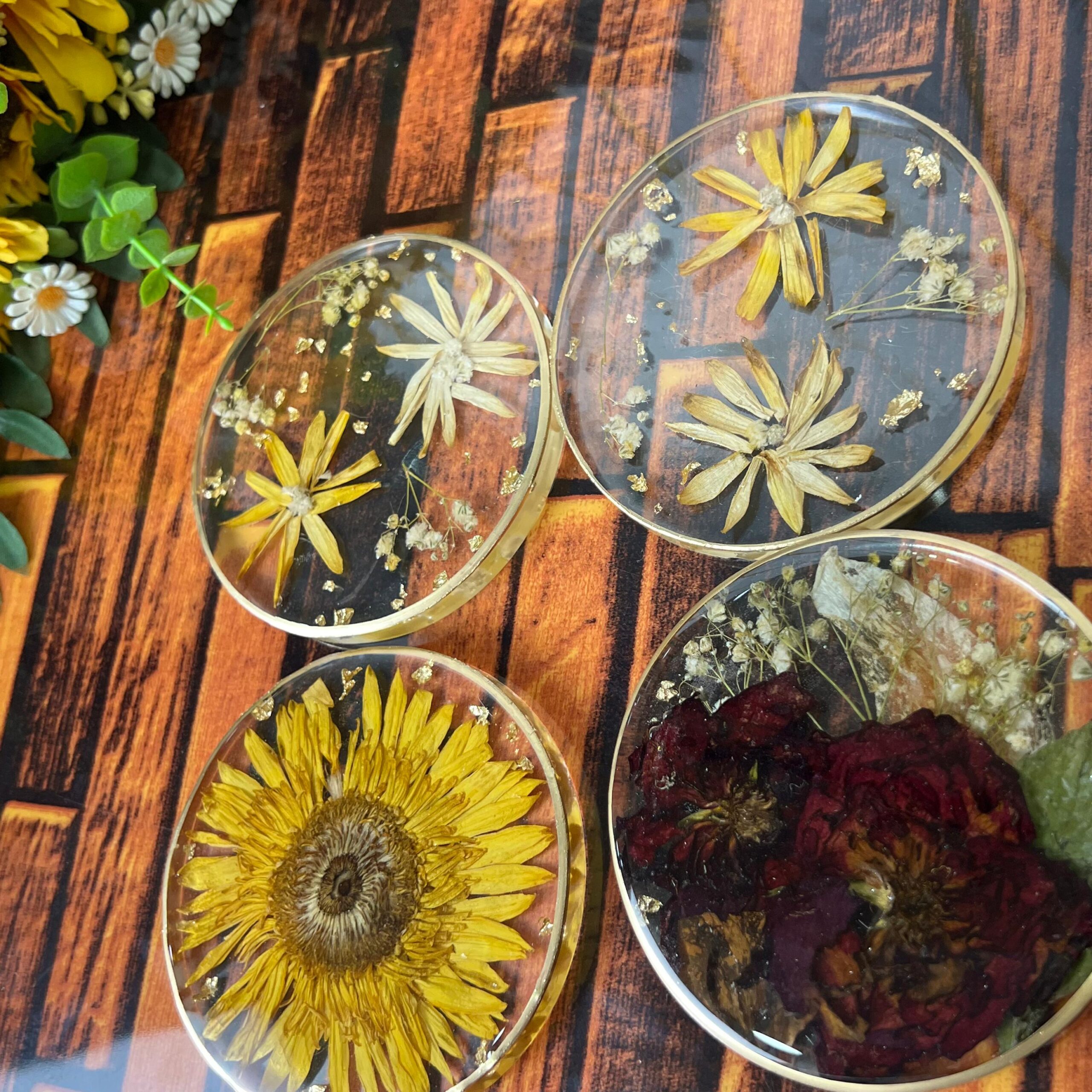 This Resin Coaster Set is made with real preserved flowers, giving a natural and elegant look to your table or décor. Each piece is carefully handmade by our skilled team.
