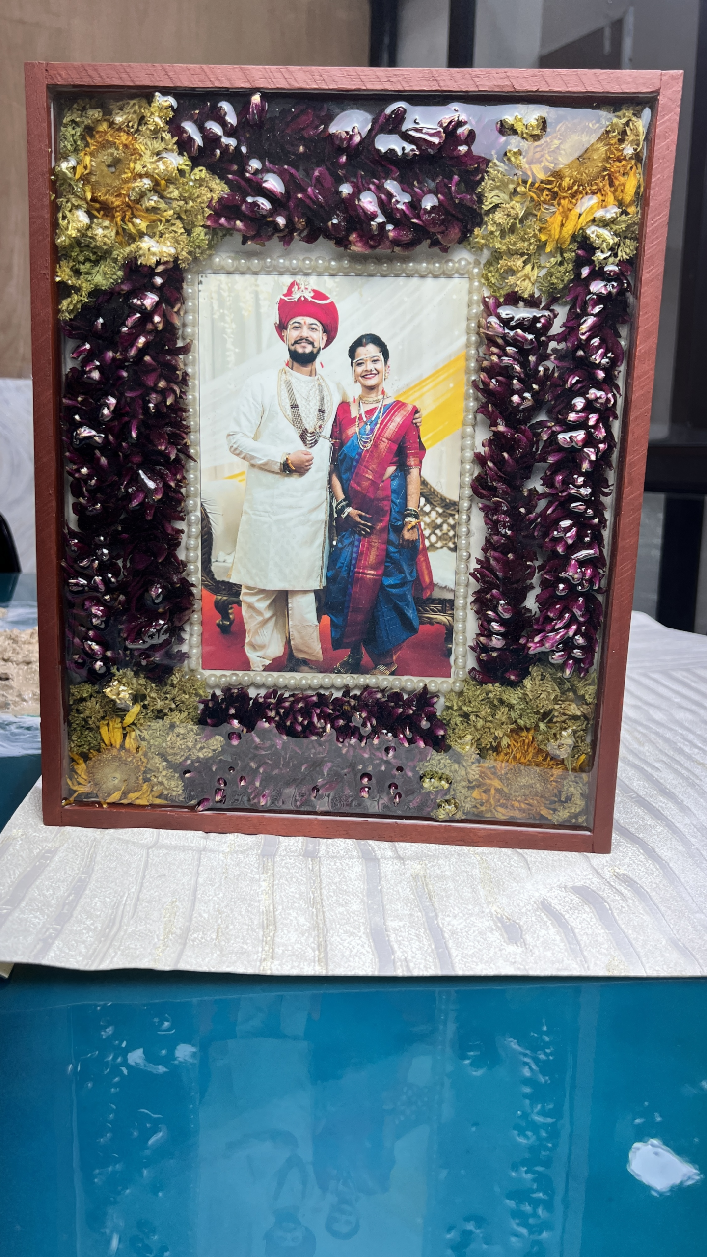 • Couple Photo & Pearl Embellishments: The couple photo is framed within the preserved flowers, with added pearls for a touch of elegance and charm.