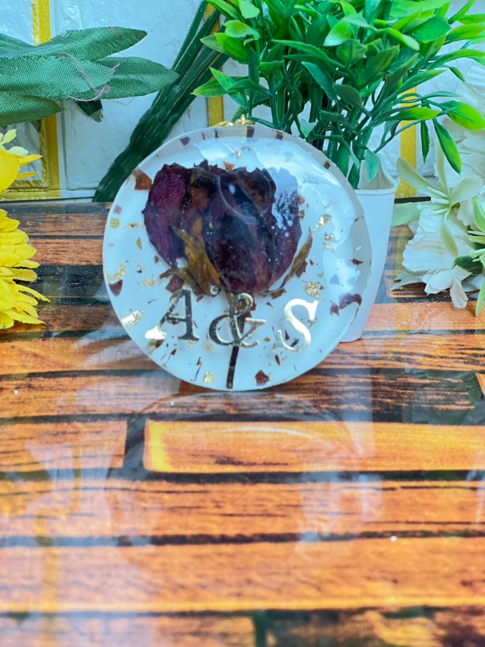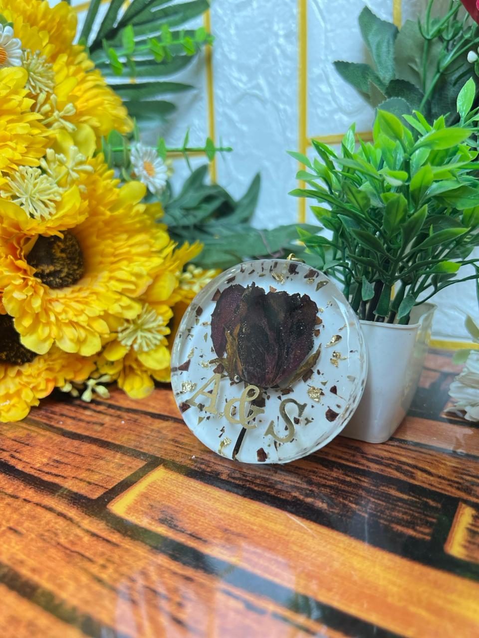 This round resin keychain pair is a sweet way to carry your memory with you every day. Each piece has real rose petals locked inside clear resin, giving it a soft and pretty look. One keychain carries a dried rose with custom initials, and the other has a gold rim with a simple symbol inside. Both shine nicely and stay strong for long use.