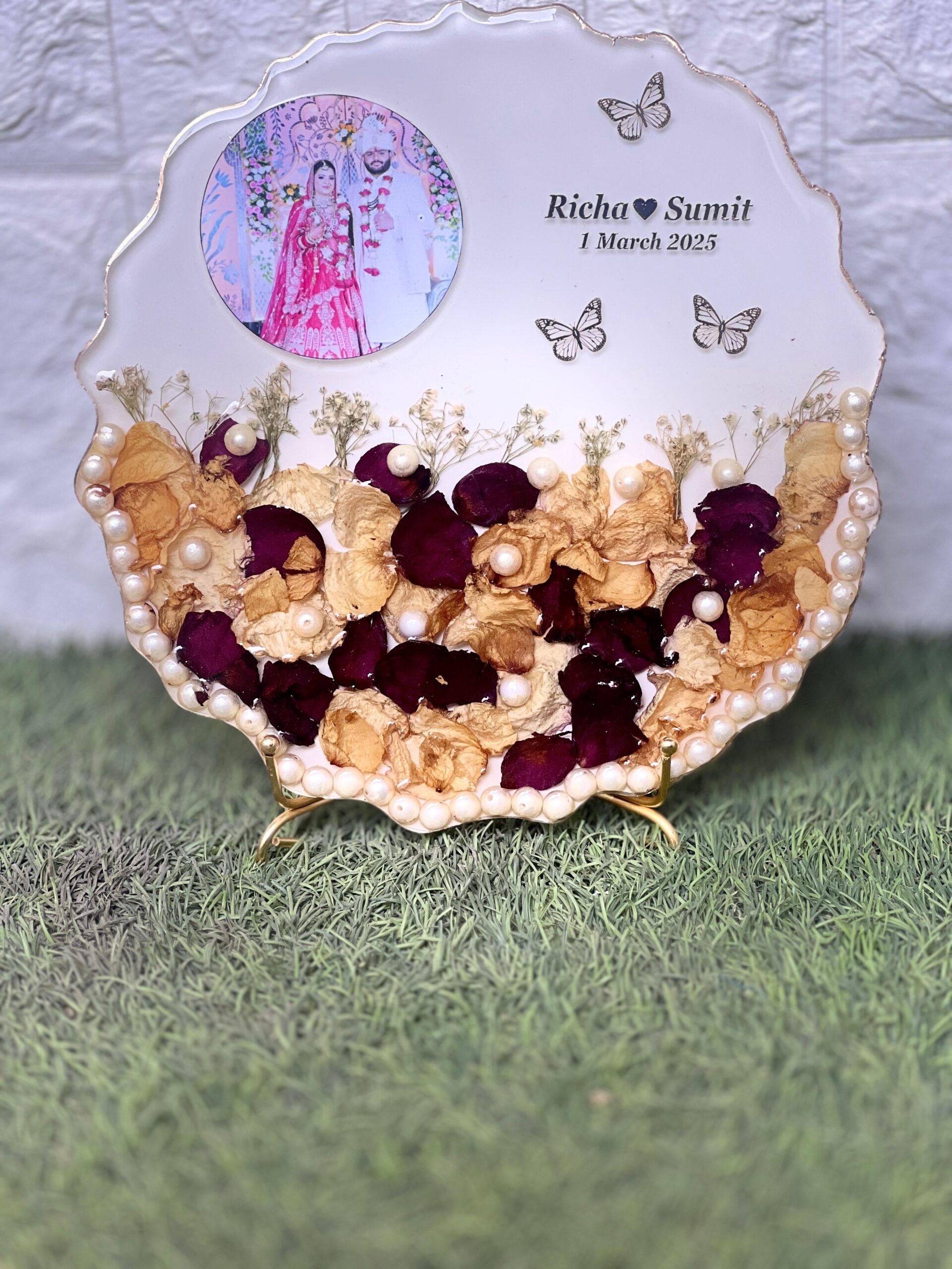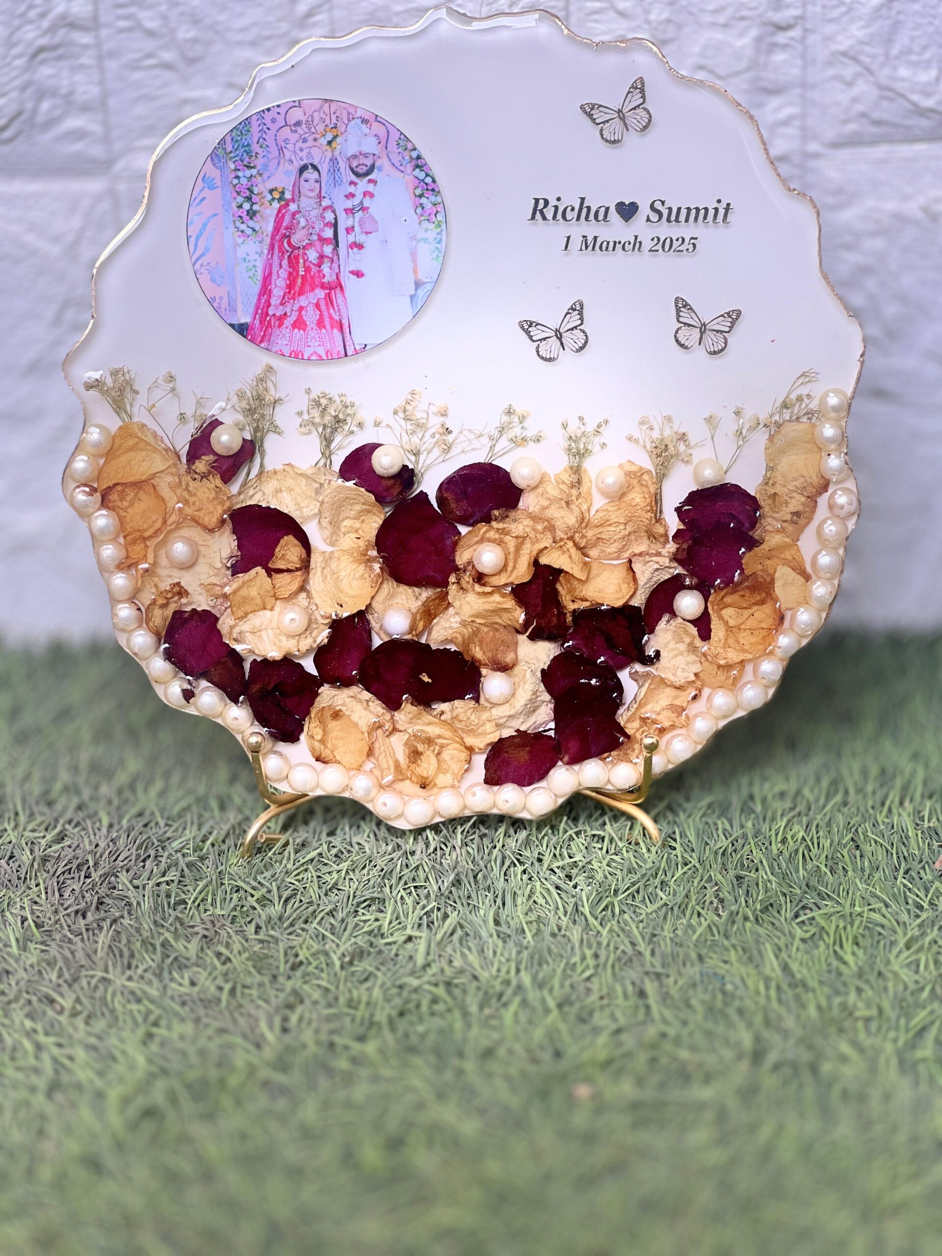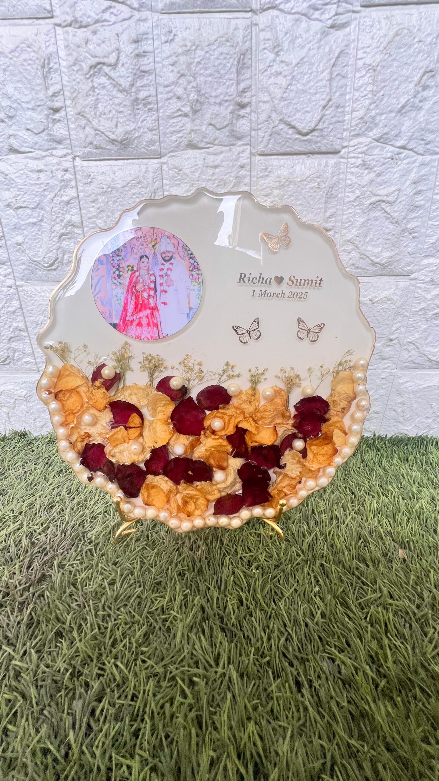 This Resin Plate with Wedding Photo & Varmala Flowers is a beautiful way to keep wedding memories alive forever. Made from real preserved varmala petals, dry flowers, and pearls, this resin plate is a unique memory gift for couples. The round shape with wavy edges gives it an elegant look.