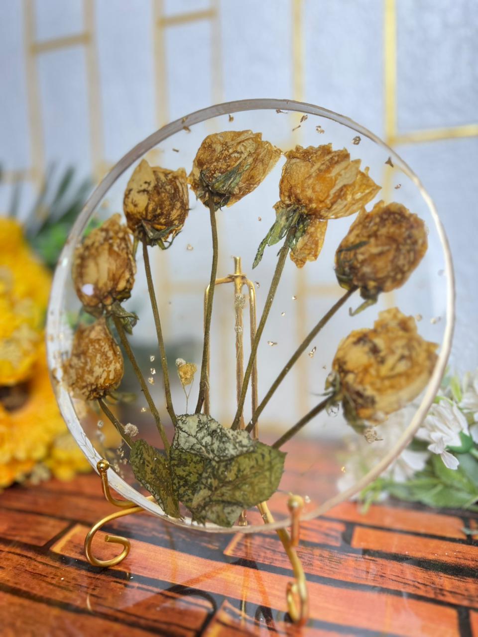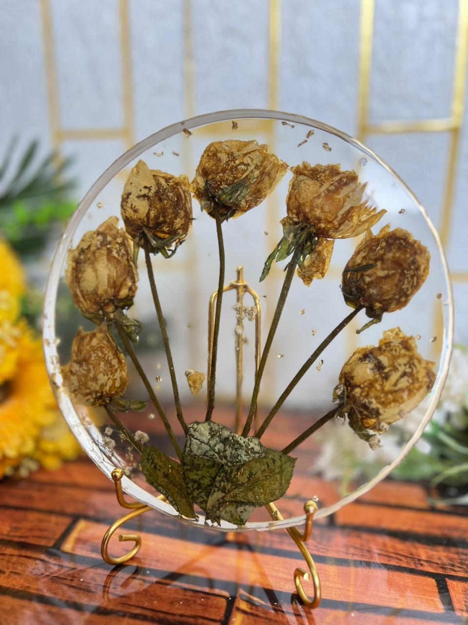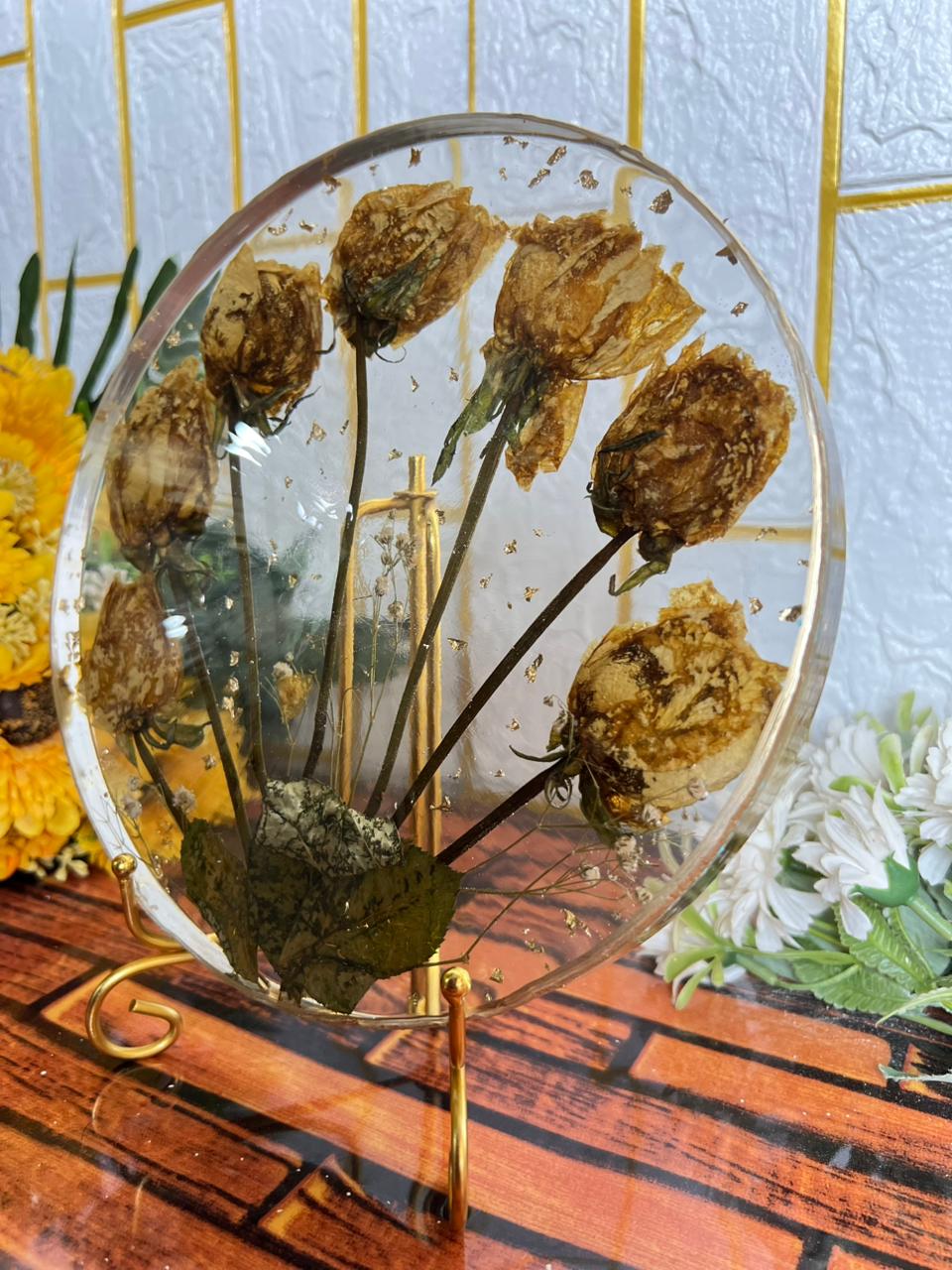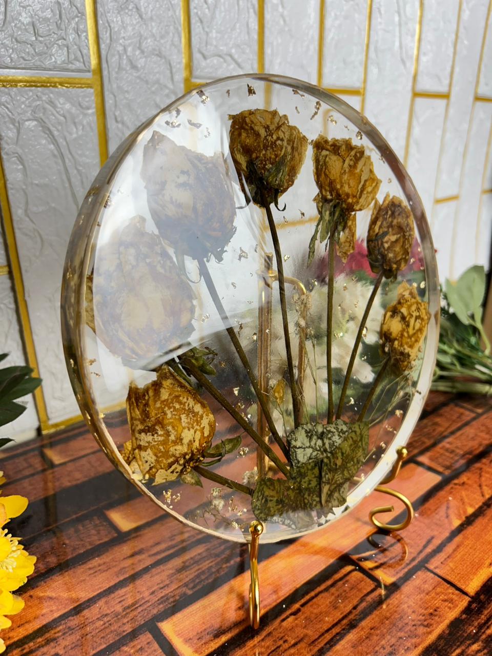 This round resin flower frame is made to protect your varmala roses in a calm and graceful way. Each dried rose is placed gently so the frame feels natural, soft, and emotionally connected. The circular shape gives the piece a peaceful look that fits easily into any home setting. It does not feel heavy or crowded, making the flowers the true focus of the design. Created for those who like simplicity, this frame helps you hold on to a real moment from your special day. The preserved roses keep their natural dry beauty, while the lightweight yet strong build lets you enjoy the memory from every angle for years.
