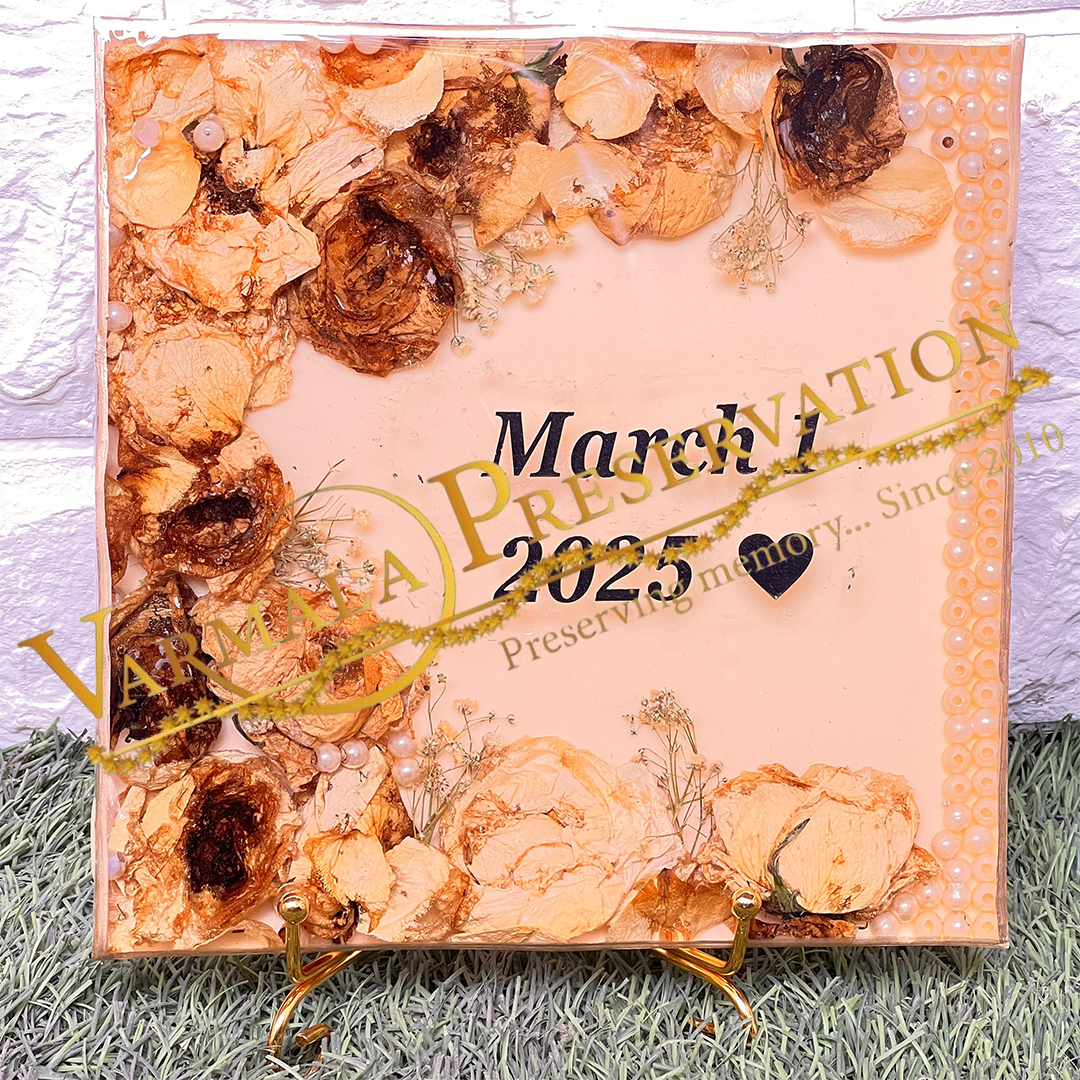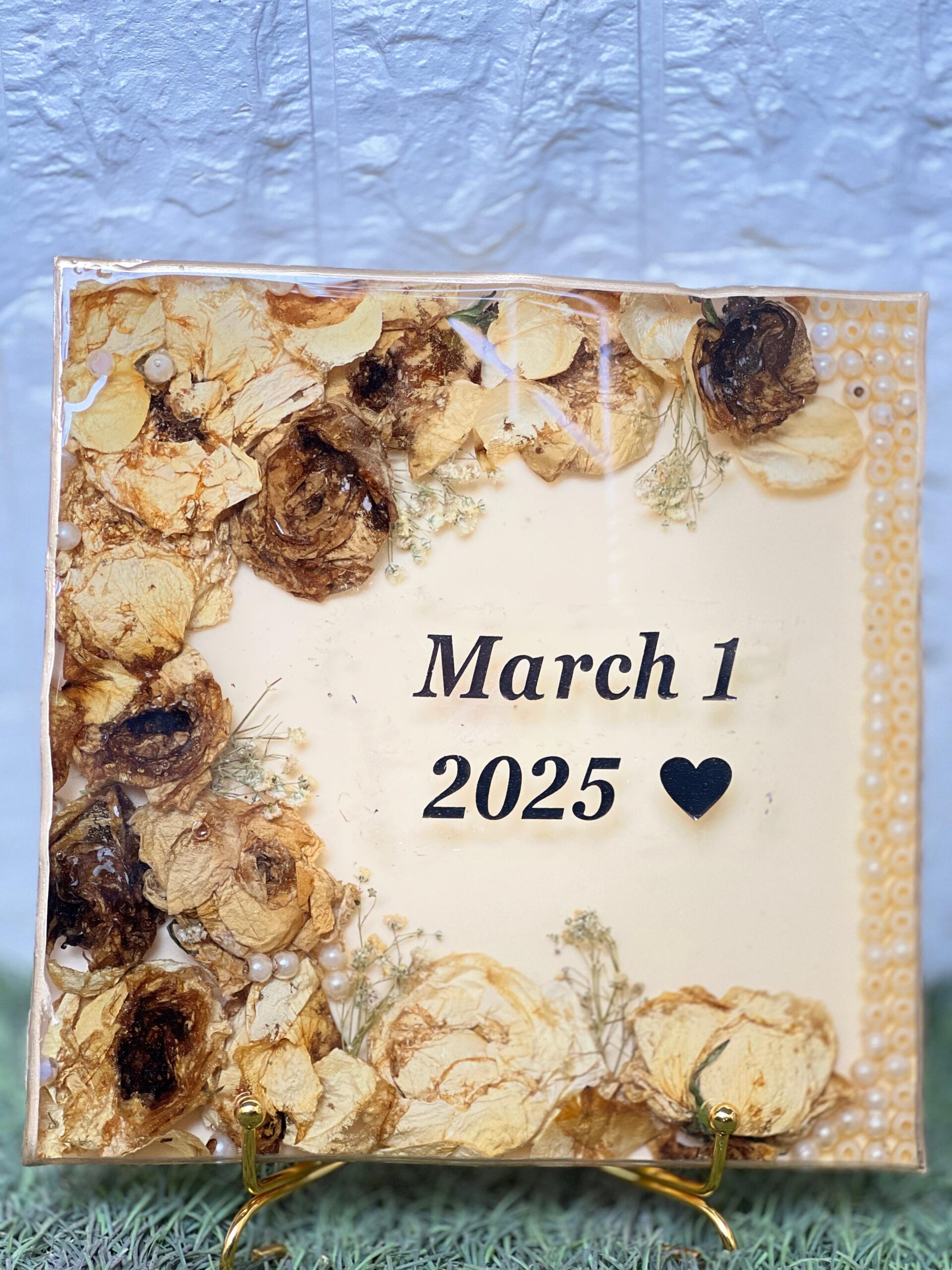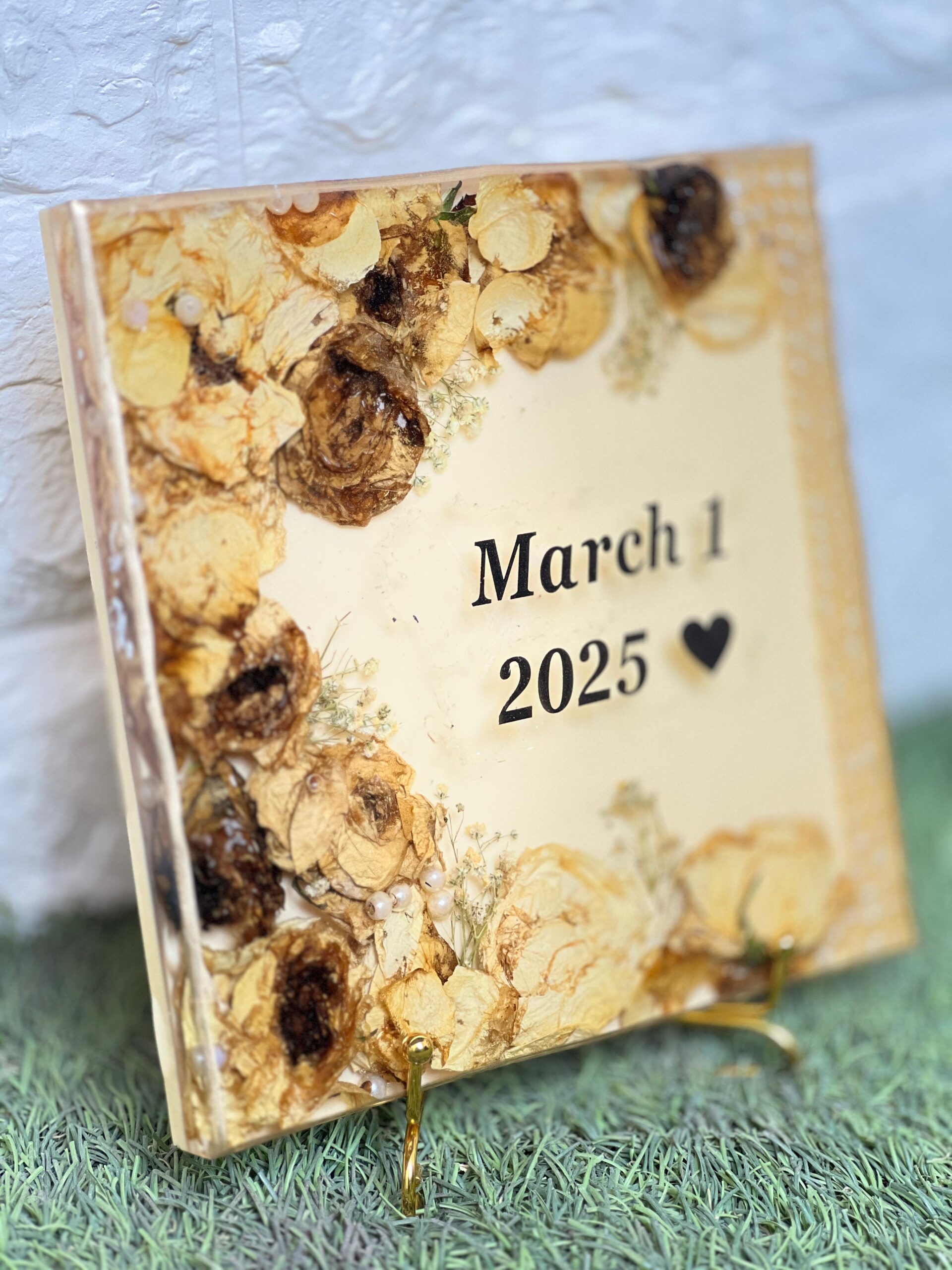 Celebrate your wedding memories with this elegant Square Resin Frame with Preserved Wedding Flowers and Custom Date. Designed using real wedding flowers, dried fillers, and pearls, this keepsake captures the beauty of your special day. The custom wedding date is placed at the center, making it a meaningful reminder of your forever bond.