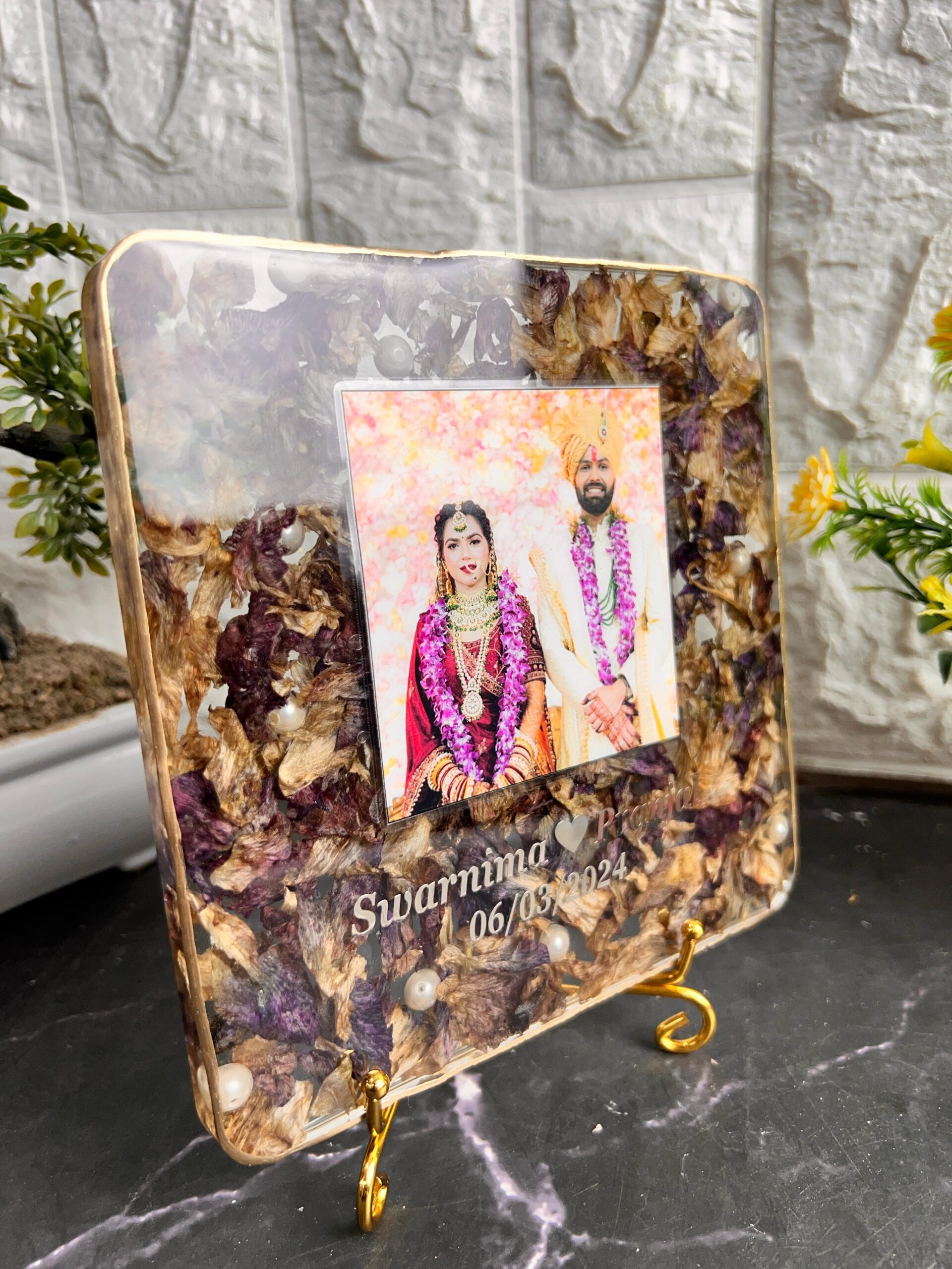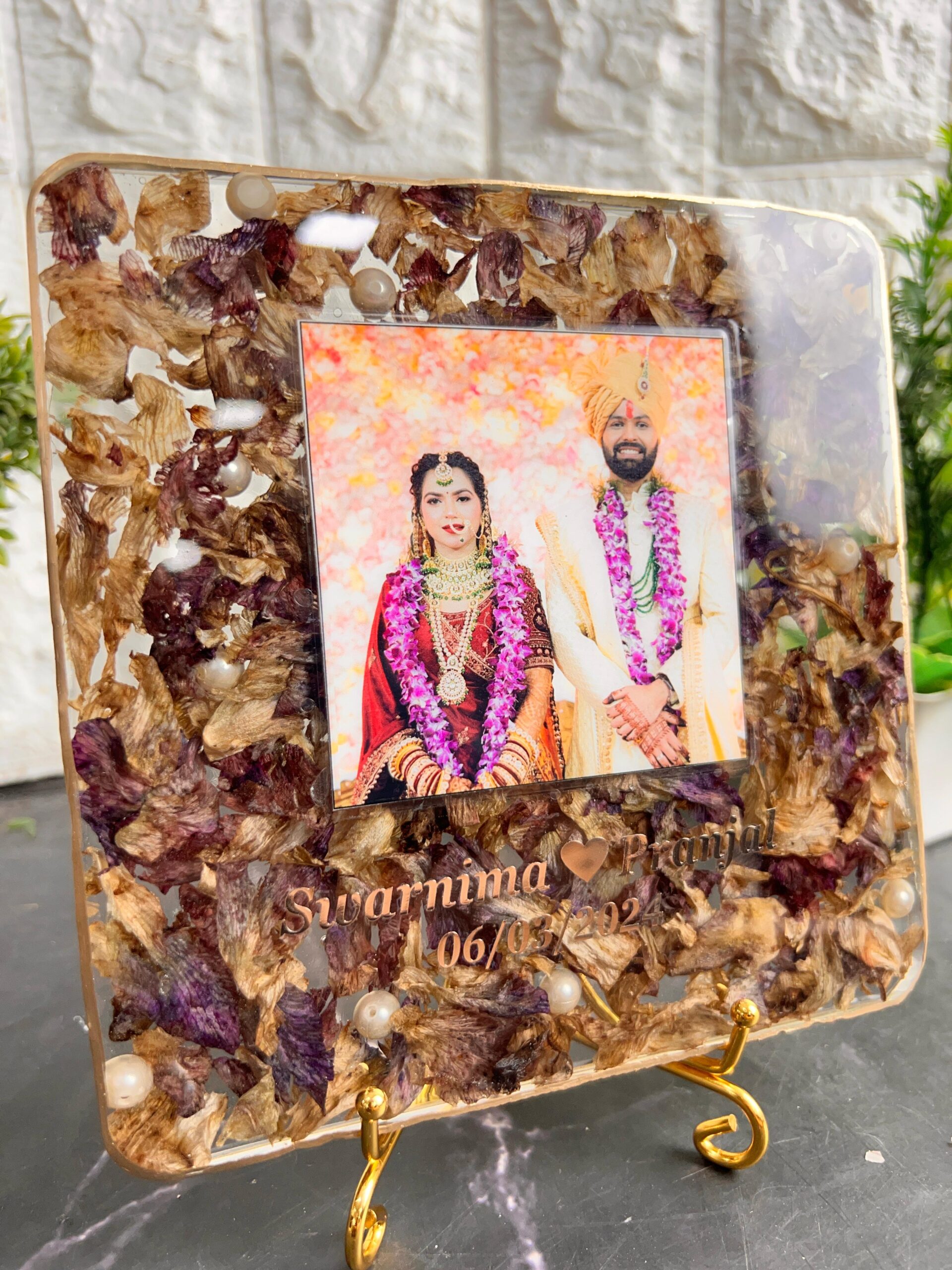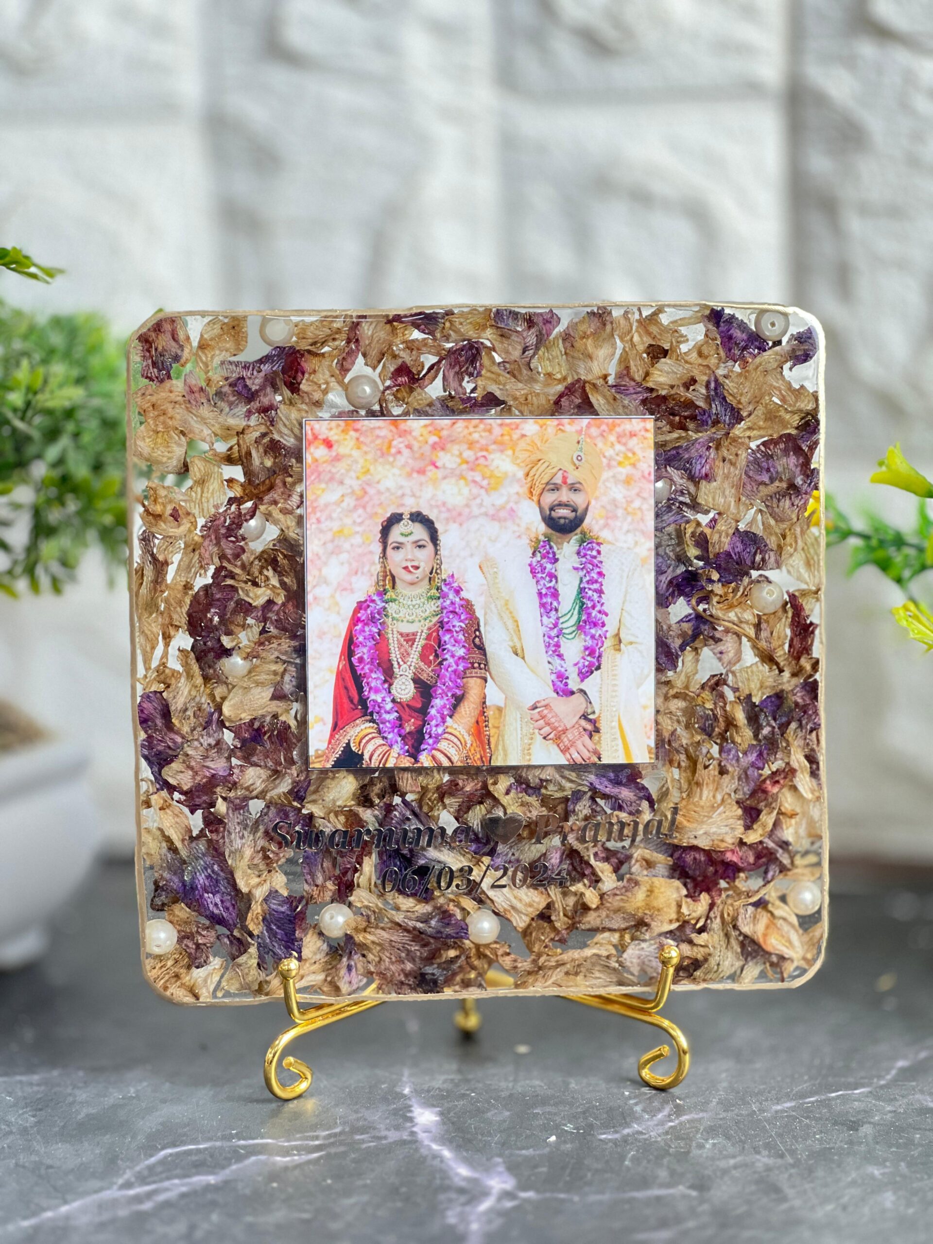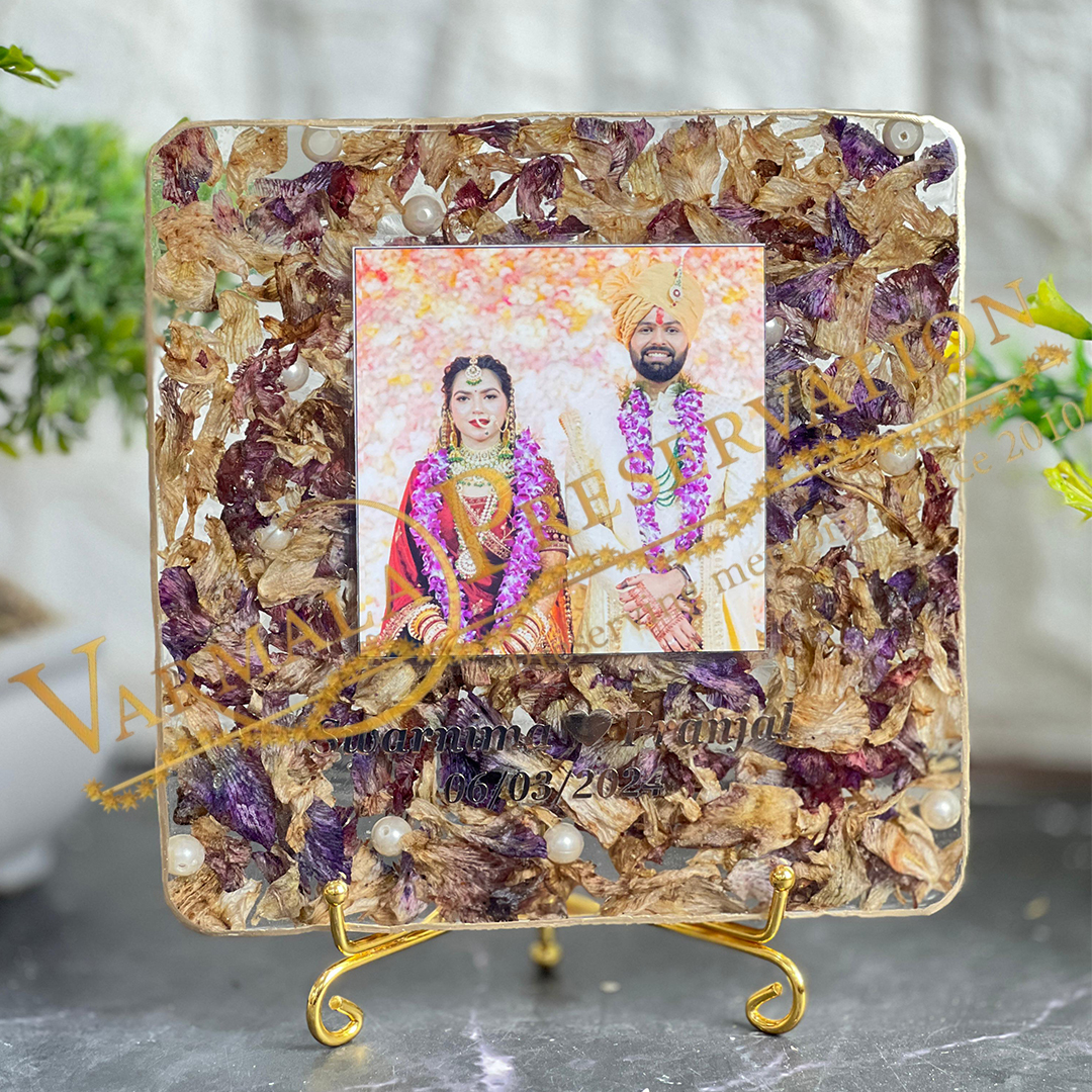 This Square Resin Varmala Flower Photo Frame is a beautiful and unique way to save your wedding day memories forever. The frame is handcrafted using real varmala petals and your favorite wedding photo, sealed perfectly inside clear epoxy resin.