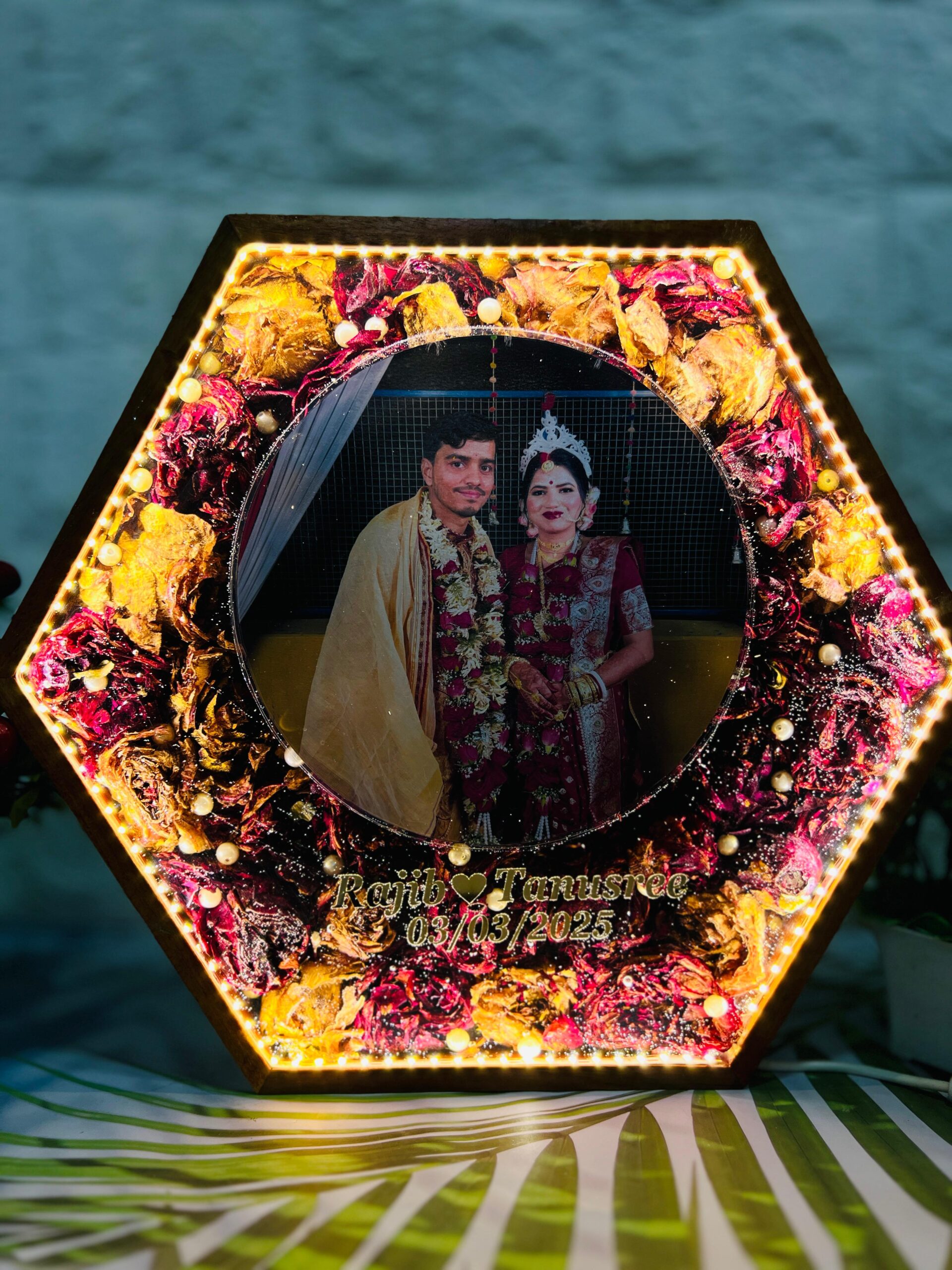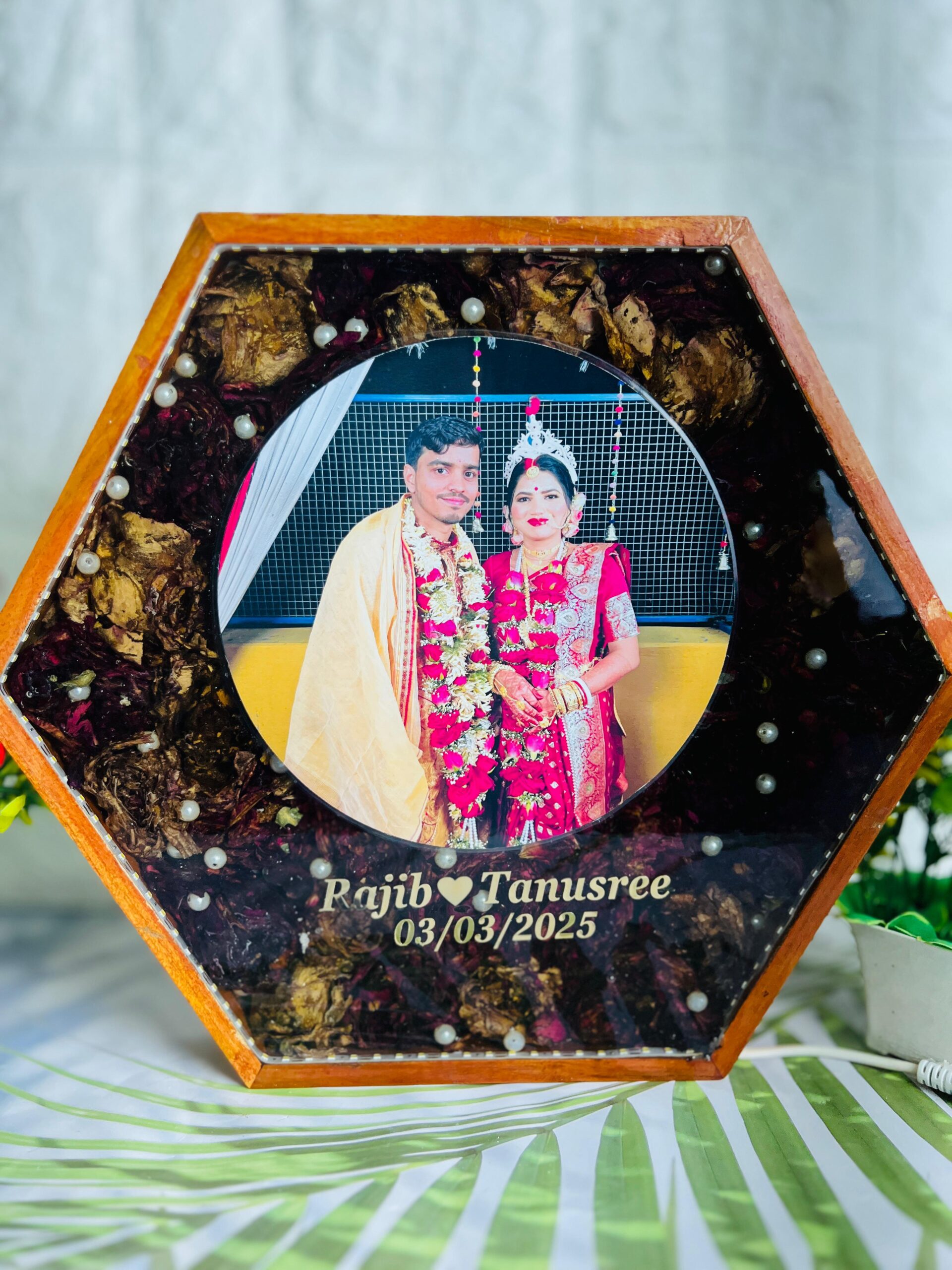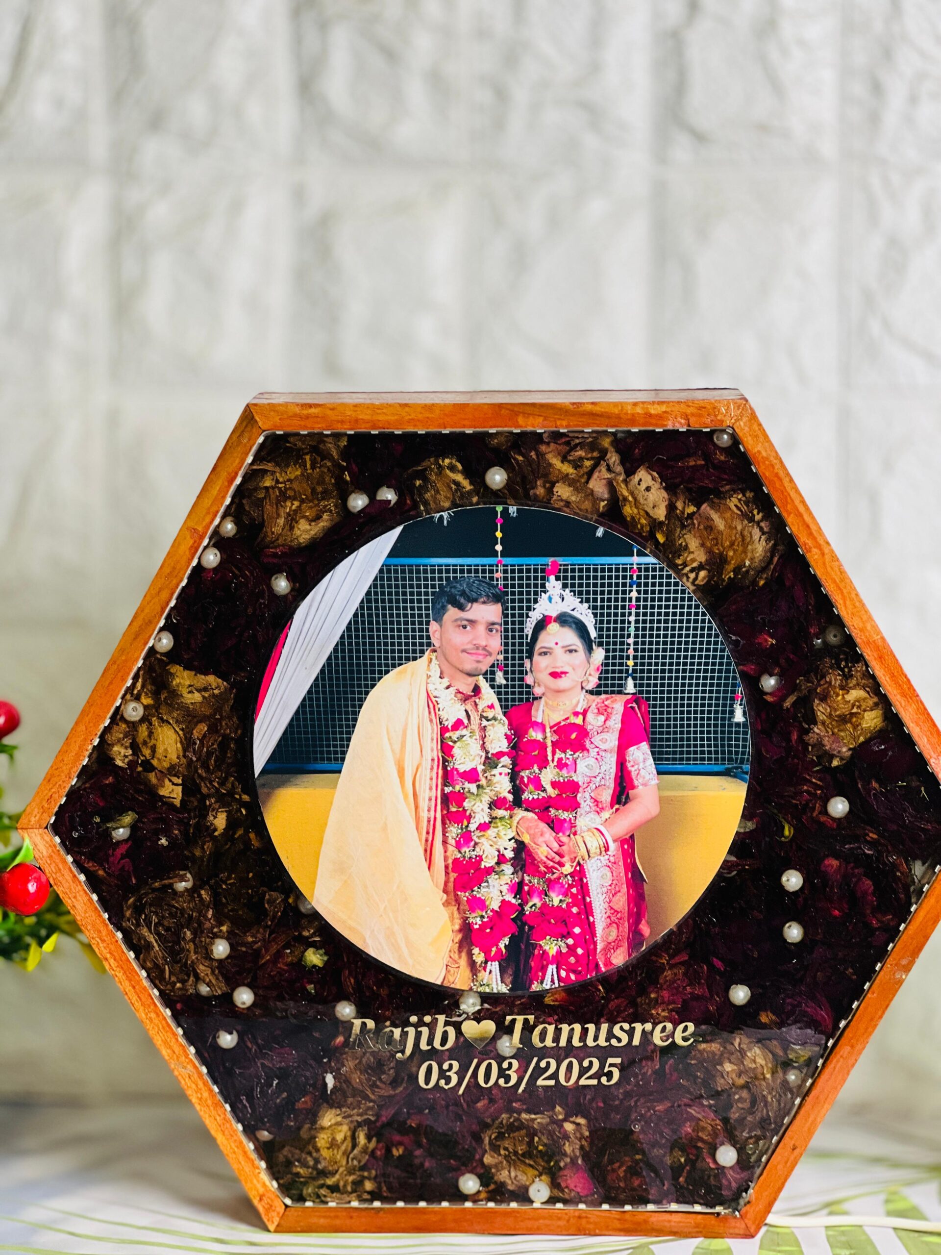 This Hexagon Resin Photo Frame is a special way to keep your wedding day close to your heart. It is filled with real varmala flowers and decorated with pearls and rose petals sealed carefully inside resin. The round couple photo is placed right in the center, making it the heart of the frame.
