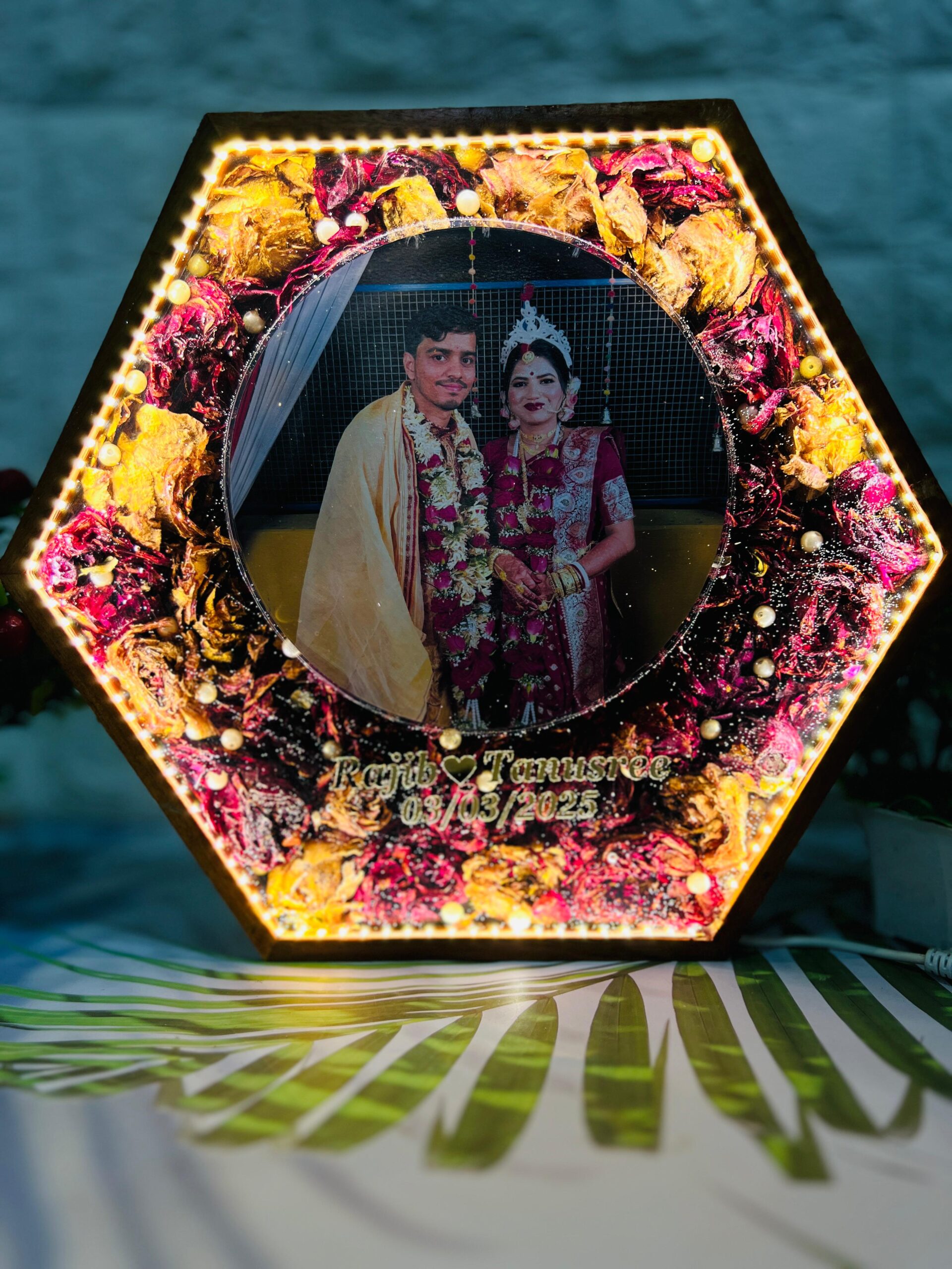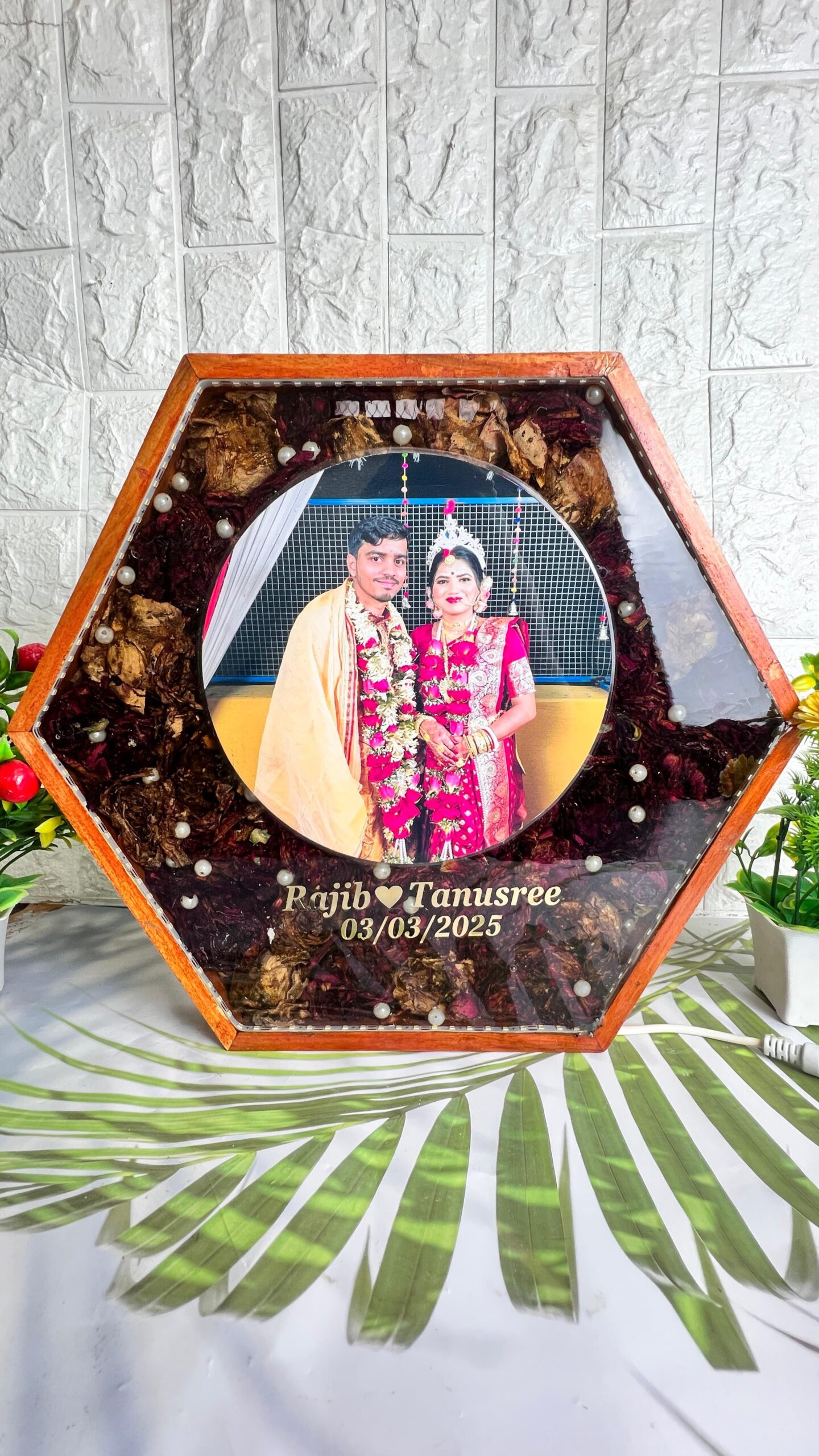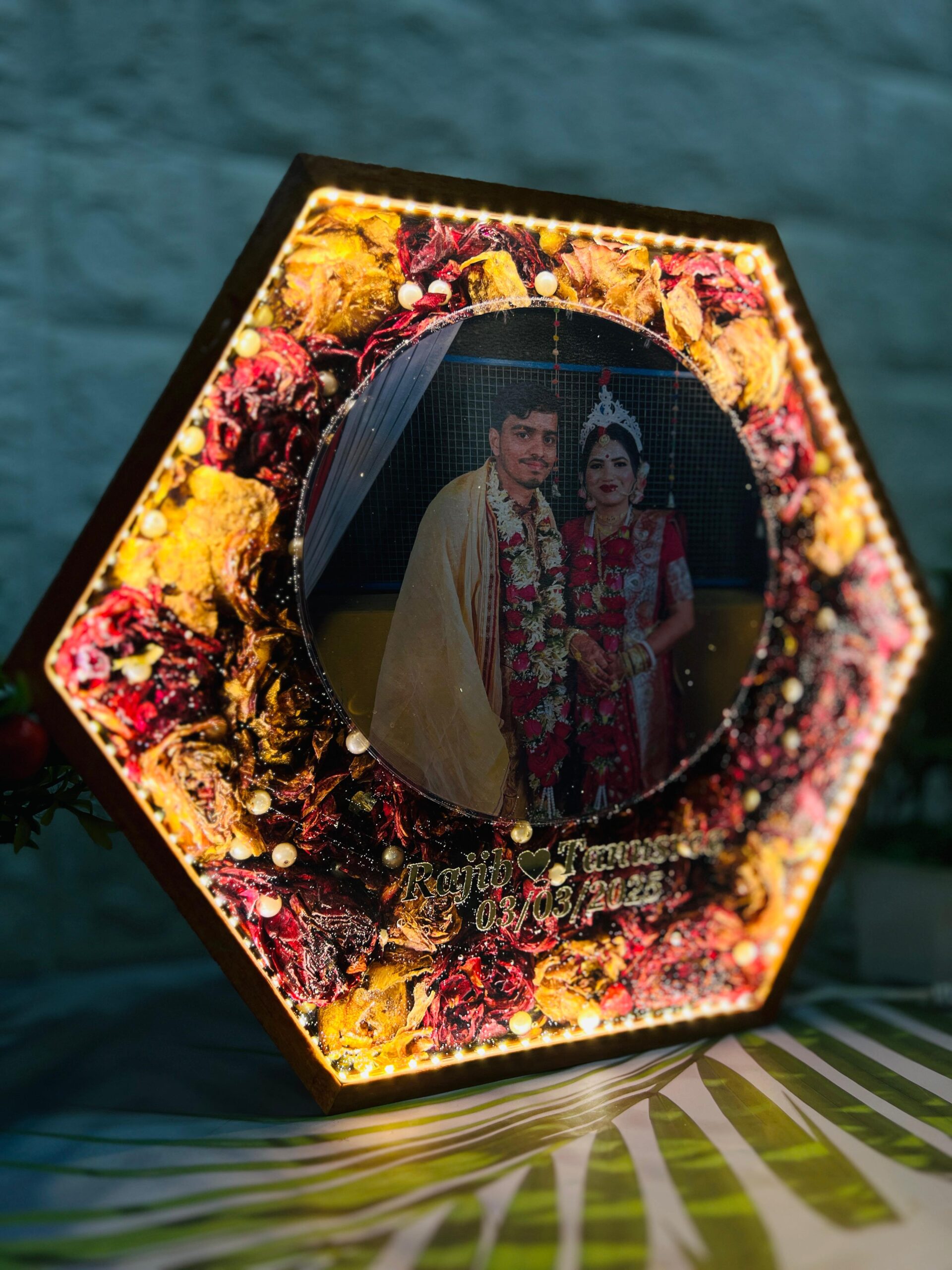 This Hexagon Resin Photo Frame is a special way to keep your wedding day close to your heart. It is filled with real varmala flowers and decorated with pearls and rose petals sealed carefully inside resin. The round couple photo is placed right in the center, making it the heart of the frame.