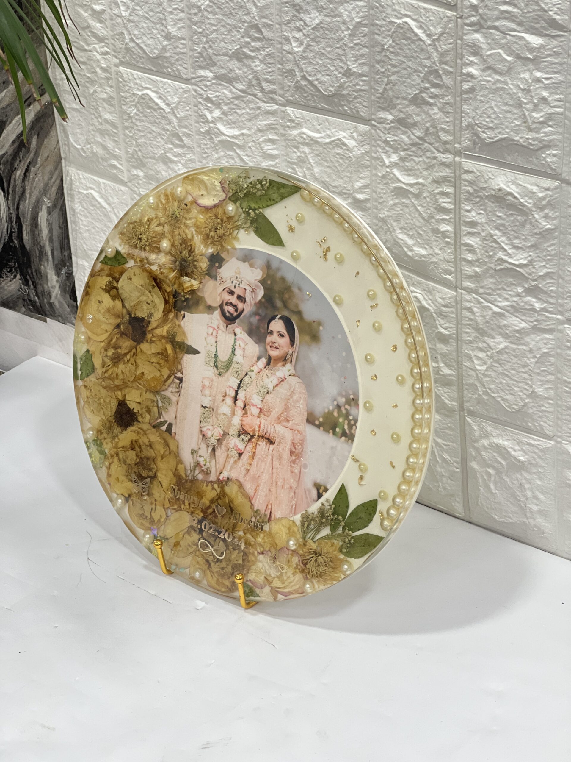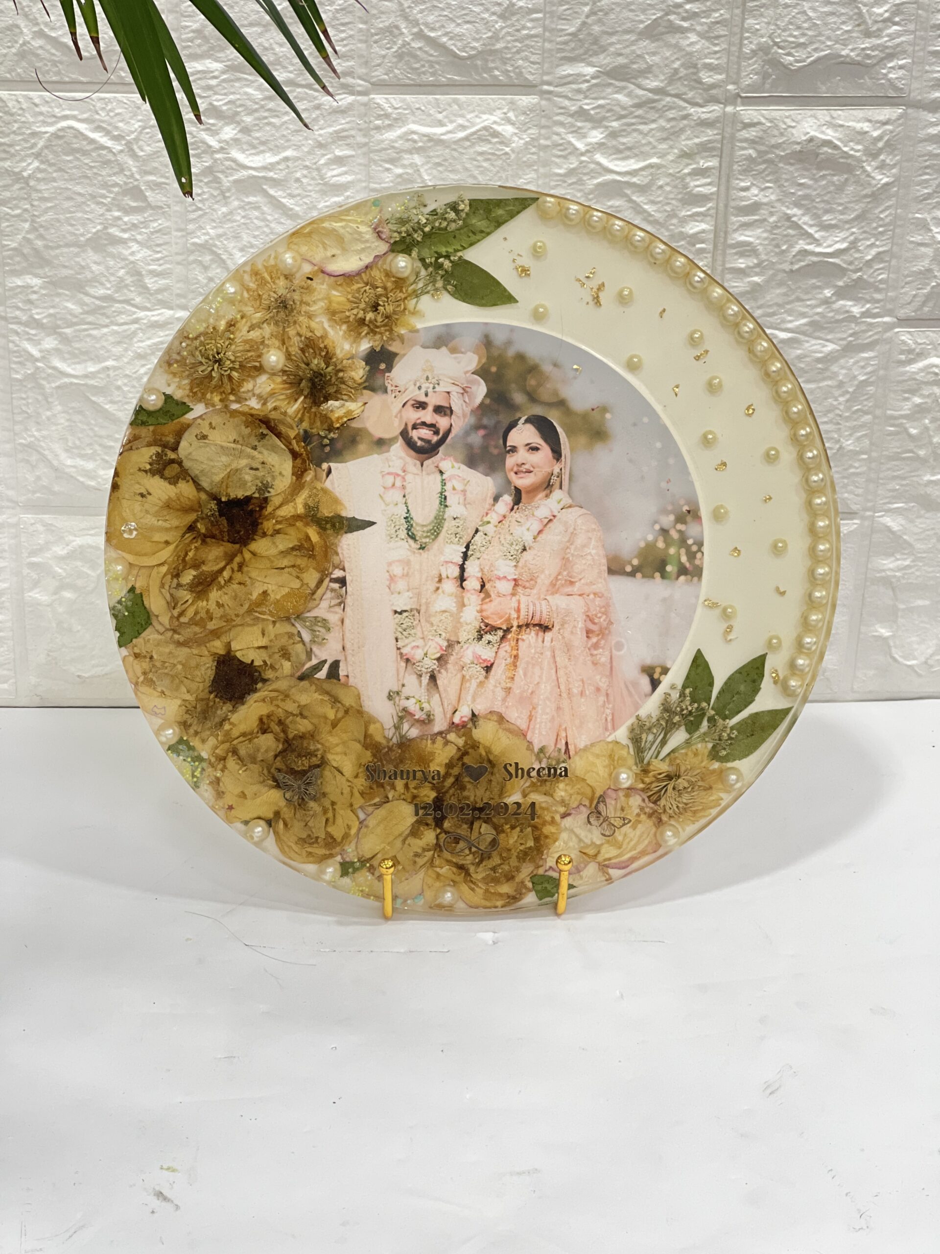 Celebrate your wedding forever with this custom (12)-inch resin plate, made using real varmala flowers and your favourite wedding photo. The plate is designed with preserved yellow roses, pearls, and dry leaves—all sealed in high-quality clear resin. Your names and wedding date are also added for a personal touch. Each plate is handmade, making every piece one of a kind and full of emotion.