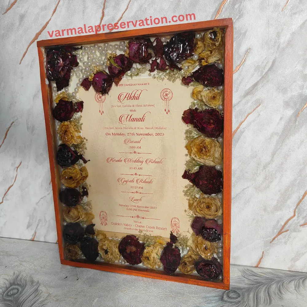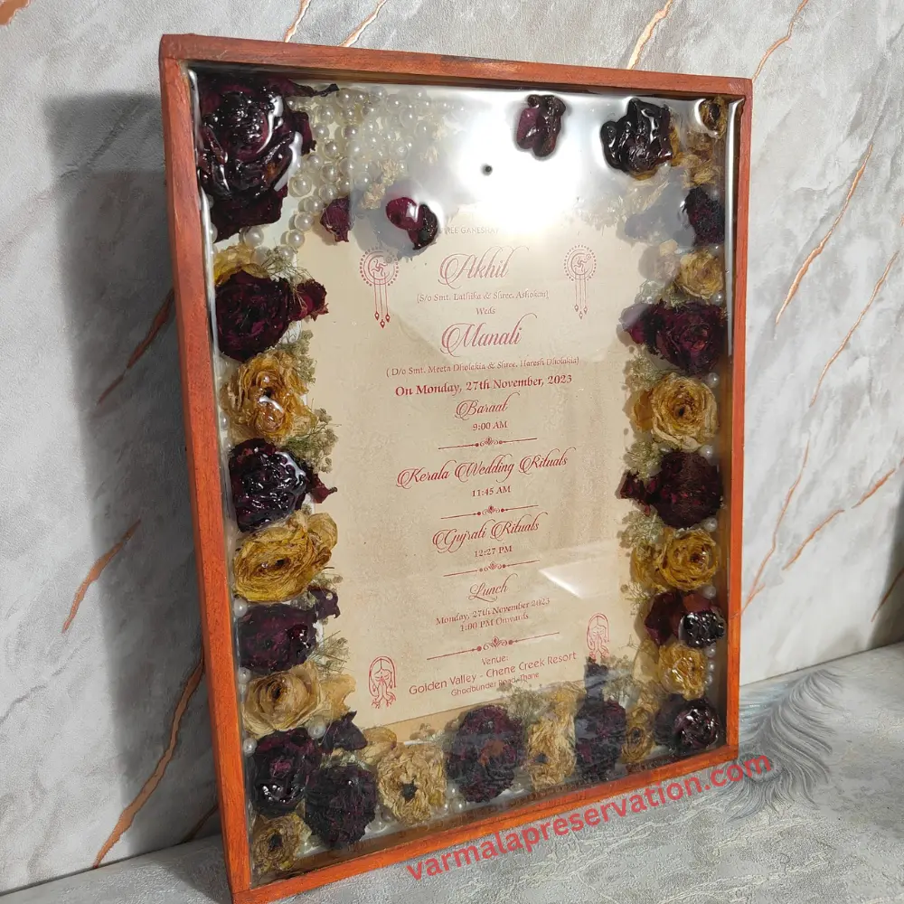 The Epoxy Resin Wedding Card & Garland Preservation in Rectangle Wooden Frame is a personalized 15x18 inch frame that preserves your wedding card, varmala, and a special couple's photo. This frame features a custom natural wooden border, offering a classic, elegant look that fits perfectly in any home.