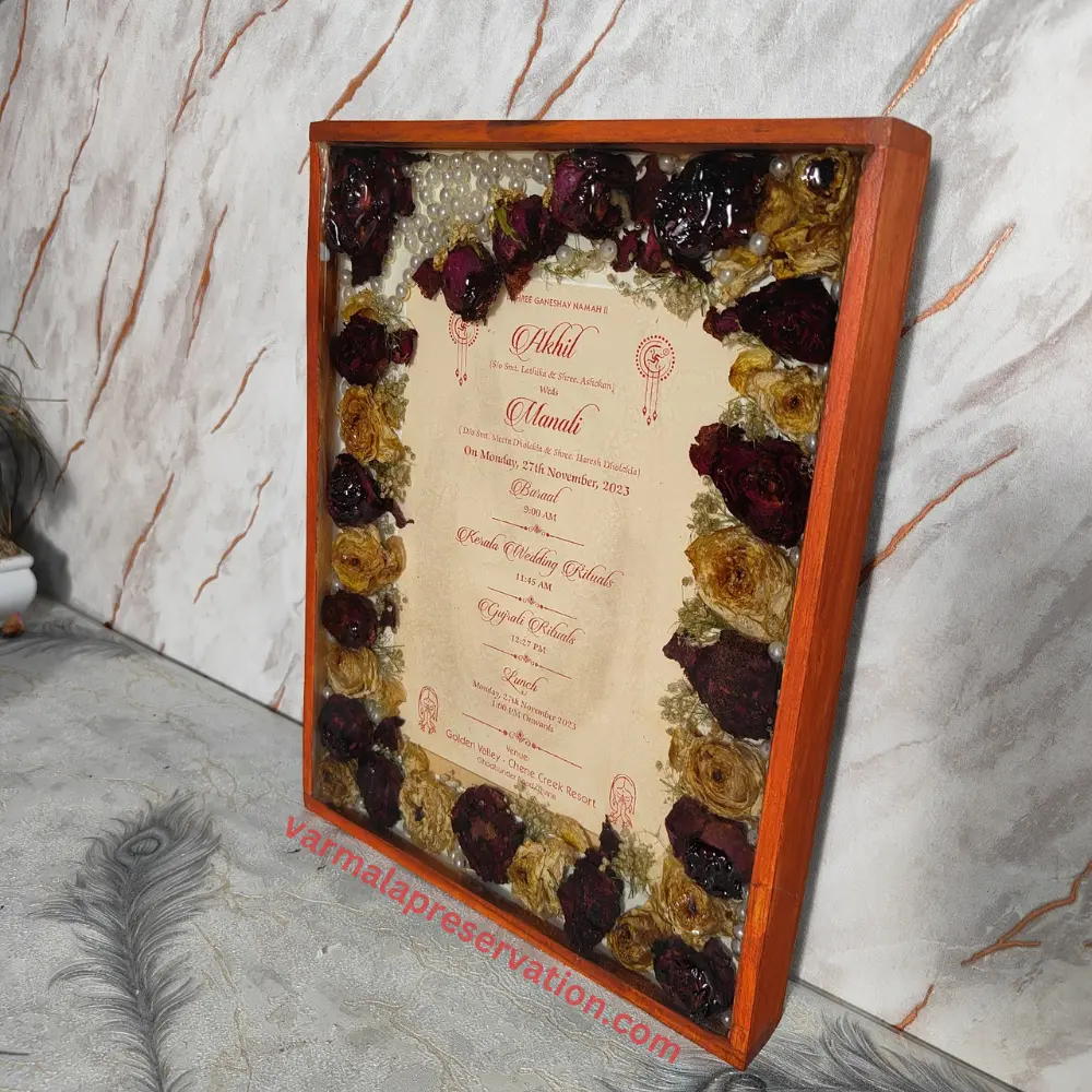 The Epoxy Resin Wedding Card & Garland Preservation in Rectangle Wooden Frame is the perfect way to preserve and showcase your most precious wedding memories. This 15x18 inch rectangular frame beautifully encapsulates your wedding card, varmala flowers, and a special couple's photo in clear epoxy resin, ensuring they stay fresh and vibrant for a lifetime. The natural wooden frame adds elegance and warmth, creating a timeless design that blends perfectly with any home decor. Personalize it with the couple's names, wedding date, or a special message, making it a one-of-a-kind keepsake. This frame isn't just a decoration; it's a piece of your love story frozen in time. You can also send us your own wedding card, varmala, or any special mementos to be preserved in this elegant frame.