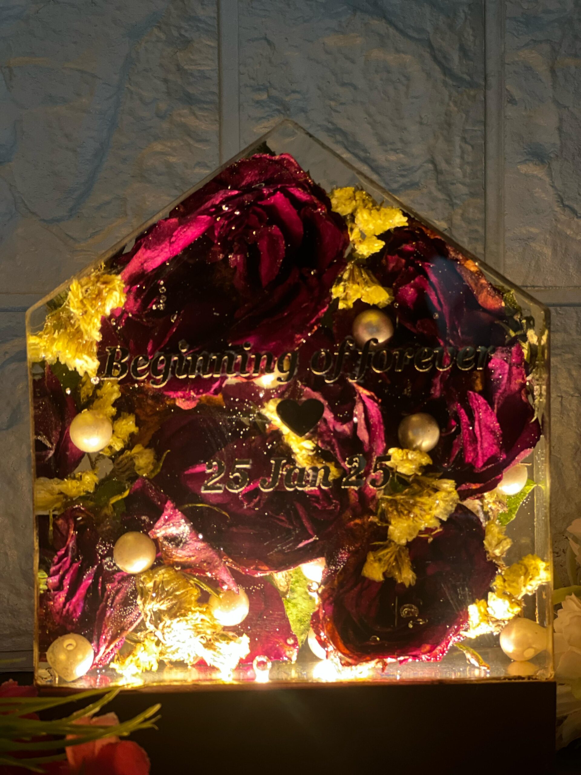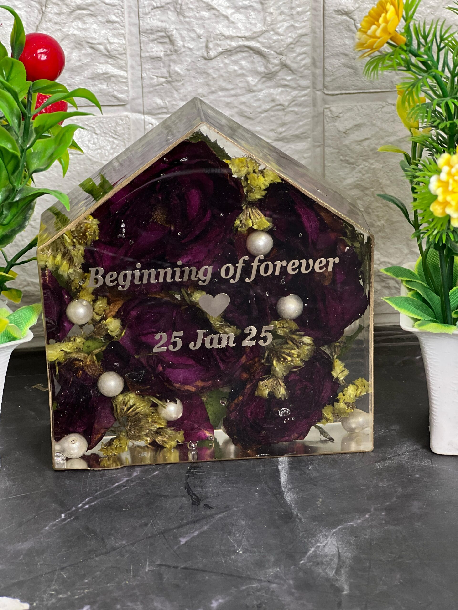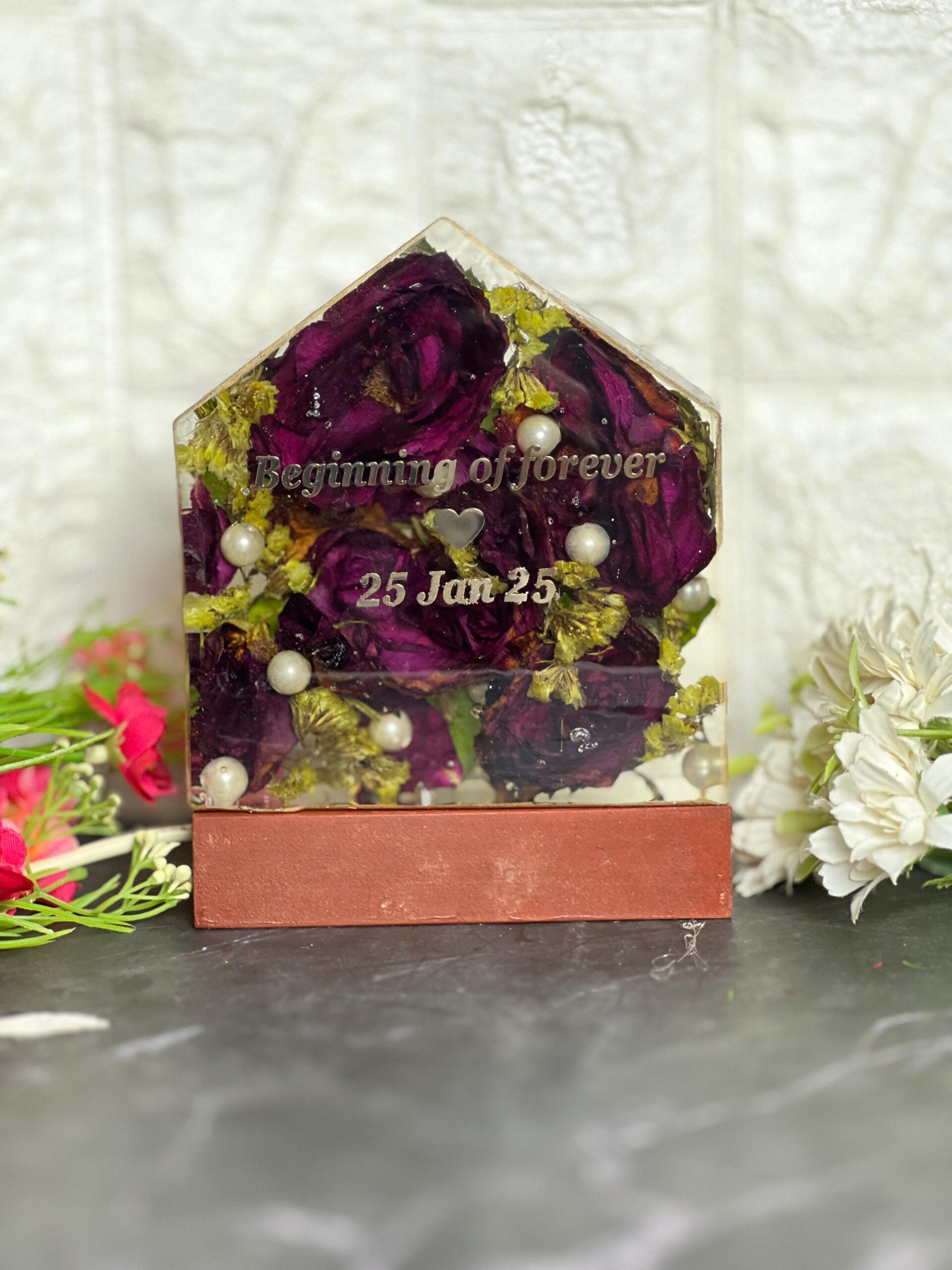 This small and cute resin piece is the perfect memory block for your special day. It holds real preserved roses and pearl beads, frozen beautifully in crystal-clear resin. The words “Beginning of forever” and your special date make it deeply personal.