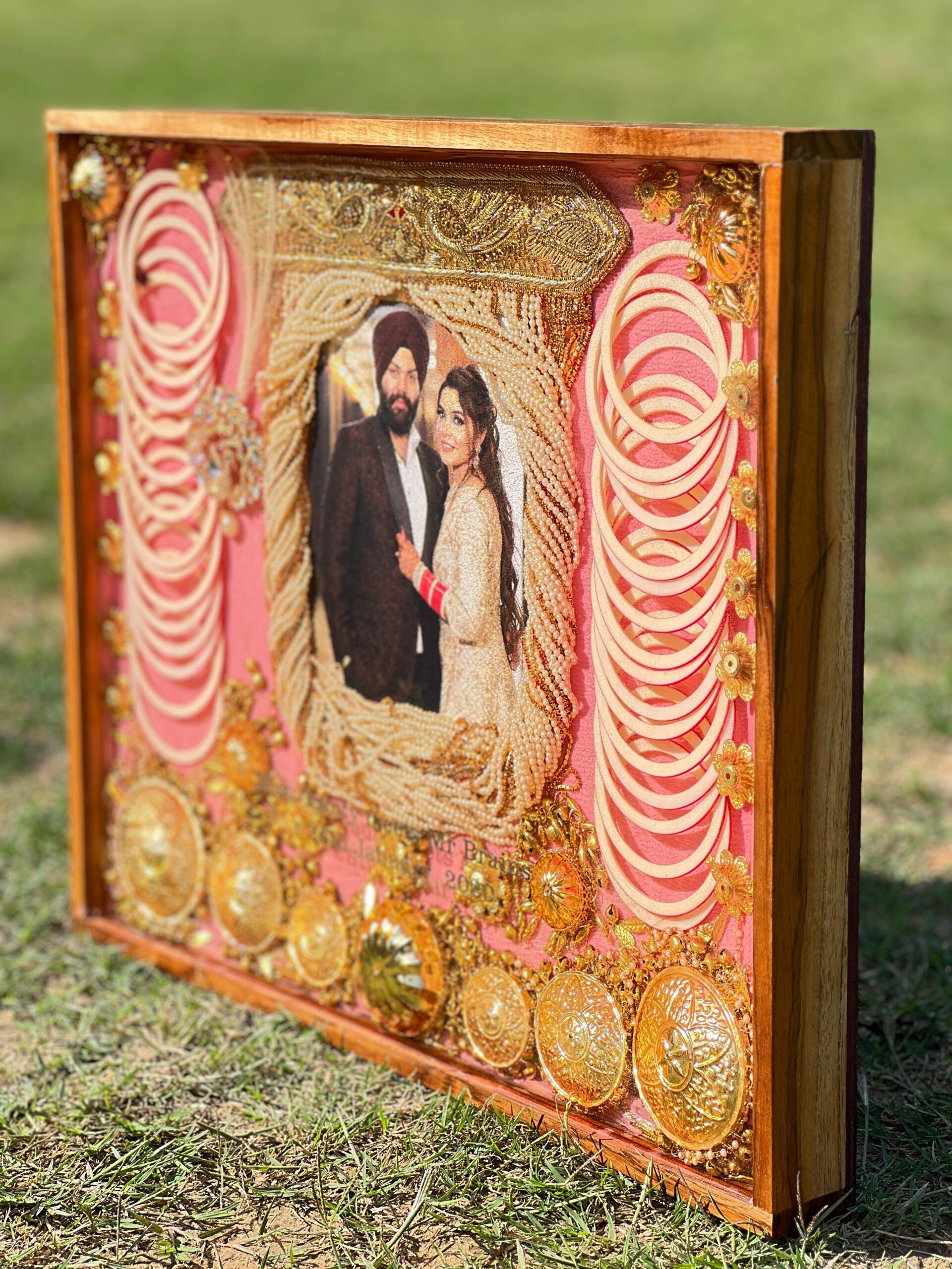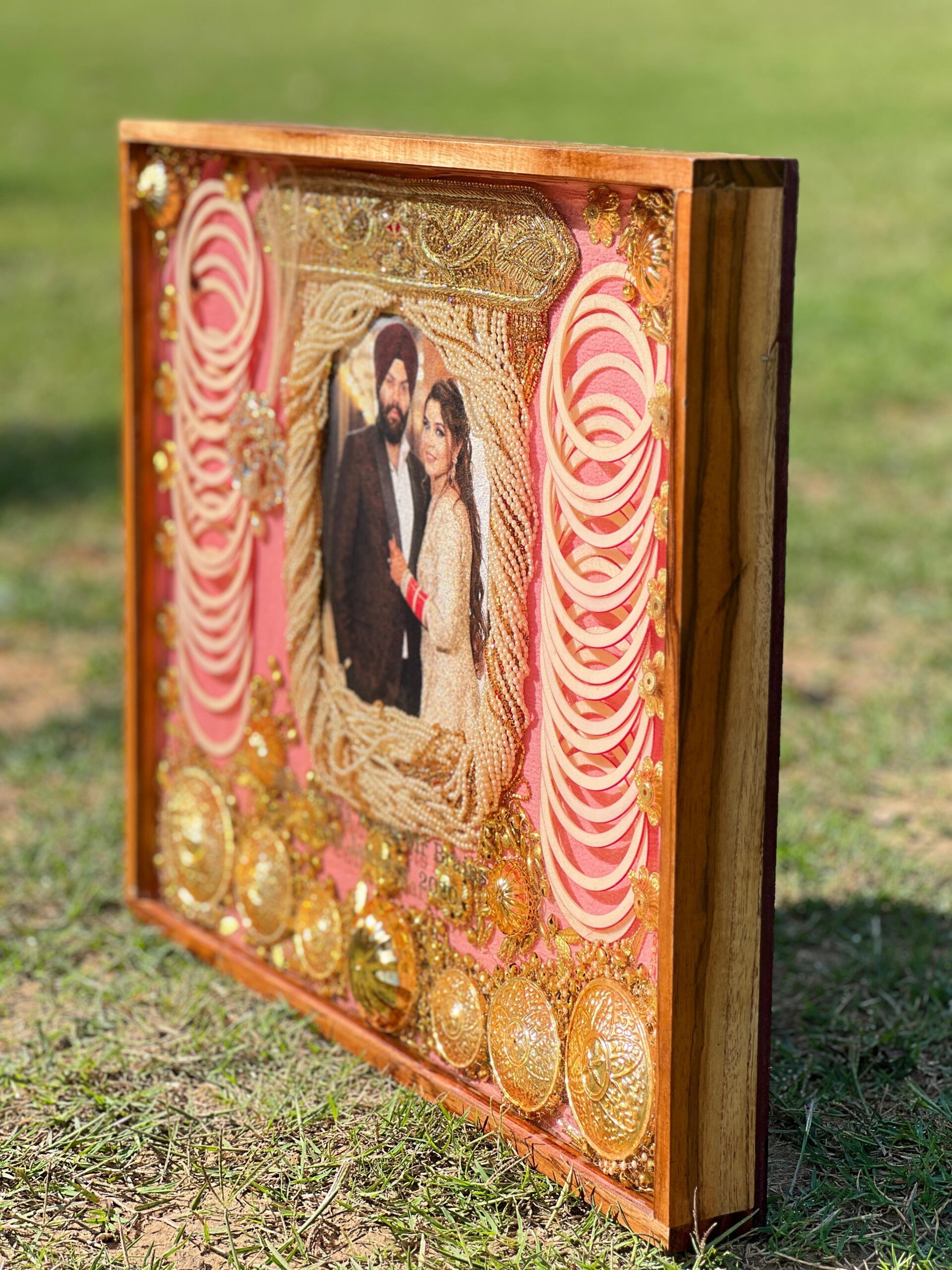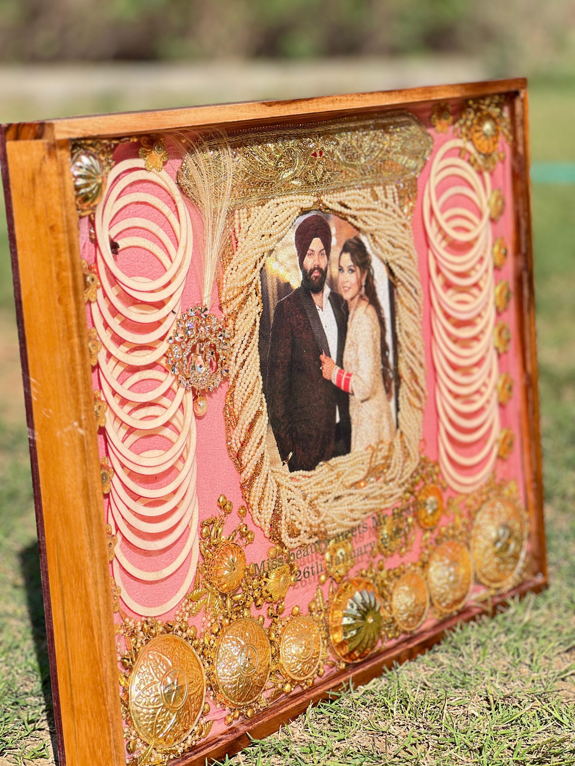 This Wedding Varmala & Memory Keepsake Frame is a special resin art piece that keeps your wedding memories safe forever. We carefully preserve your wedding photo, bangles, kaleera, and other beautiful wedding items in clear epoxy resin. It’s a custom-made frame designed just for you.