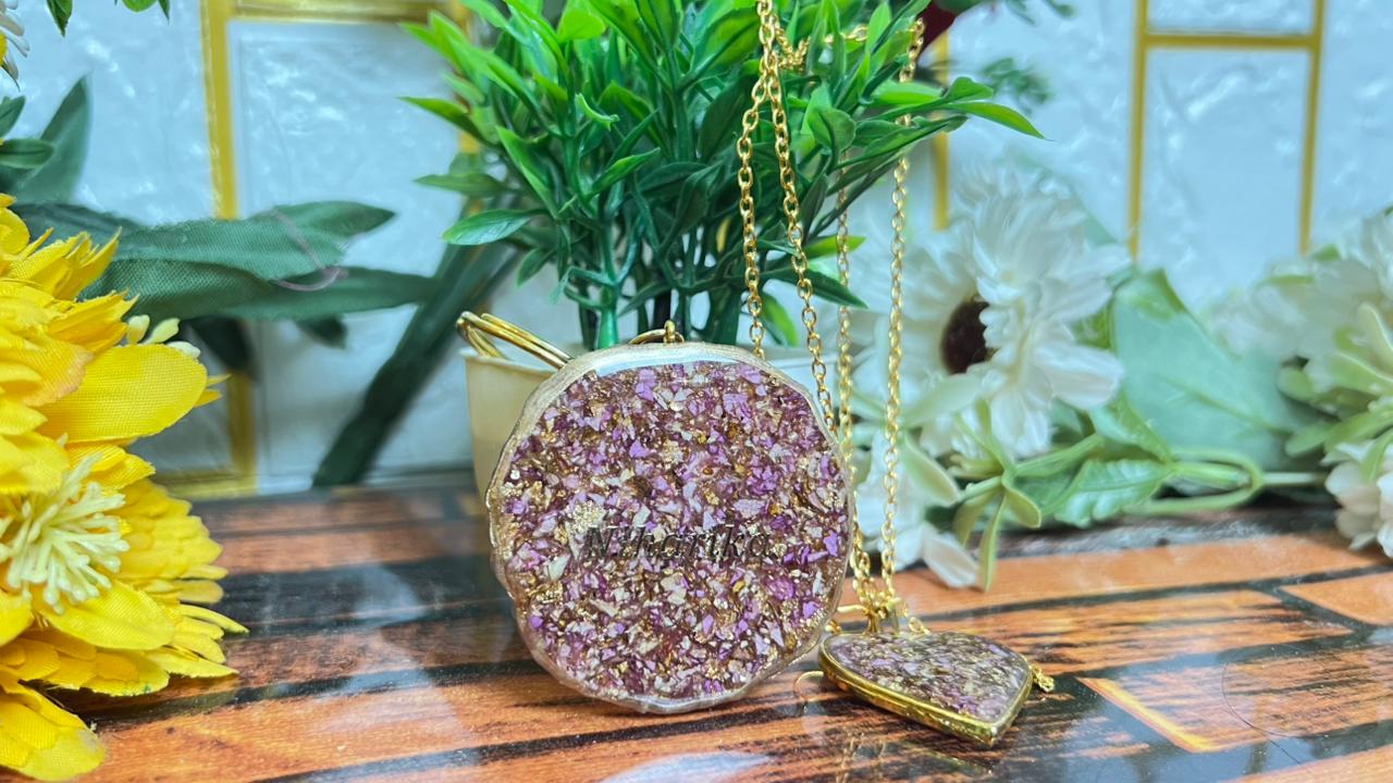 This resin jewelry set is made for people who want to hold a small part of their special day close to them. The round piece carries real dry rose petals that shine beautifully under the premium resin layer. The heart pendant also has the same flower mix, giving both pieces a matching and lovely look.