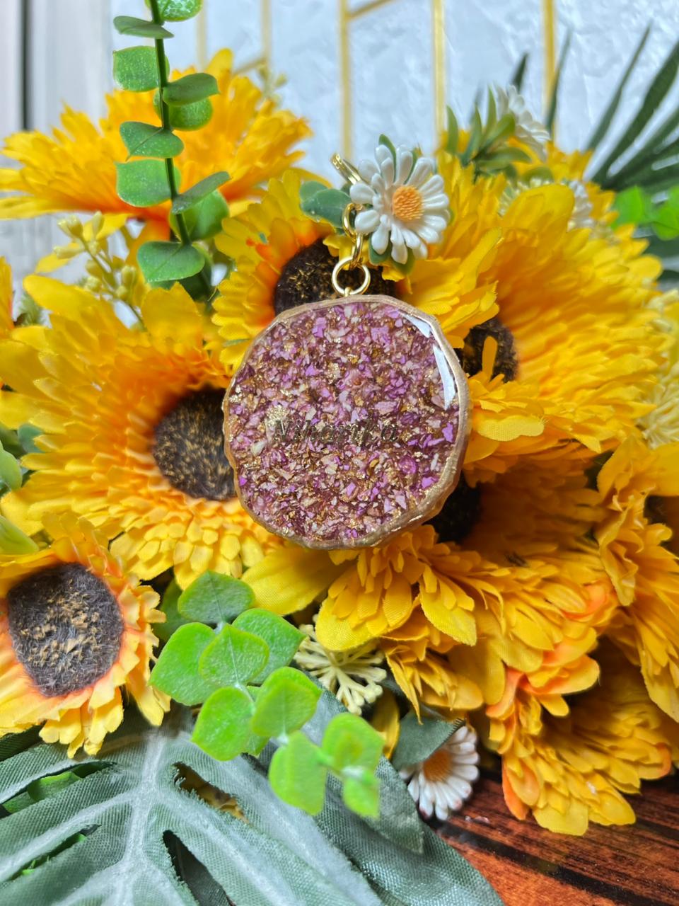 The gold border and soft pink shade make this set look warm and elegant. You can wear the pendant daily or keep the round piece on your desk, shelf, or makeup table. Both items are made with full care so the flowers stay neat, bright, and fresh-looking for many years.