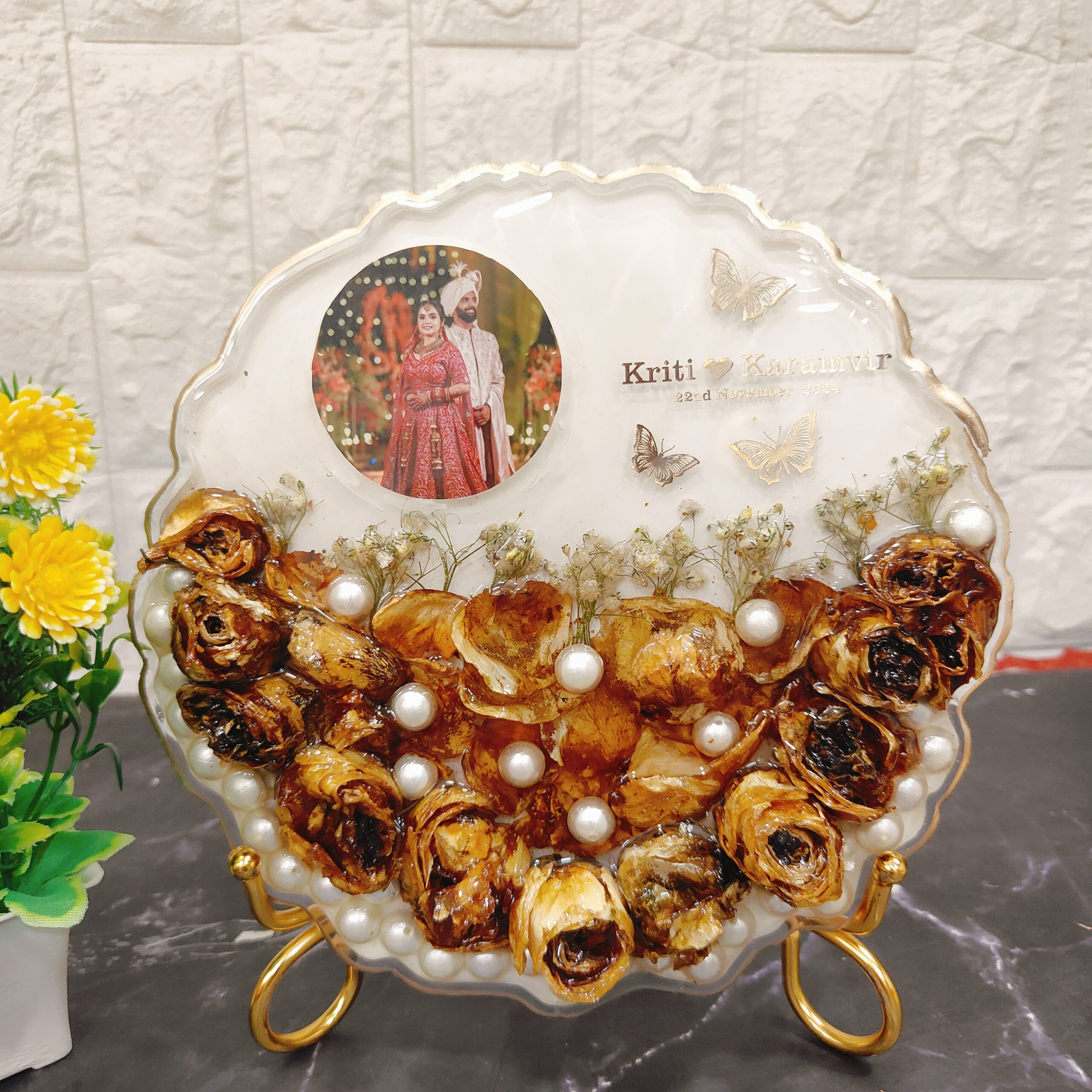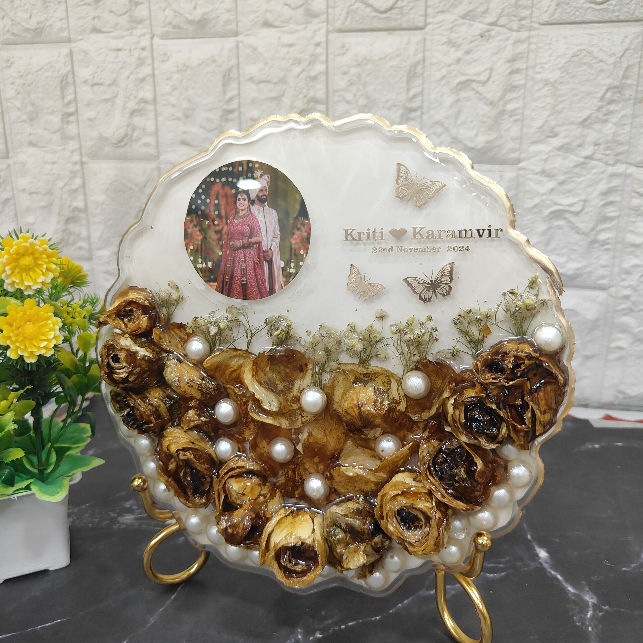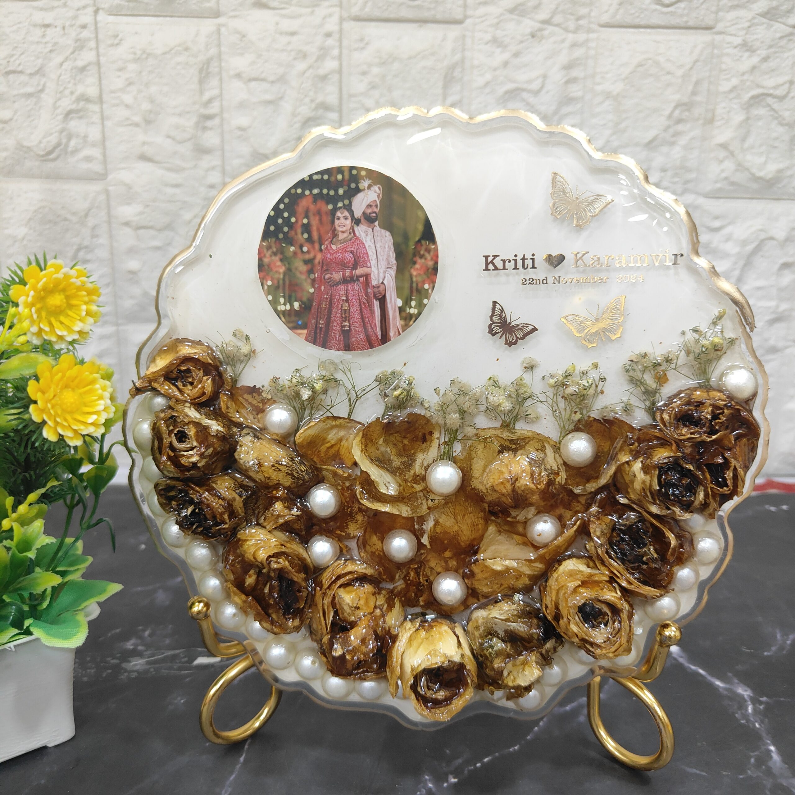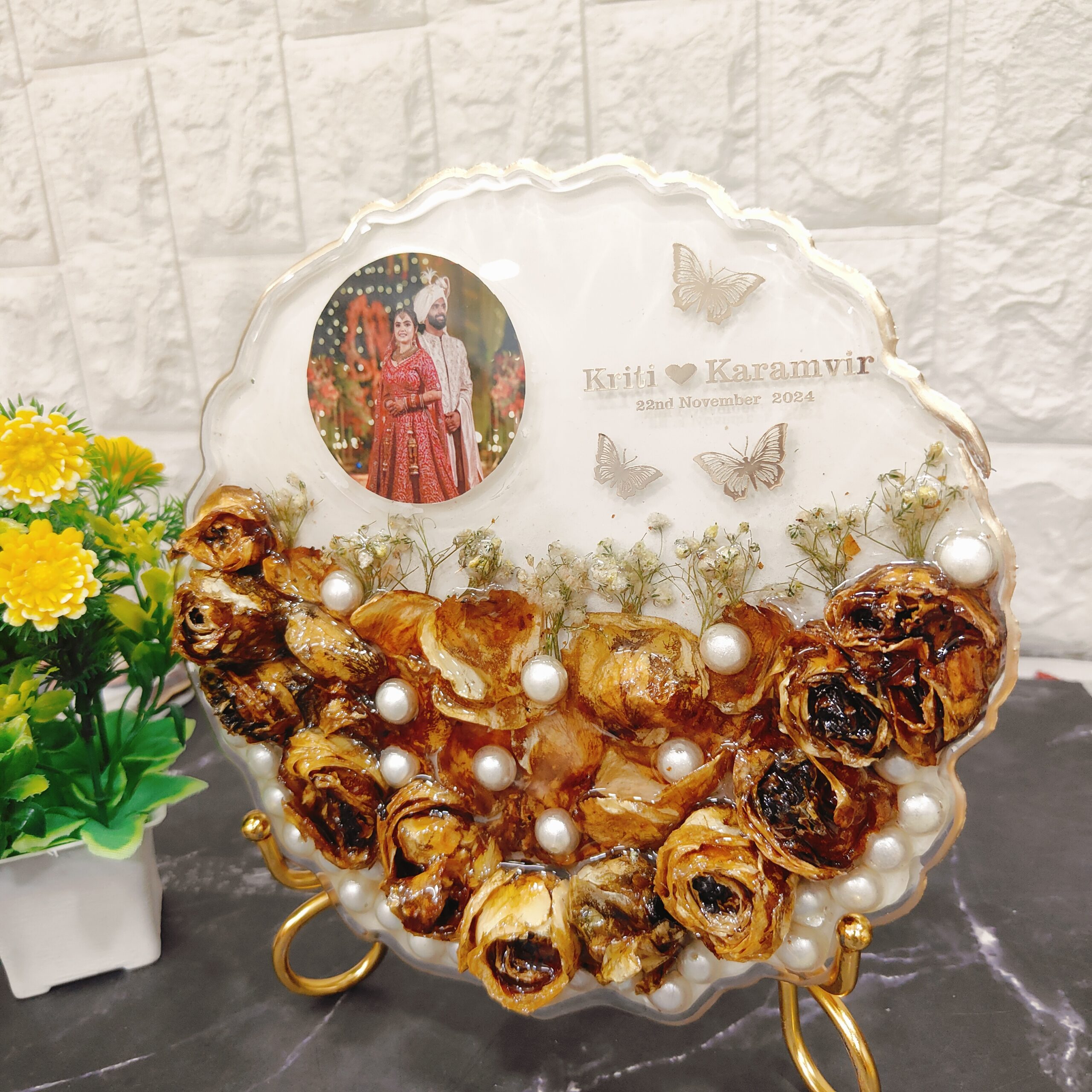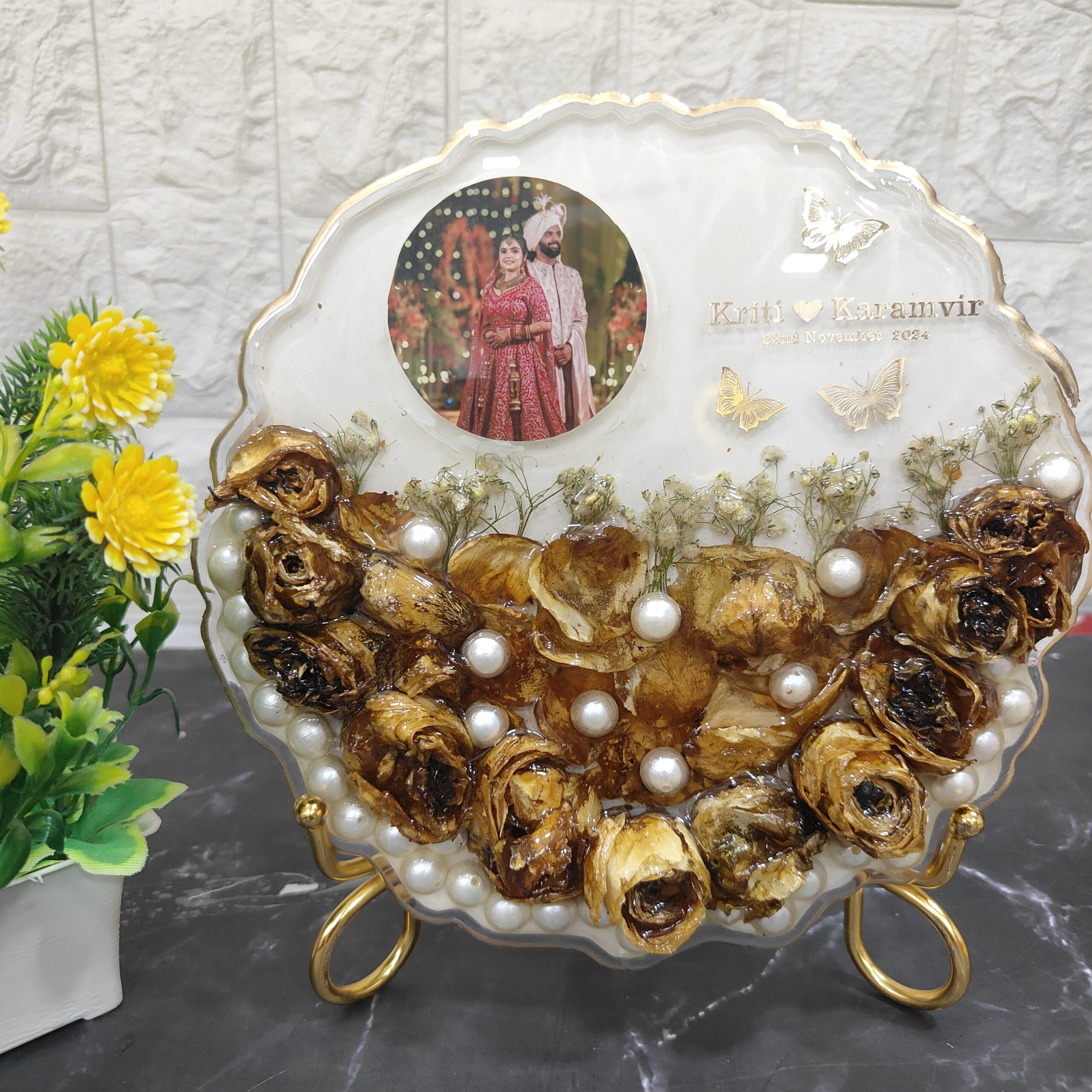 This beautiful deep-casting resin frame is designed to preserve your cherished wedding moments. It includes wedding jaimala flowers, baby's breath, and white pearls along with a wedding photo, making it a perfect keepsake. The couple's names and wedding date are also included, adding a personal touch. The frame comes with a stylish metal stand, perfect for display at home or as a gift. No matter where you are in India, we bring our varmala flower preservation service to you with home pickup and drop-off facilities. Choose any size or shape to preserve your wedding or special moments.