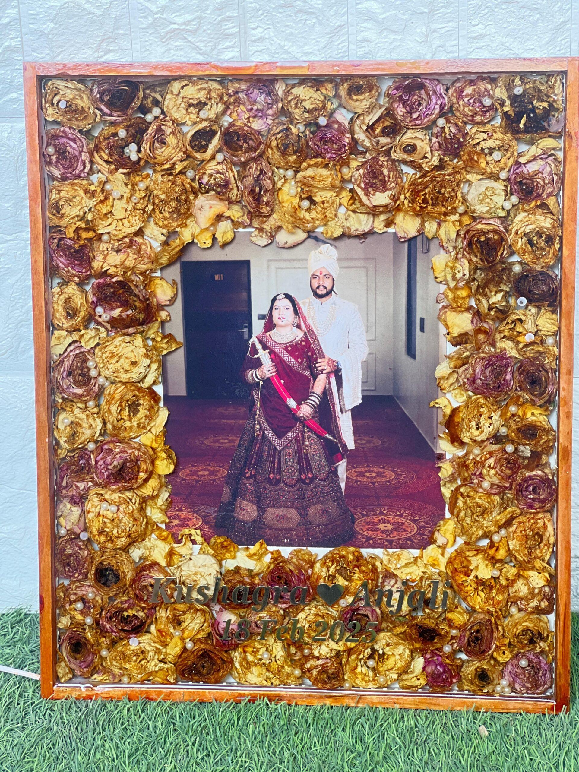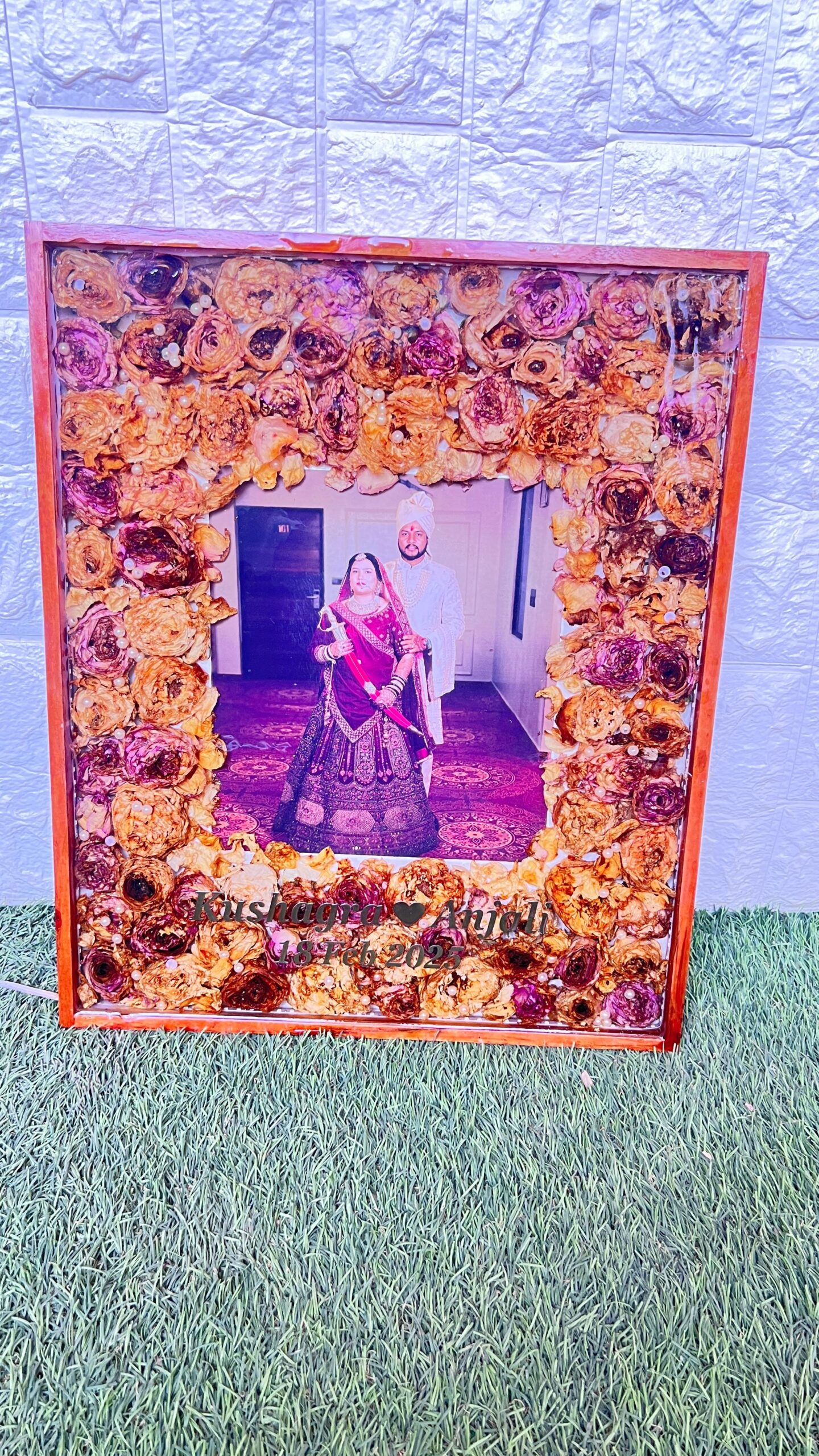 This Wedding Photo Resin Frame with Real Dried Roses is a heart-touching memory piece designed to last forever. Your most loved wedding photo is framed beautifully with dozens of real dried roses, fully preserved in glossy epoxy resin.
