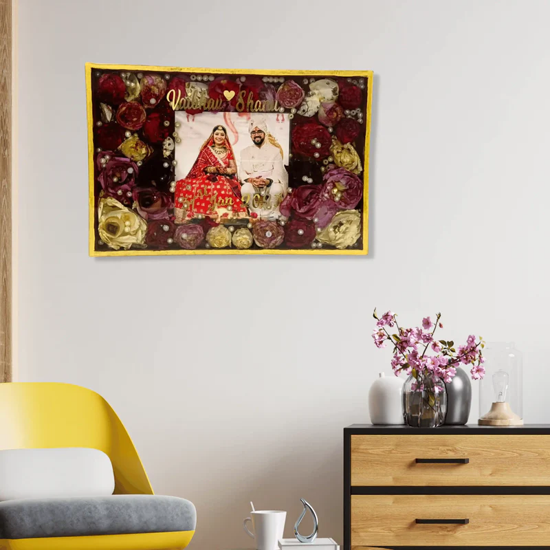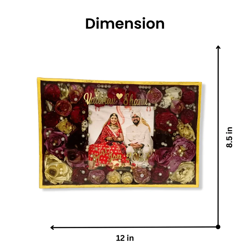 This 12x8-inch custom frame preserves your real wedding flowers inside clear epoxy resin, ensuring they stay fresh and vibrant for years. Alongside the flowers, you can include a personalized couple photo, names, wedding date, or special message, making it a truly personal and unique keepsake.