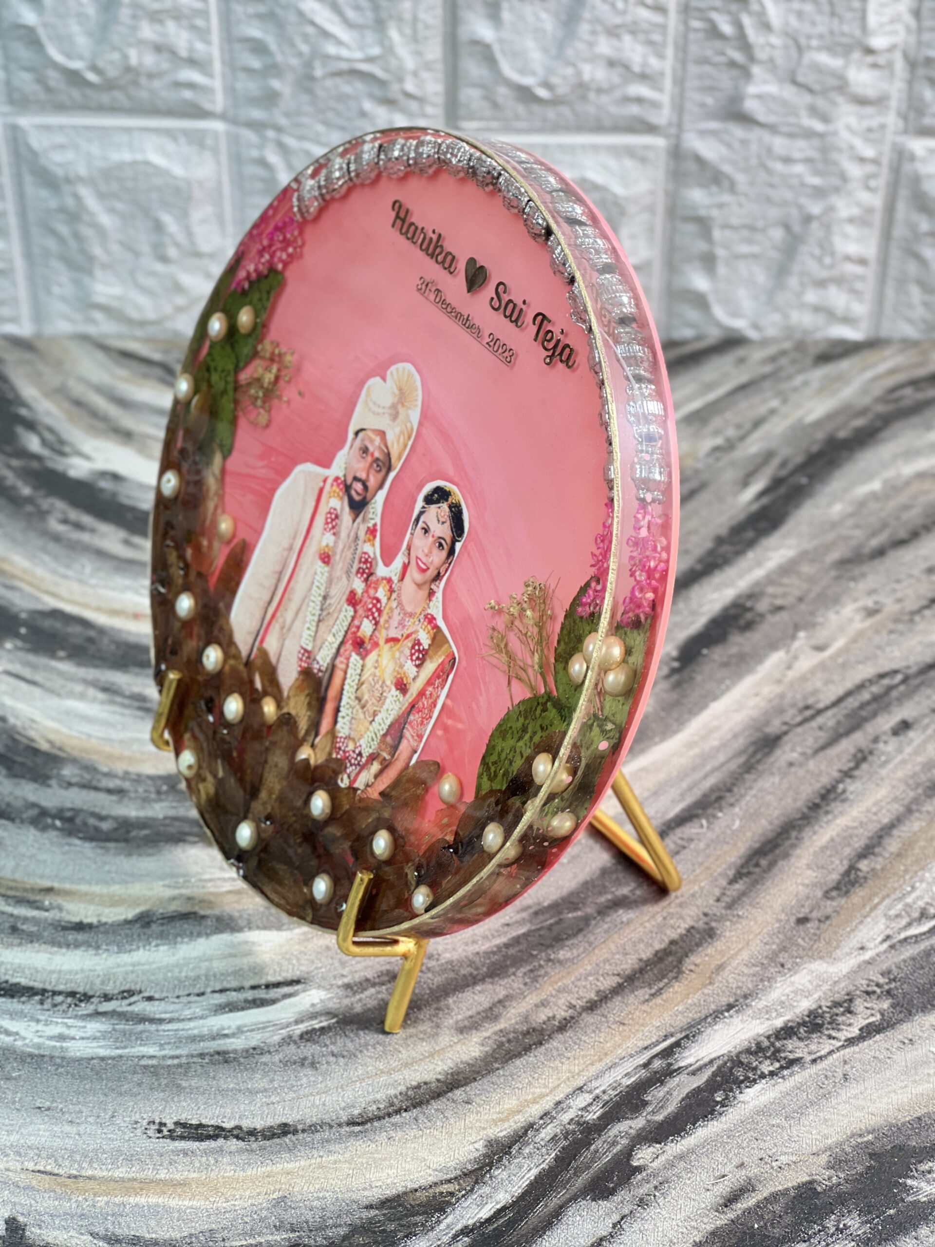 This elegant (8)-inch resin frame turns your wedding photo and varmala into a forever keepsake. It features your names, wedding date, and is decorated with original varmala parts, pearls, and golden leaves—all placed beautifully in a bright red backdrop. The plate is sealed with premium resin for a smooth, glass-like look that shines from every angle.