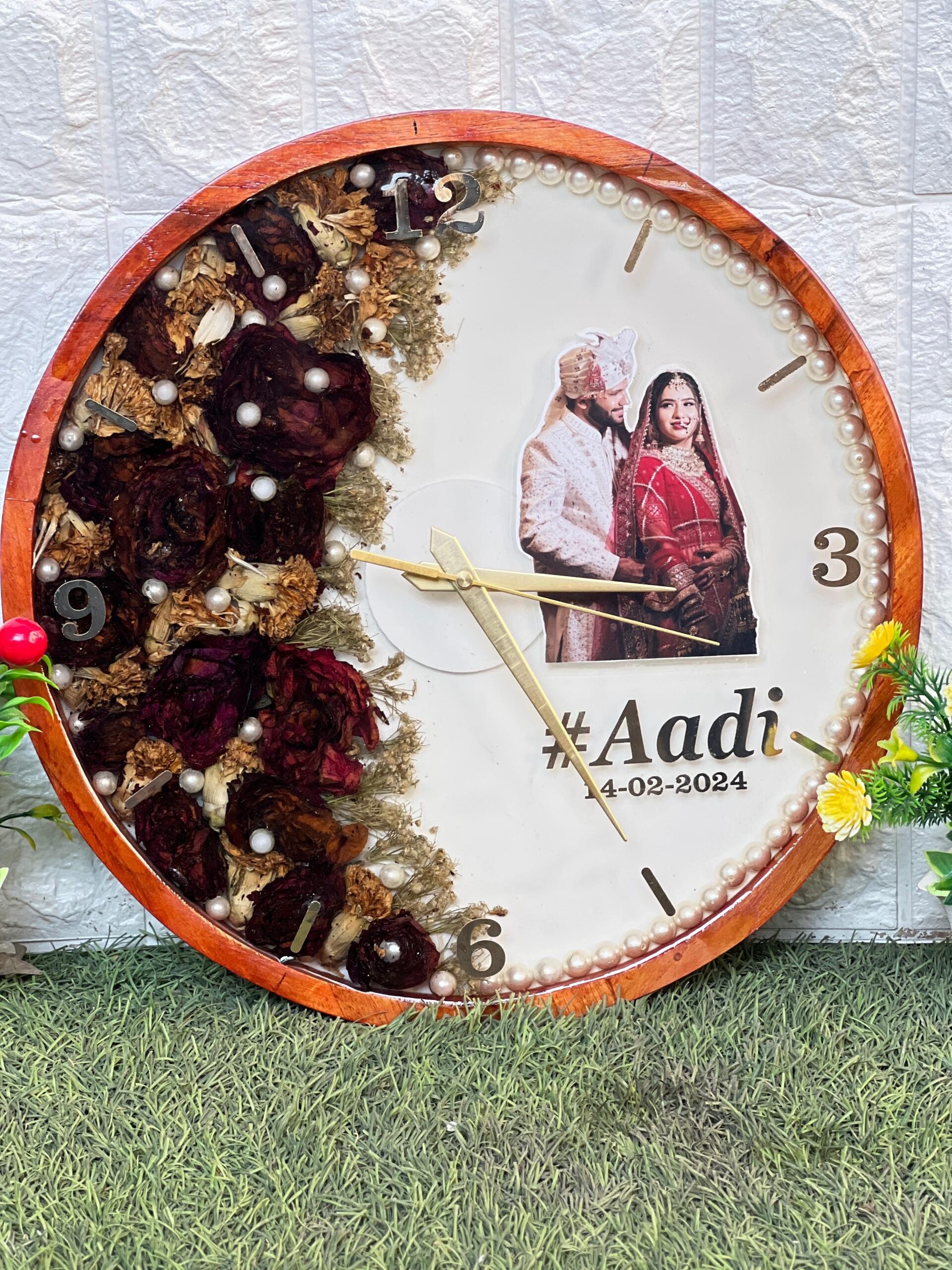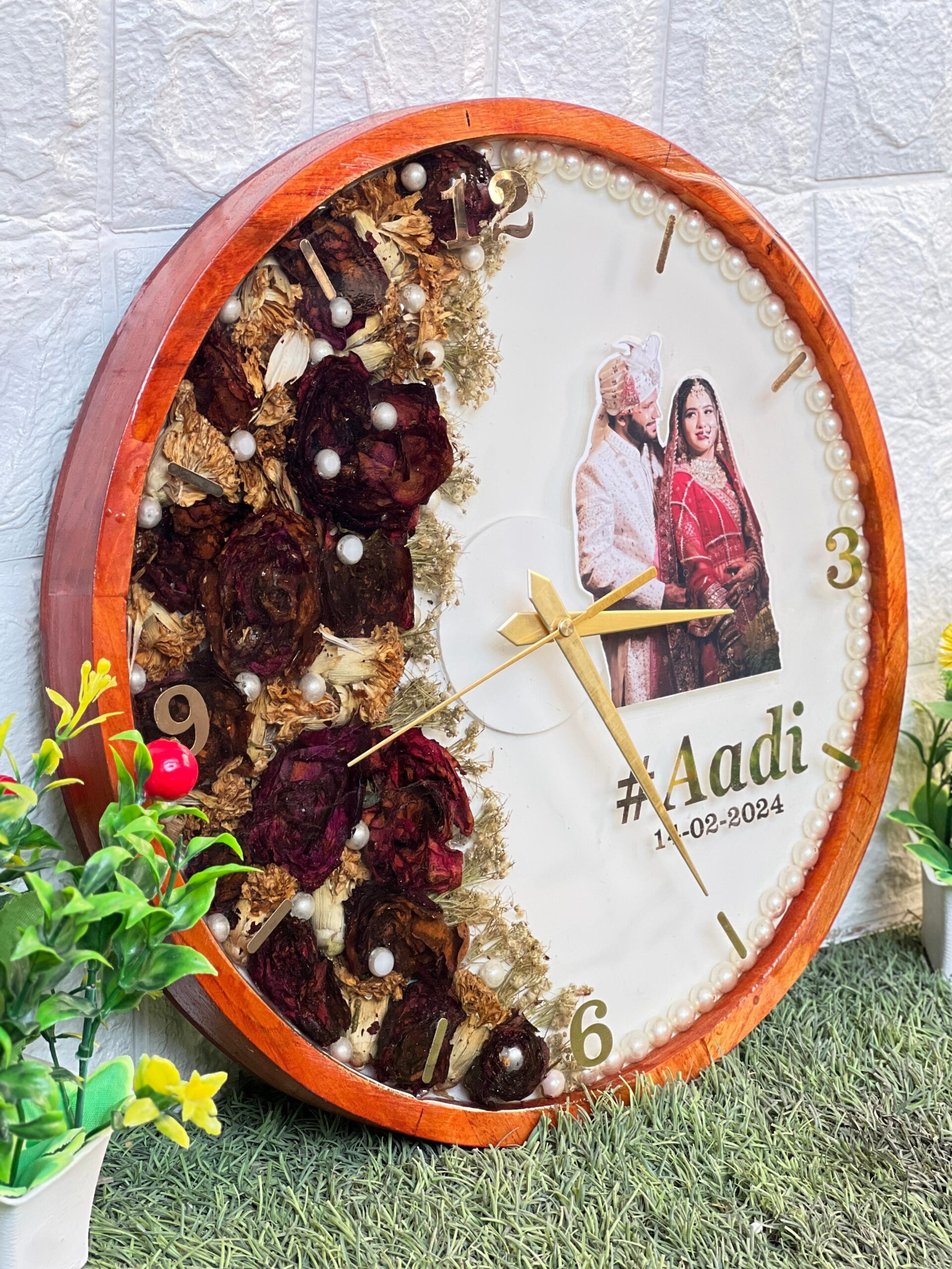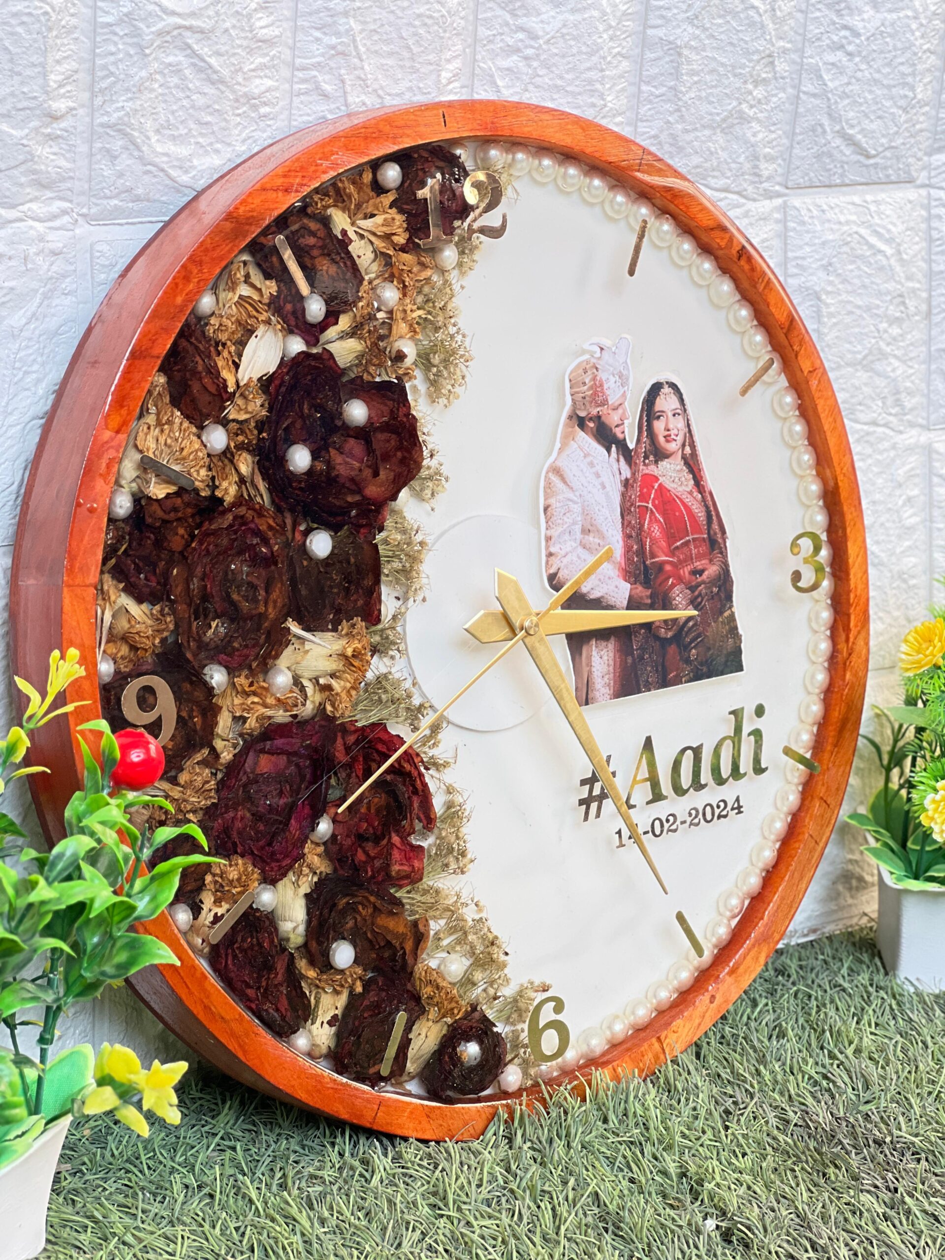 Celebrate your special day every single day with this custom-made wedding wall clock. Designed in a ( )-inch round shape, this clock beautifully mixes your real wedding varmala flowers with a picture of the couple, their wedding hashtag, and date.