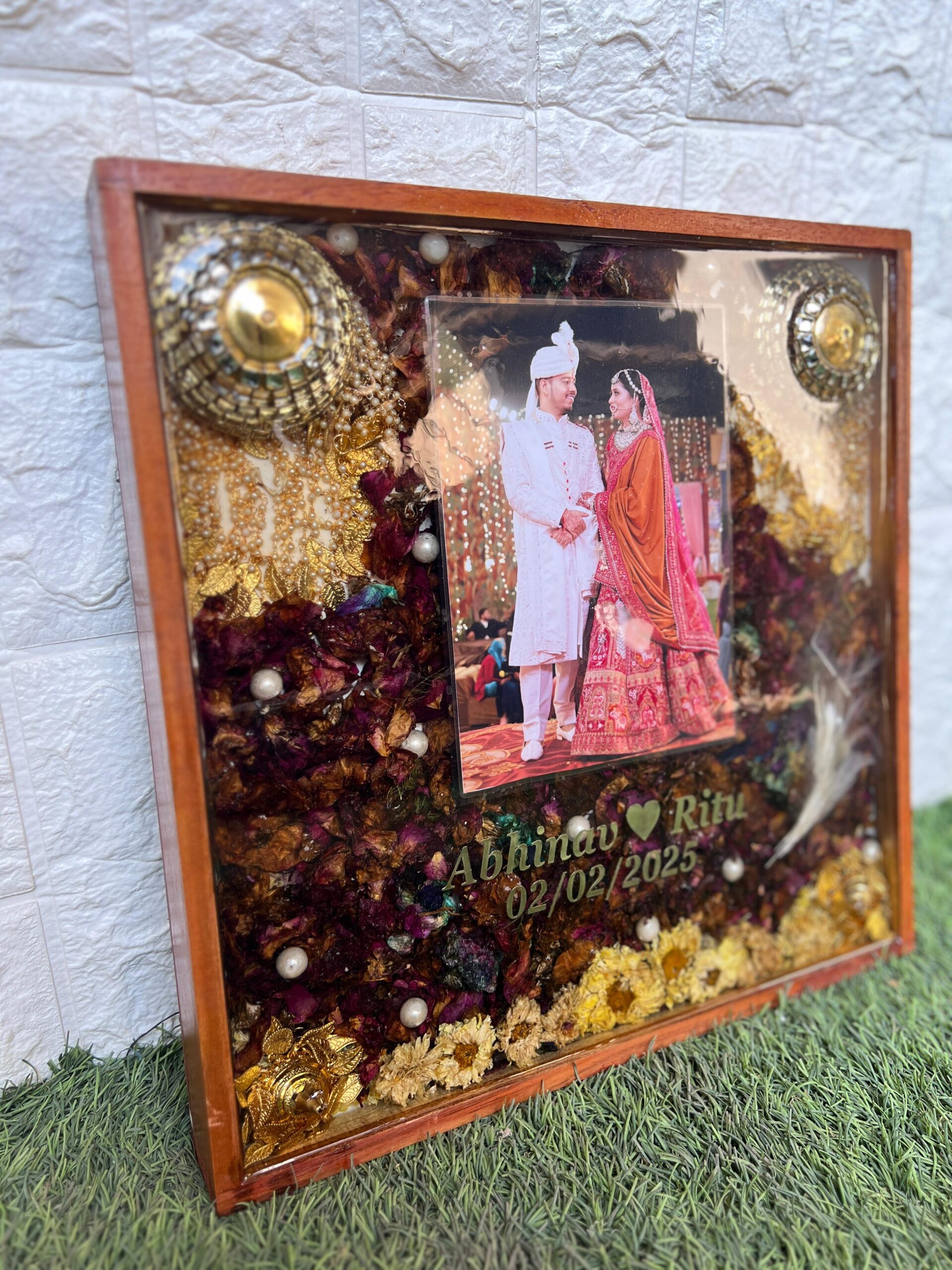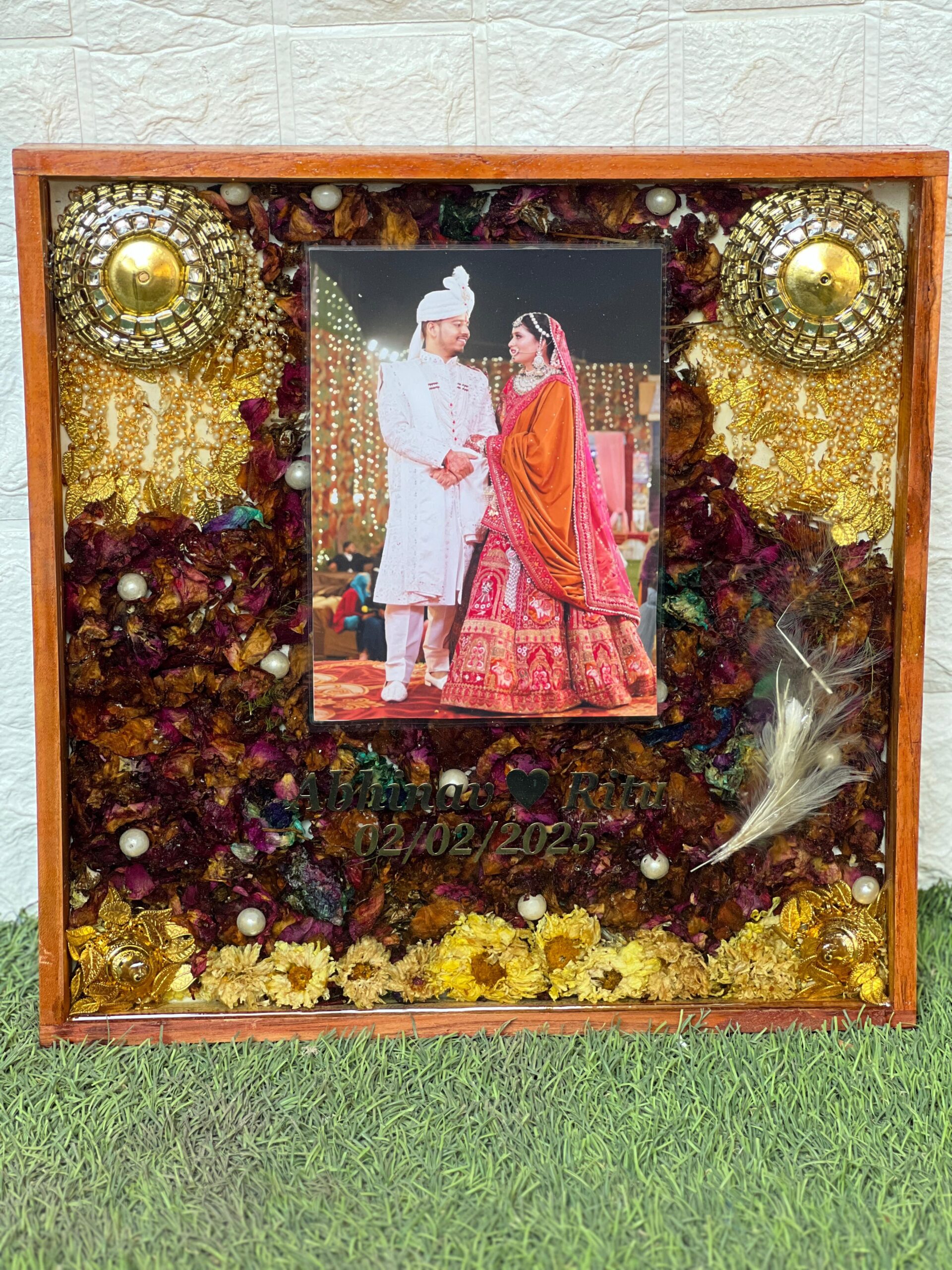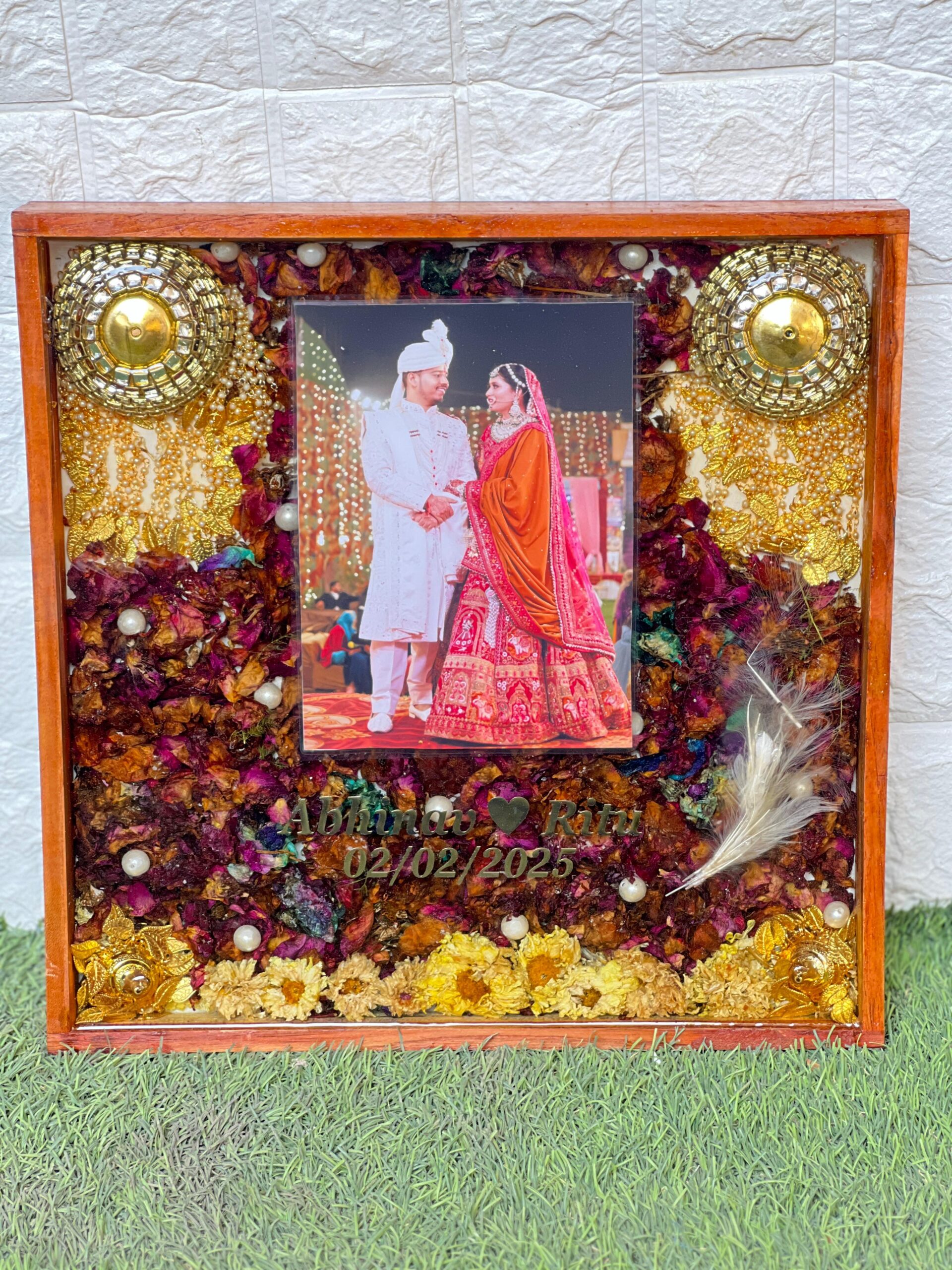 This Wedding Varmala Memory Resin Frame with a wooden border is made to preserve your wedding day forever. The rectangular frame features your wedding photo, surrounded by your actual varmala, dry rose petals, yellow flowers, pearls, and gold beads. Two kaleeras on the top corners add a royal touch to the frame.